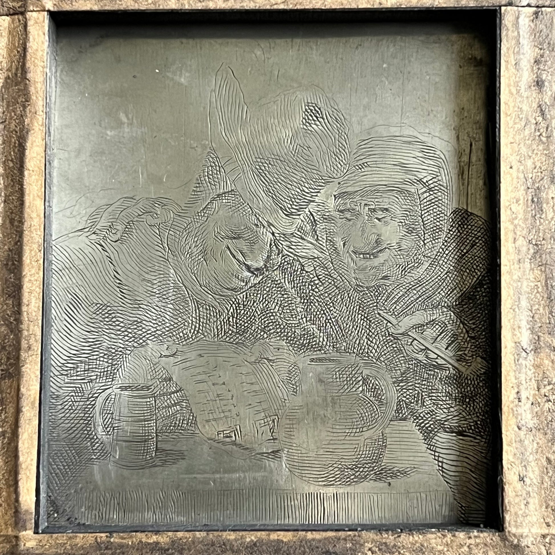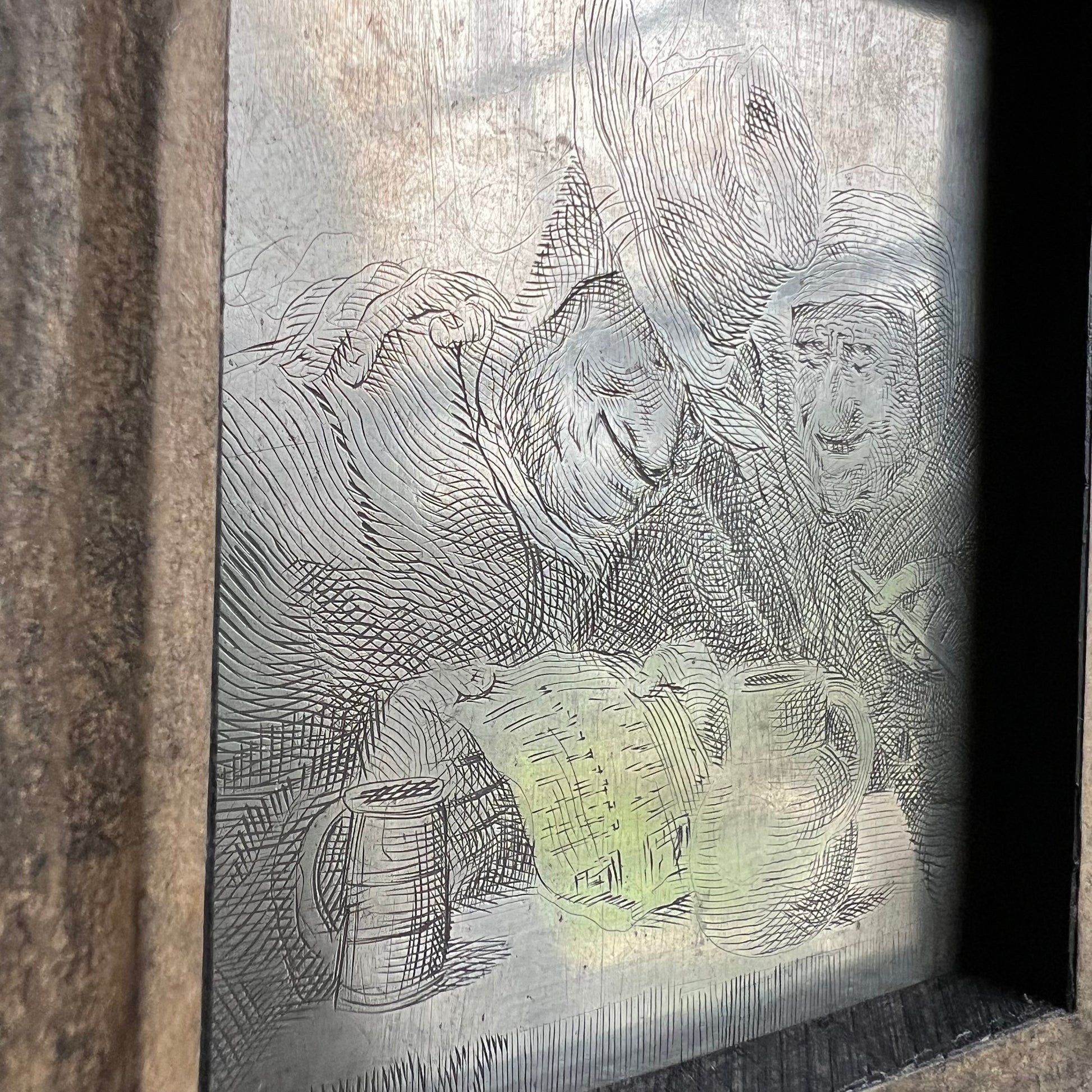 To the back, within an etching, we see a couple in a tavern, seated at a table with a wine pitcher and tankard as they pour over a document.