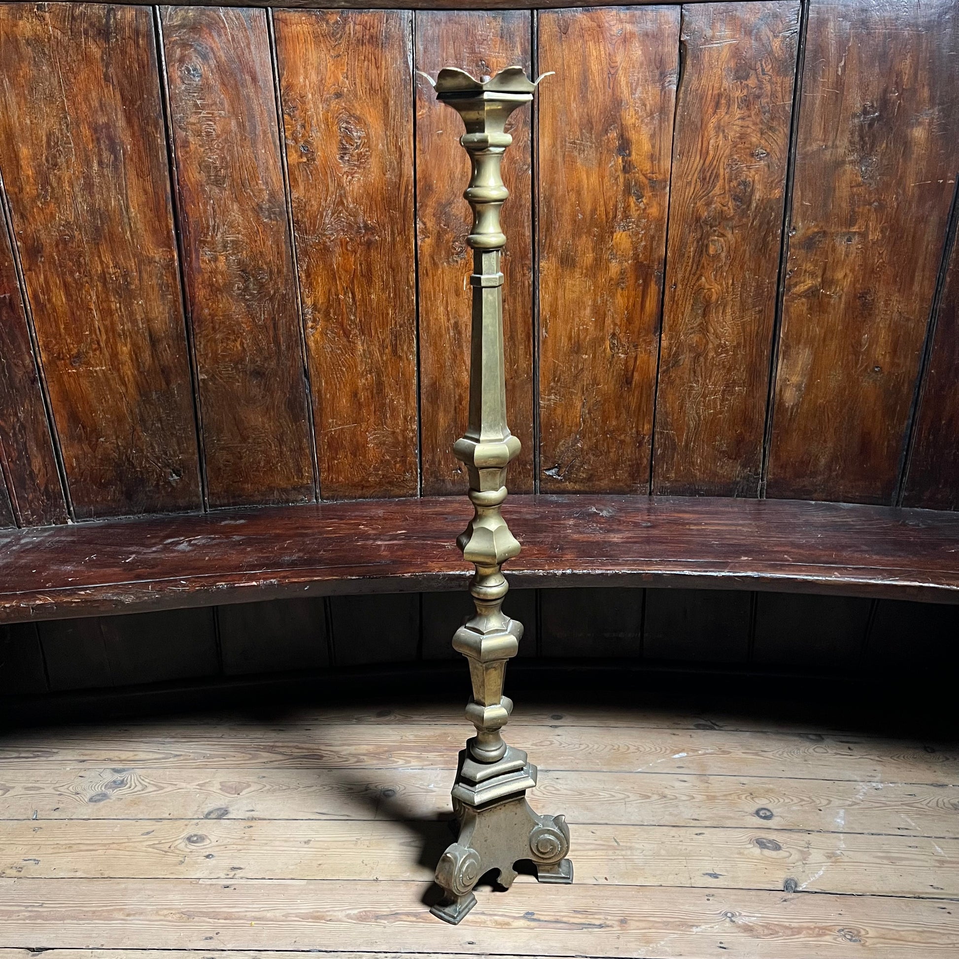 Commanding scale rising to 117 cm, its sculptural form has a petalled drip-pan above a boldly turned and faceted shaft, raised on an elegant triform base with scrolling feet. The silhouette has a strong architectural quality, characteristic of Baroque church metalwork.