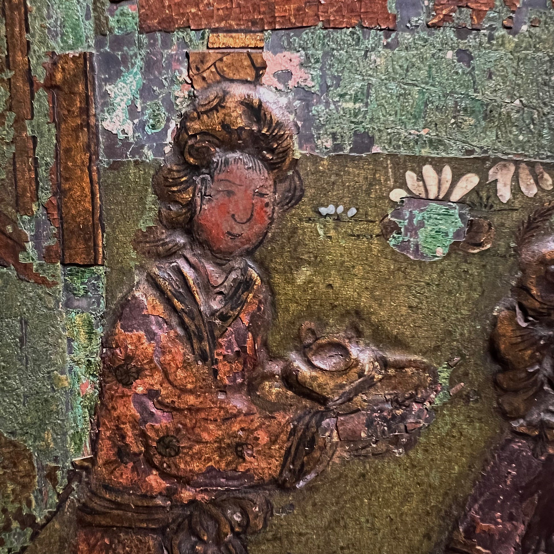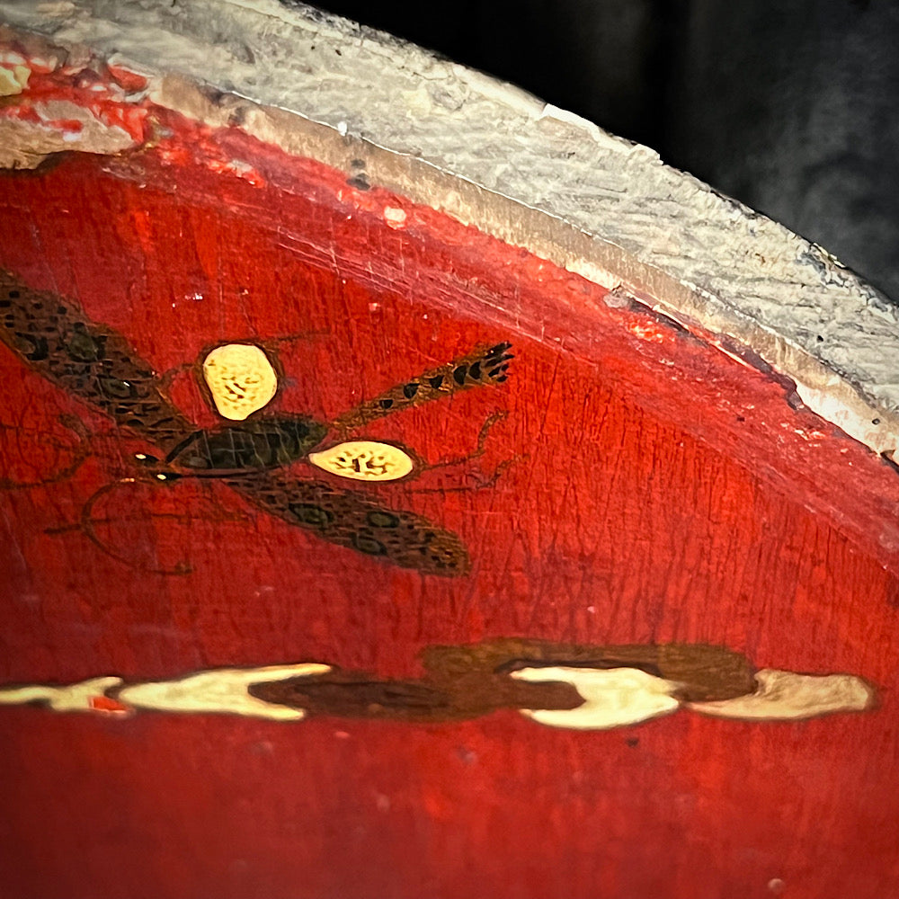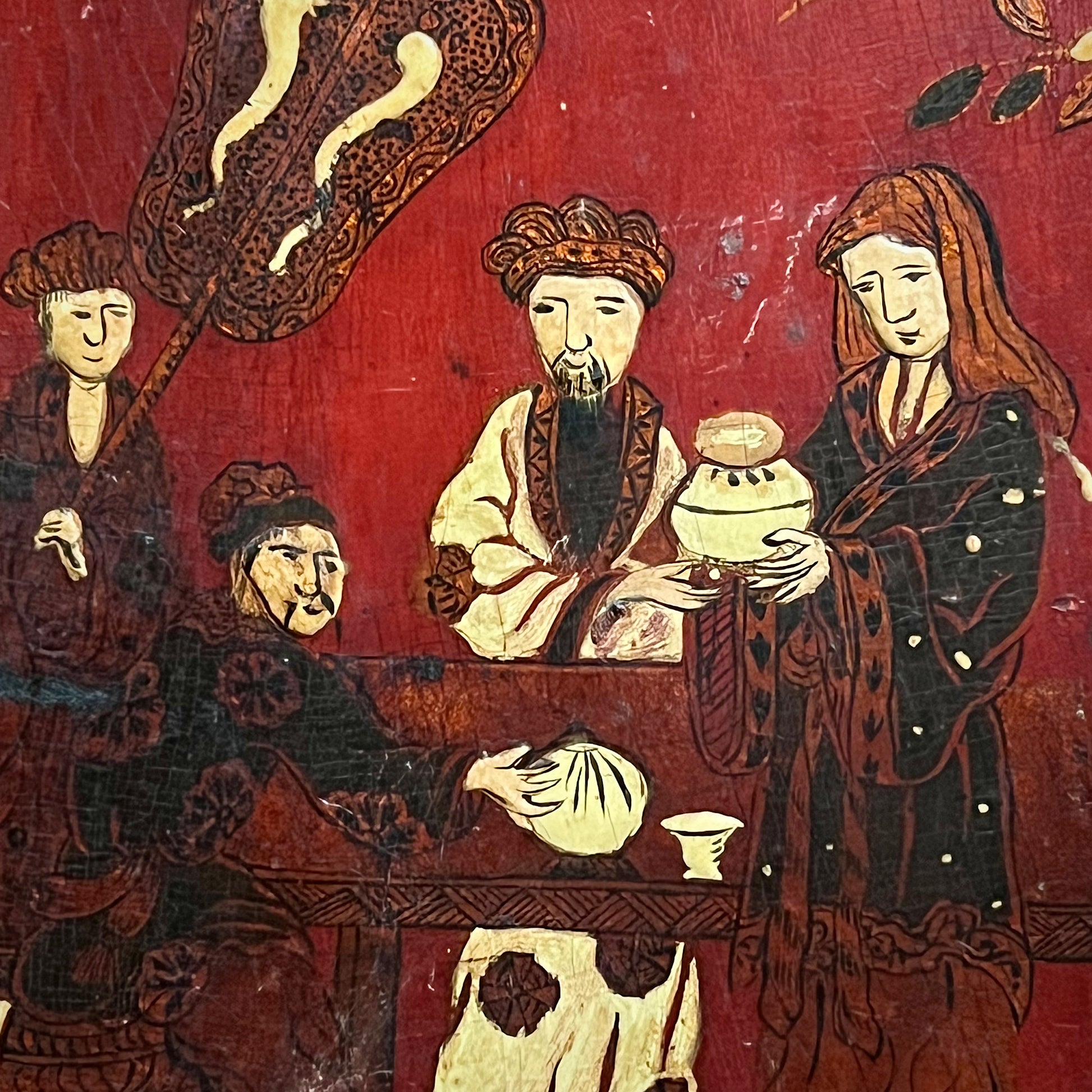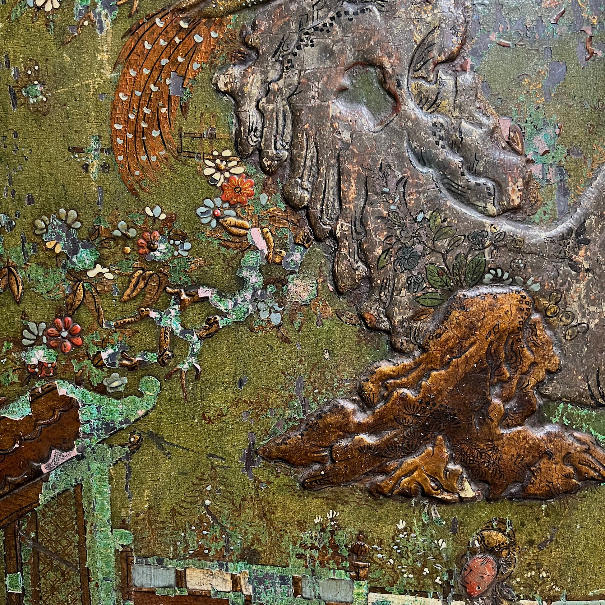 The delightful piece is decorated front and back. The front side in green lacquer and sculpted japanned chinoiserie depicting figures taking tea, flowers, birds and a pagoda within a natural landscape of stylised trees and rock faces. The back side which would have been the internal facing side, is adorned with birds, insects, delicate flowers surrounding a family dining. Surmounting the red lacquer panel is a sunburst of radiating gold.