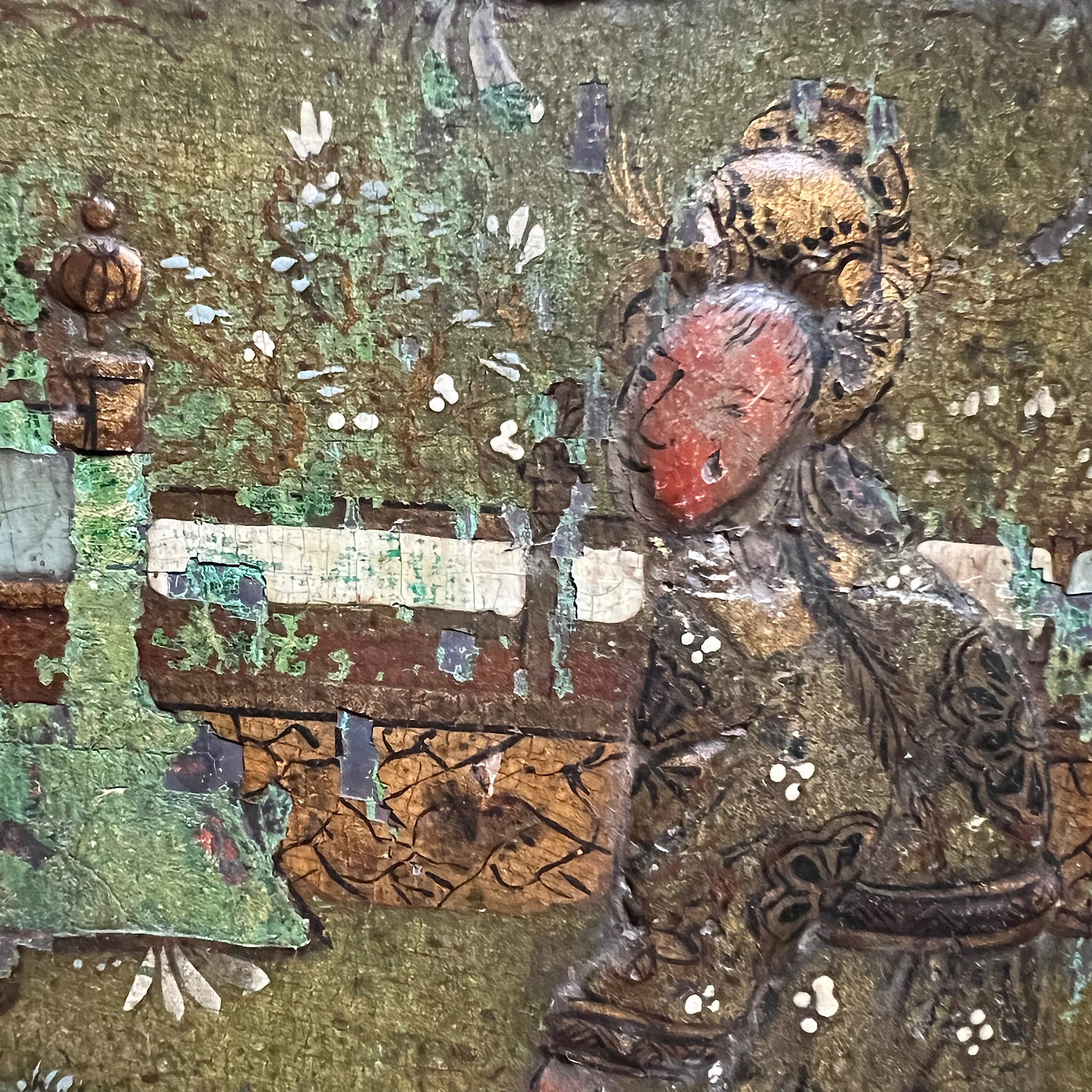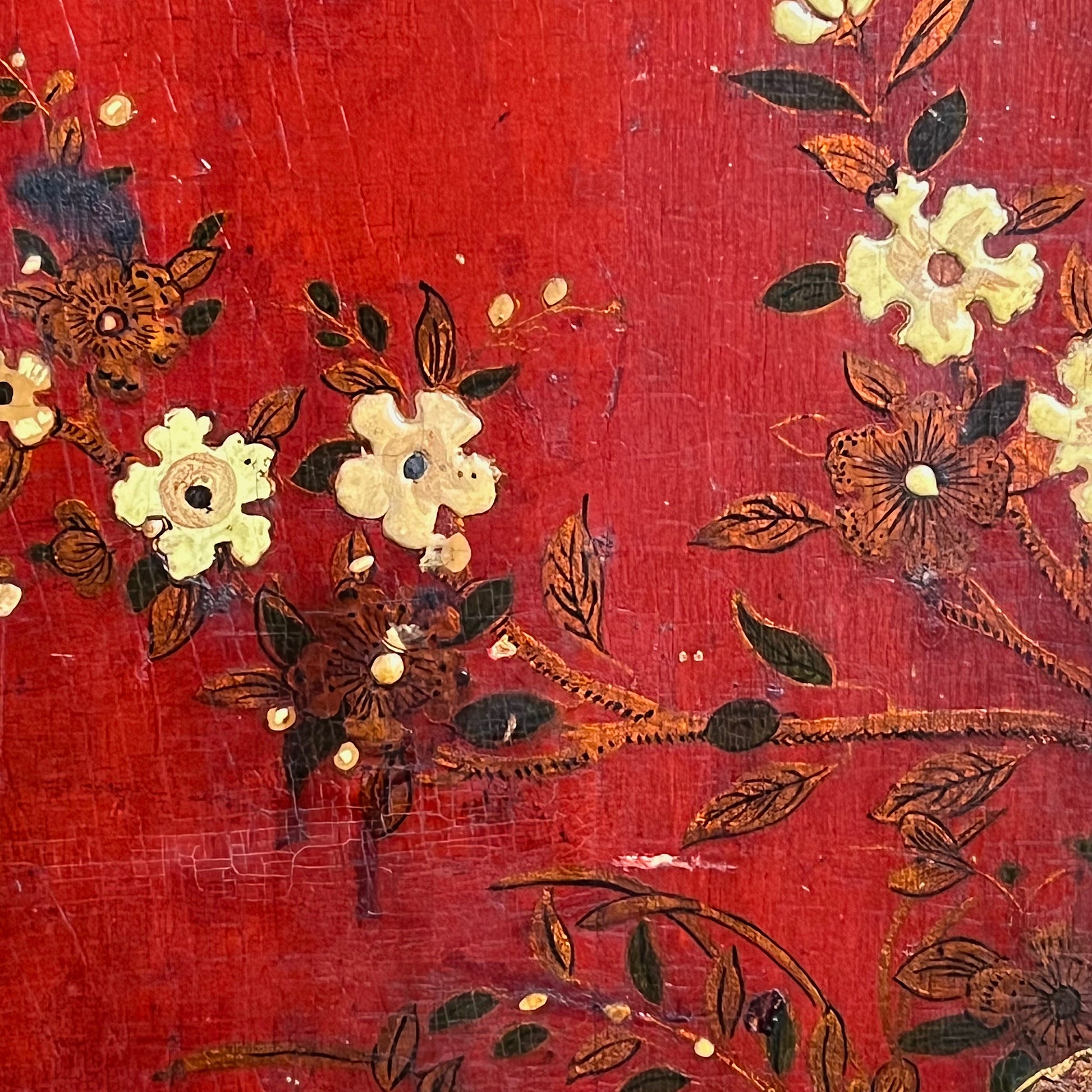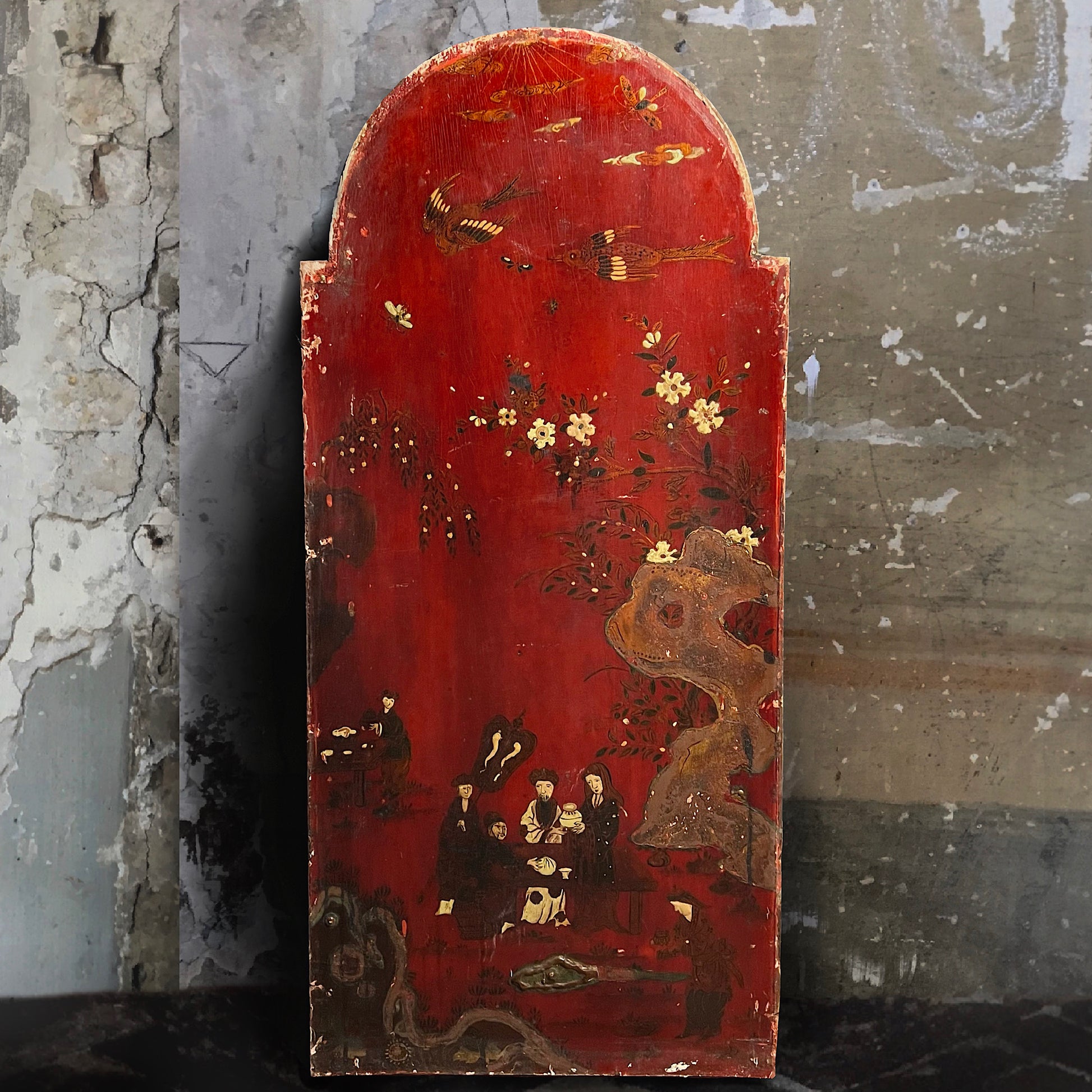 A beautiful decorative English Queen Anne Chinoiserie panel, most likely originally from a large cupboard, bureau or bookcase- long since removed and now a work of art in its own right.