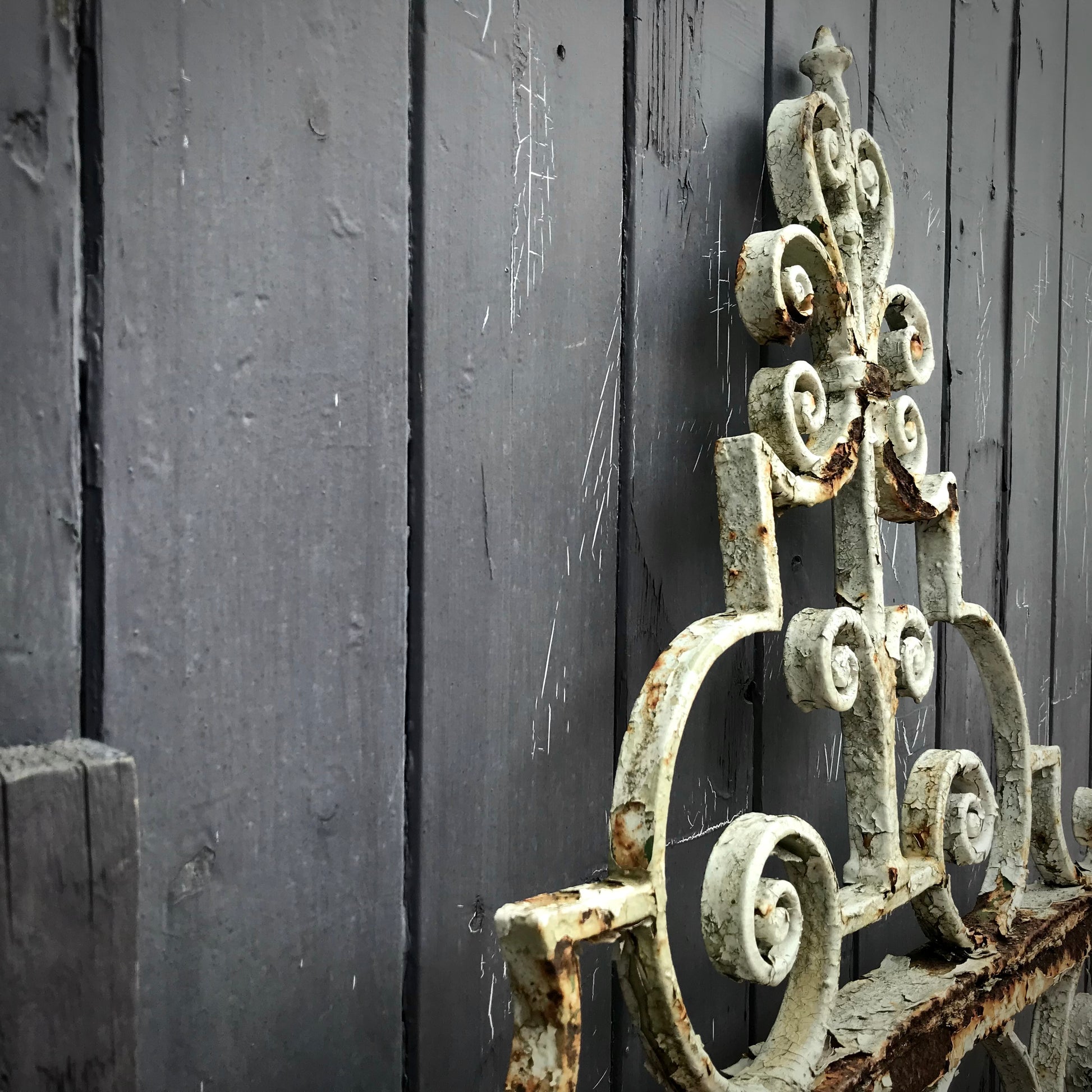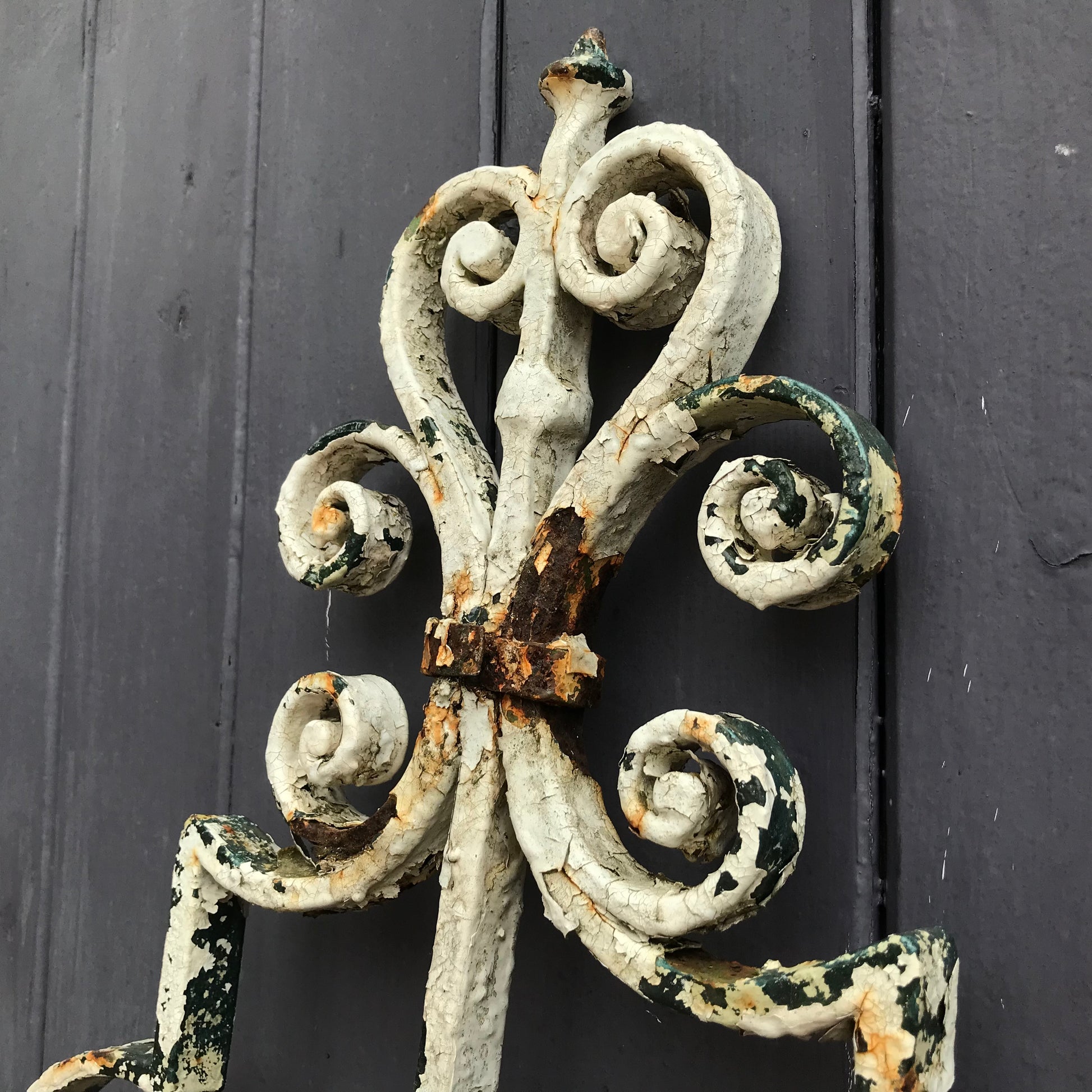 A sumptuous pair of Georgian wrought iron garden gates. Perfect for your orangery or walled garden gateways and in all of their hundreds of years worth of patination and flakey white paint. One smaller at 86 cm wide; 178 cm high and 4.5 cm deep.