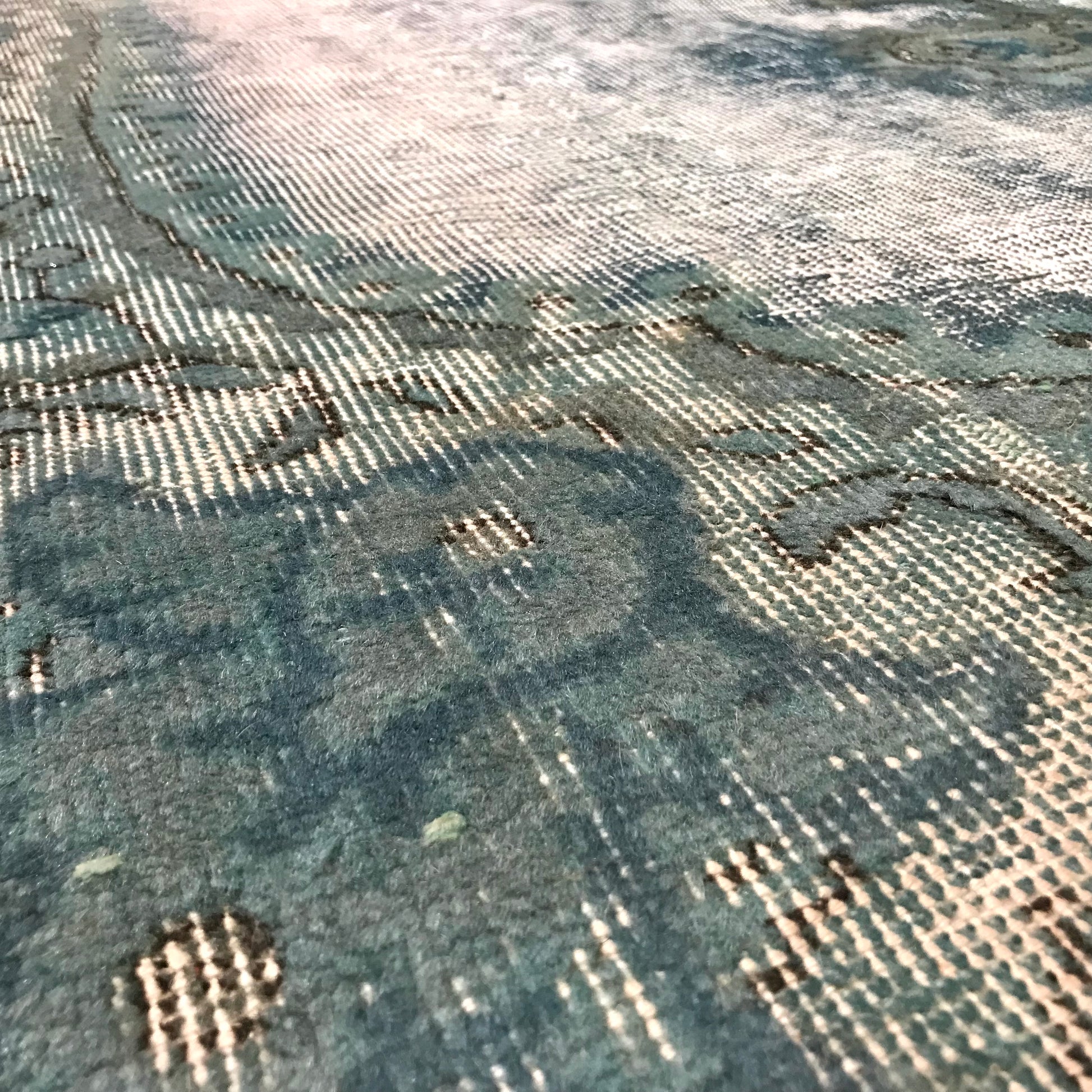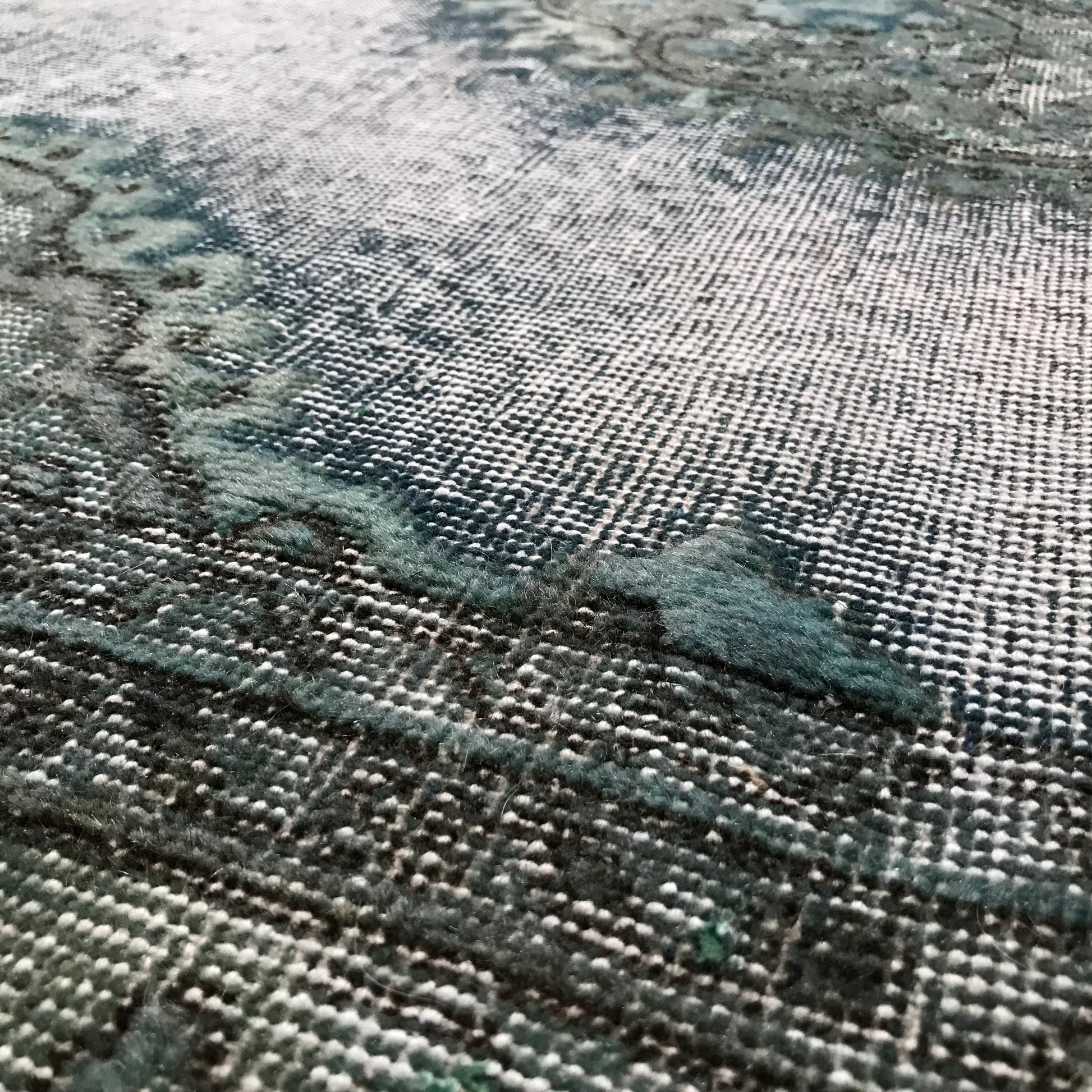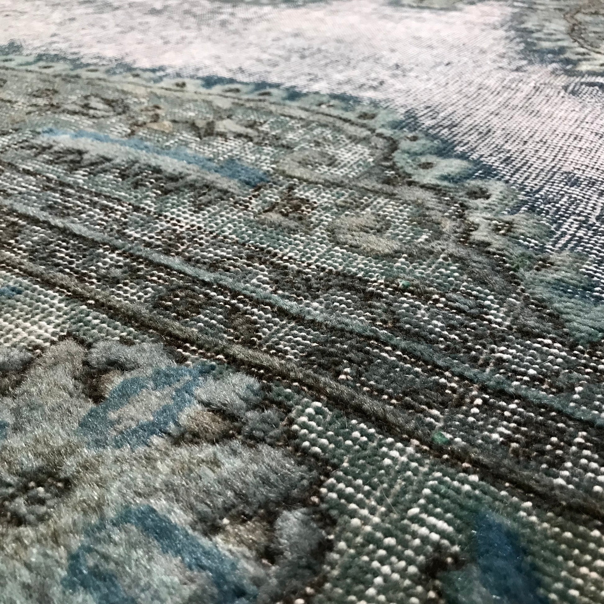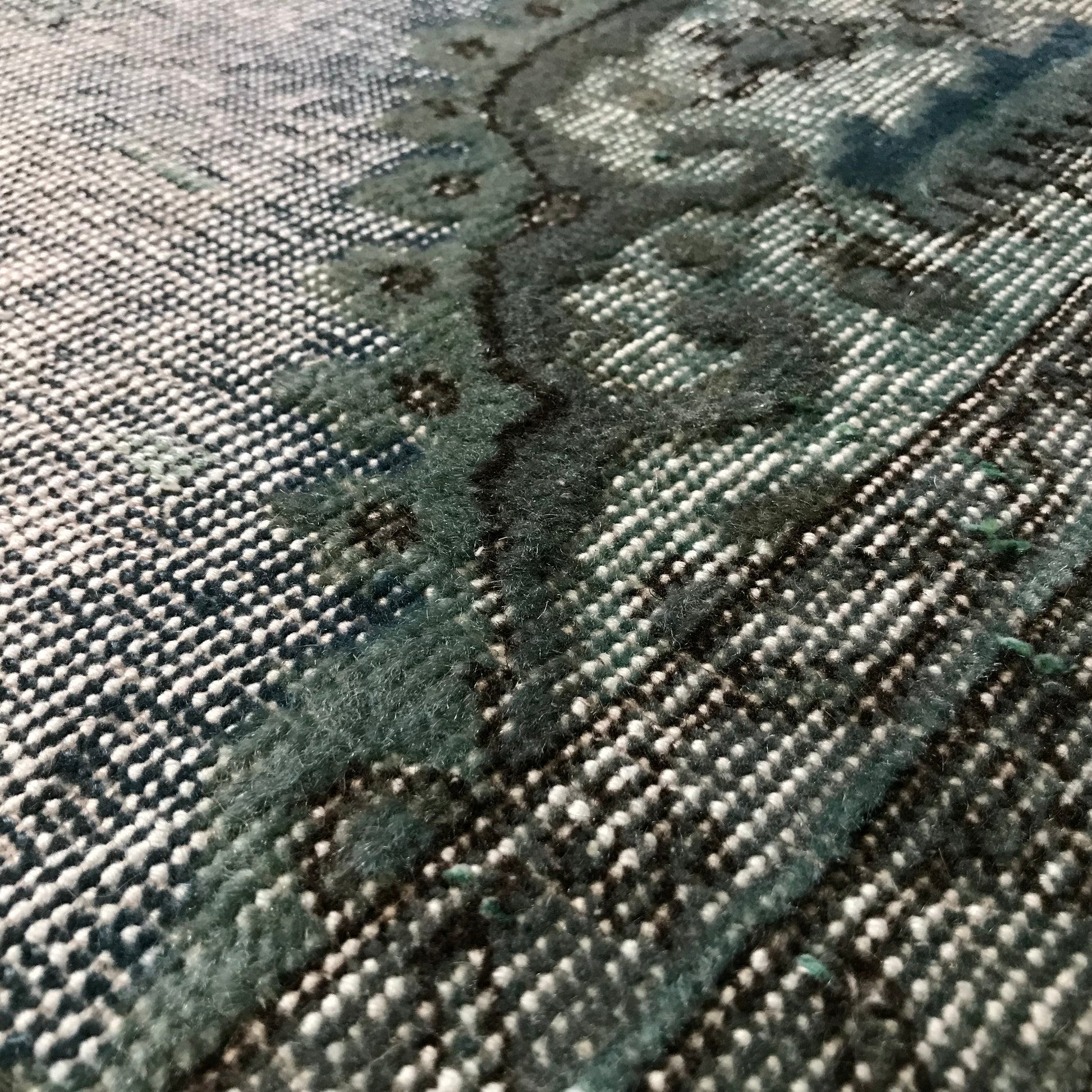 A striking antique hand-knotted rug from Turkey with a traditional design reinvented in a modern style through a process of transformation. The rug has areas of colours removed then re-dyed in a monochromatic palette, obtaining an original, unique and exceptional one-off appearance. The pile is then shaved, to give a hand-carved 3D relief, completely or in part, giving a beautiful aged and worn appearance. In some, the original design or pattern is still visible, while in others, it is barely noticeable. Each rug from our collection is unique, unrepeatable and precious. Pile composition of wool and cotton. Thickness 0.5cm.