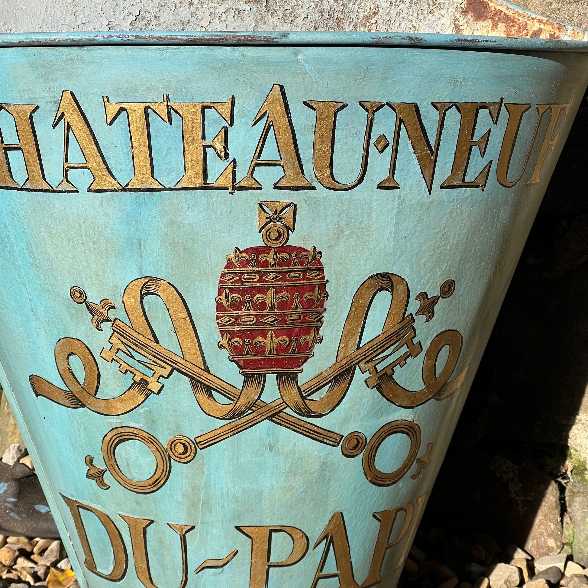 Once an essential tool of the French grape harvest, this traditional Hotte was carried on the back throughout the vineyards of Avignon and the Gironde, gathering bunches of grapes by hand long before mechanical picking took over. Made in galvanised metal and painted with the historic Châteauneuf-du-Pape name and papal crest – a lineage that reaches back to the 14th Century, when the Popes resided in Avignon – it carries the spirit of the region’s great winemaking heritage.