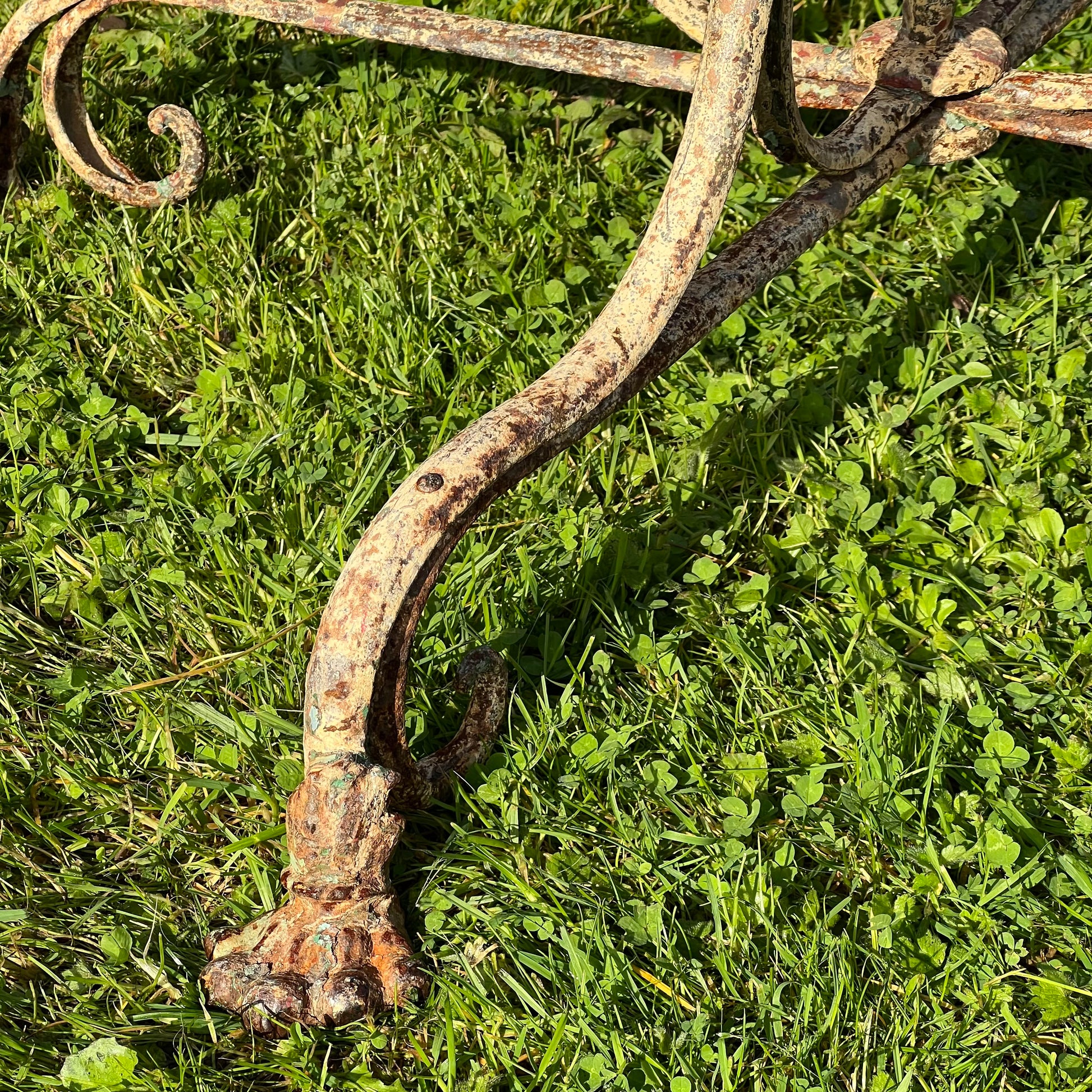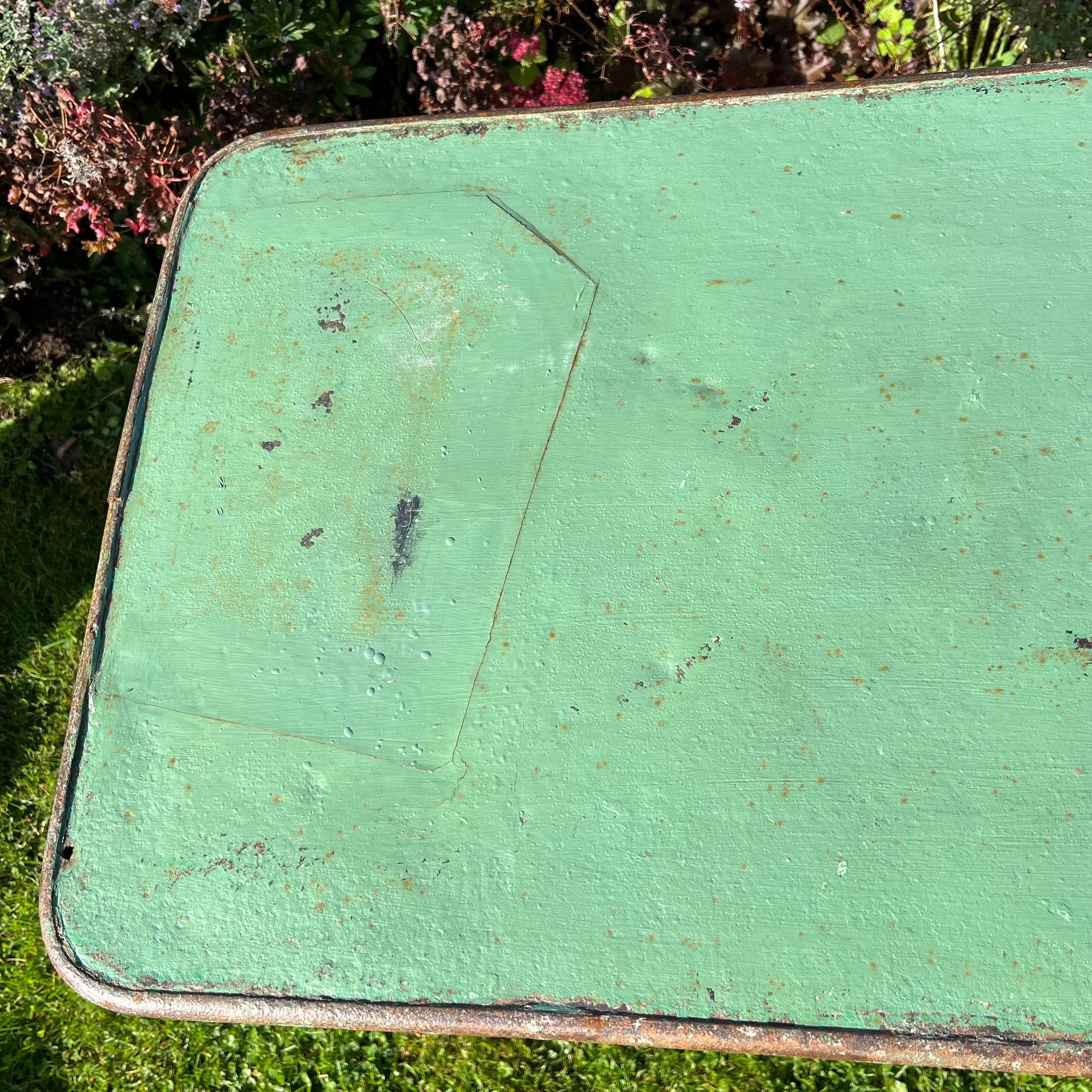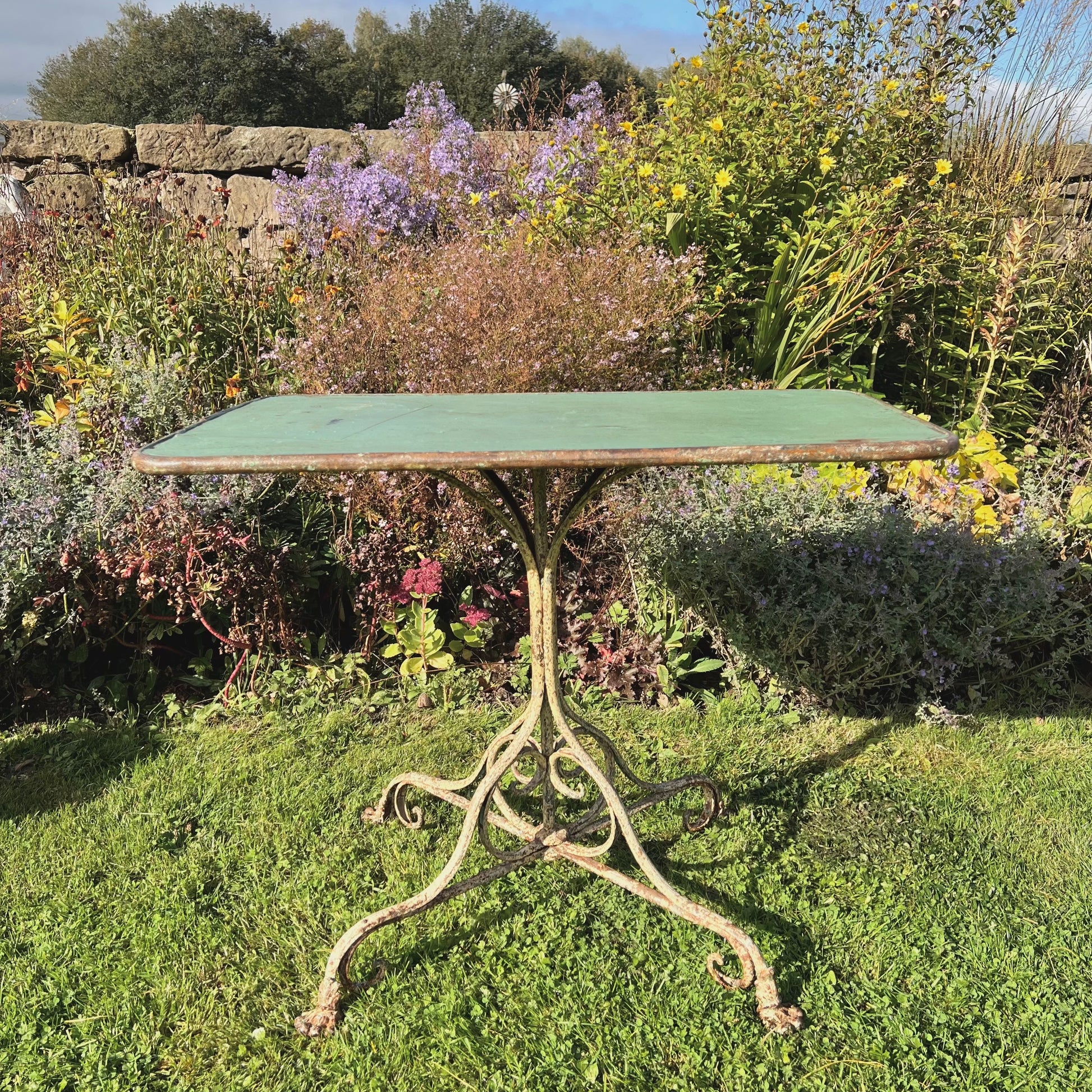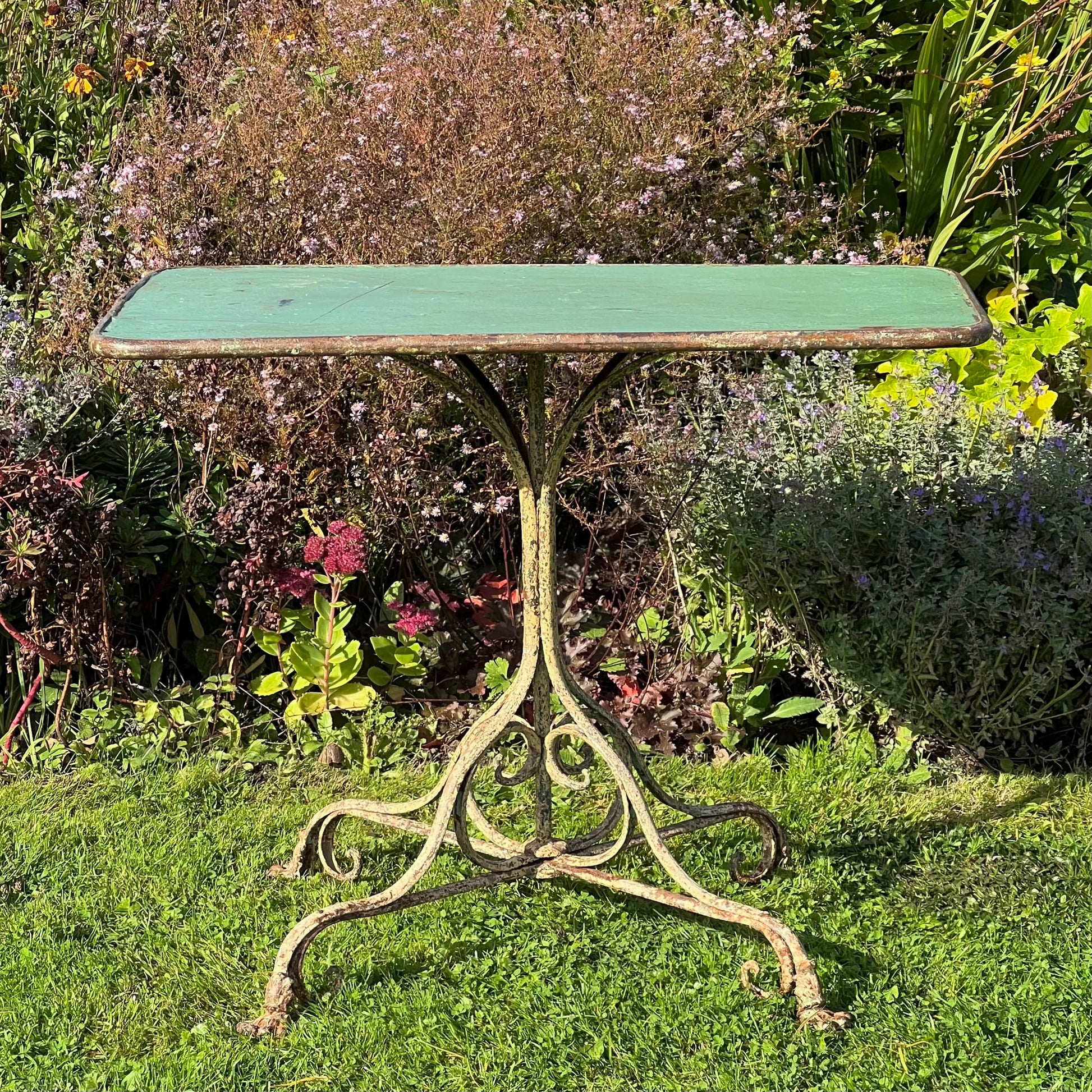 A finely made wrought iron garden table from Arras, northern France, dating to around 1900–1920. The rectangular top, retaining its old green painted surface with earlier layers visible beneath, is supported by a delicately scrolled wrought iron base with a circular stretcher and four curved legs ending in lion’s paw feet, a signature detail of Arras production in the early twentieth century.