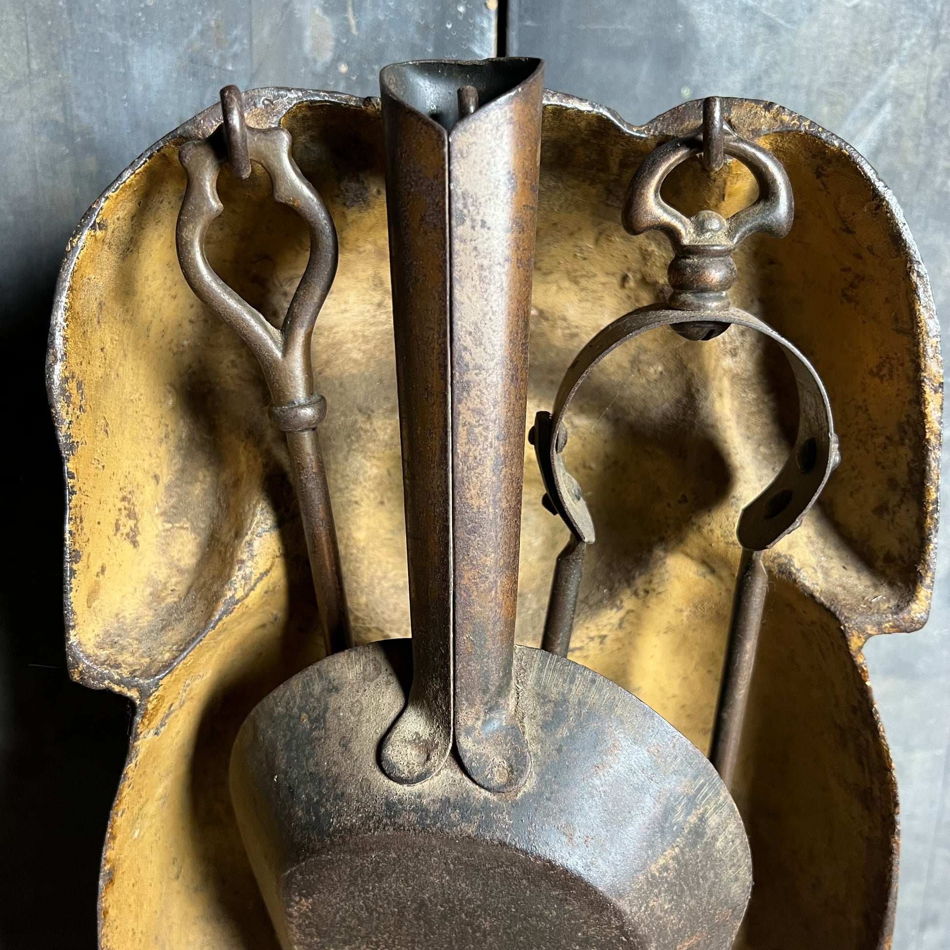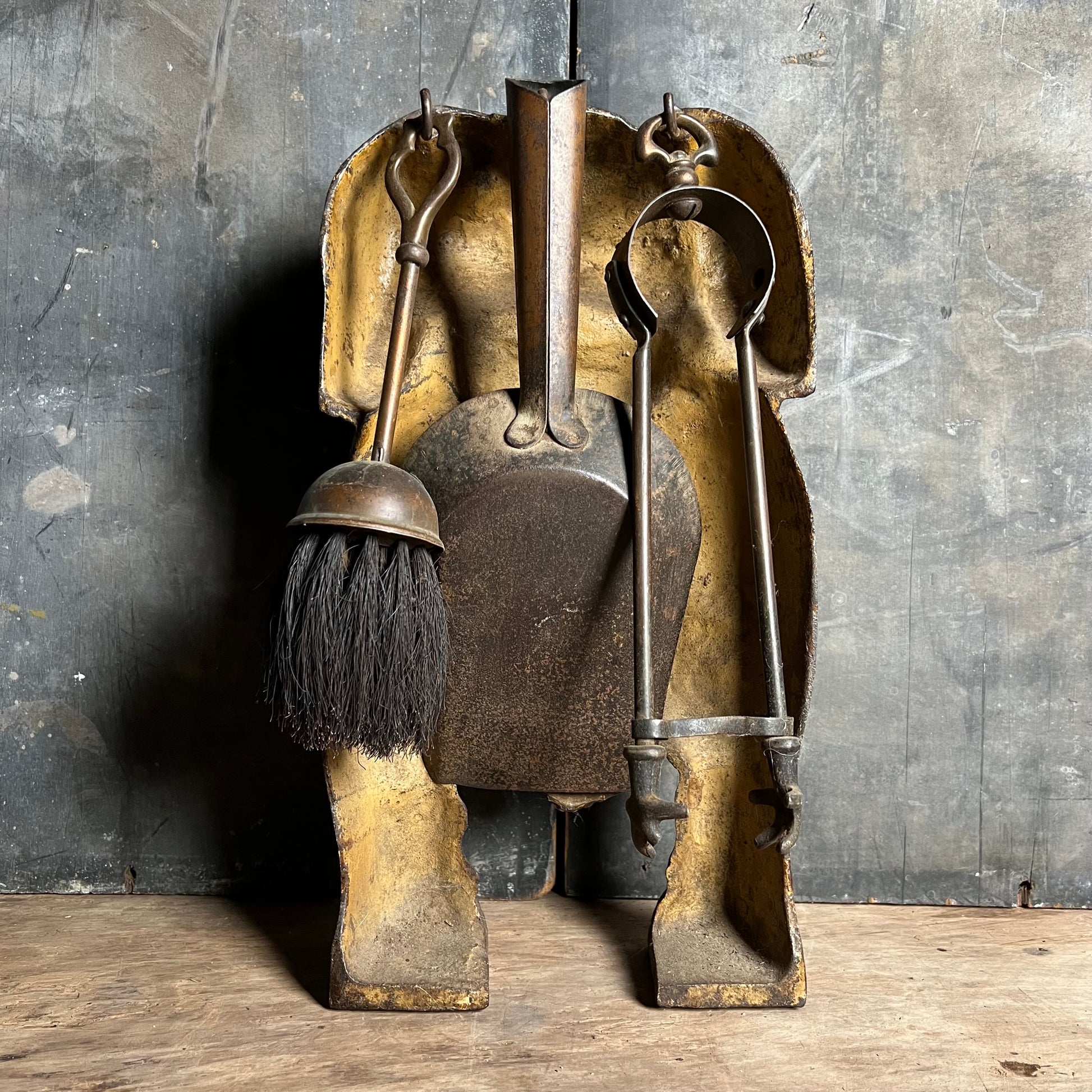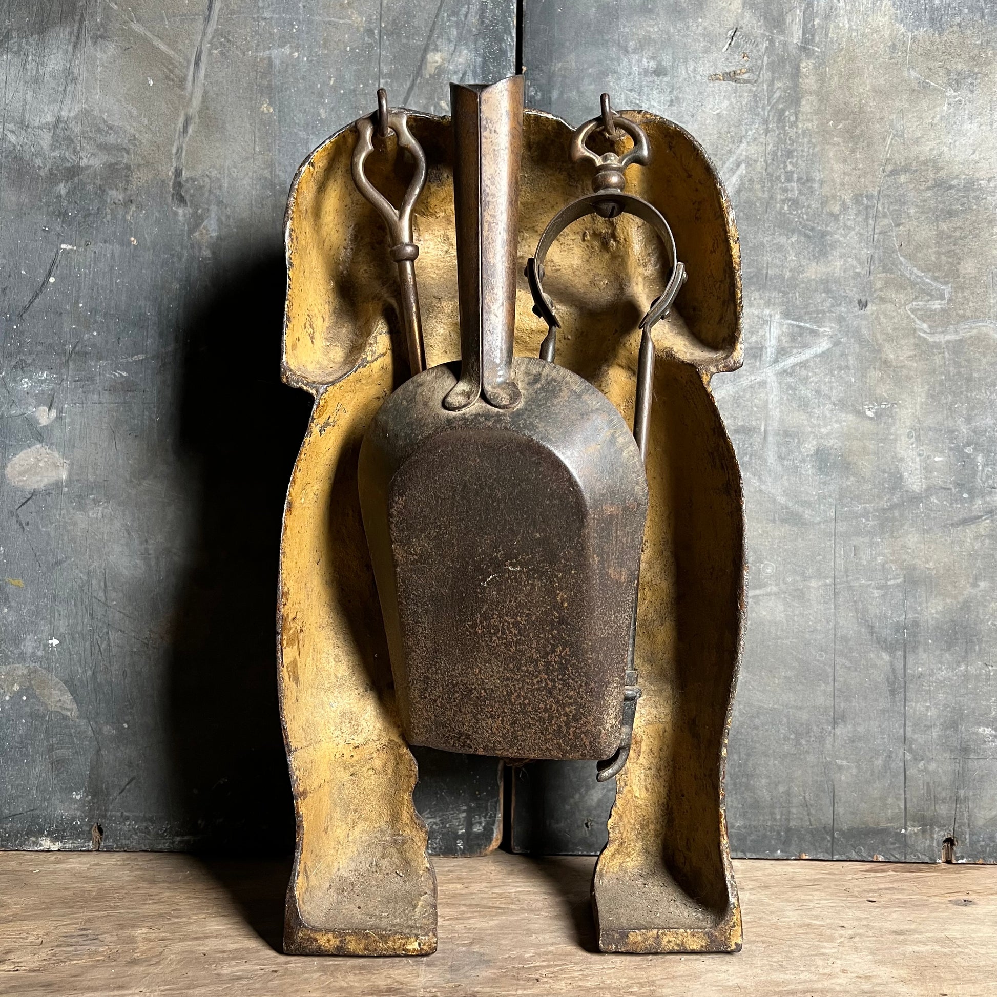 The back of the sculpted dog is formed flat to hold a set of fire irons and a fire brush.