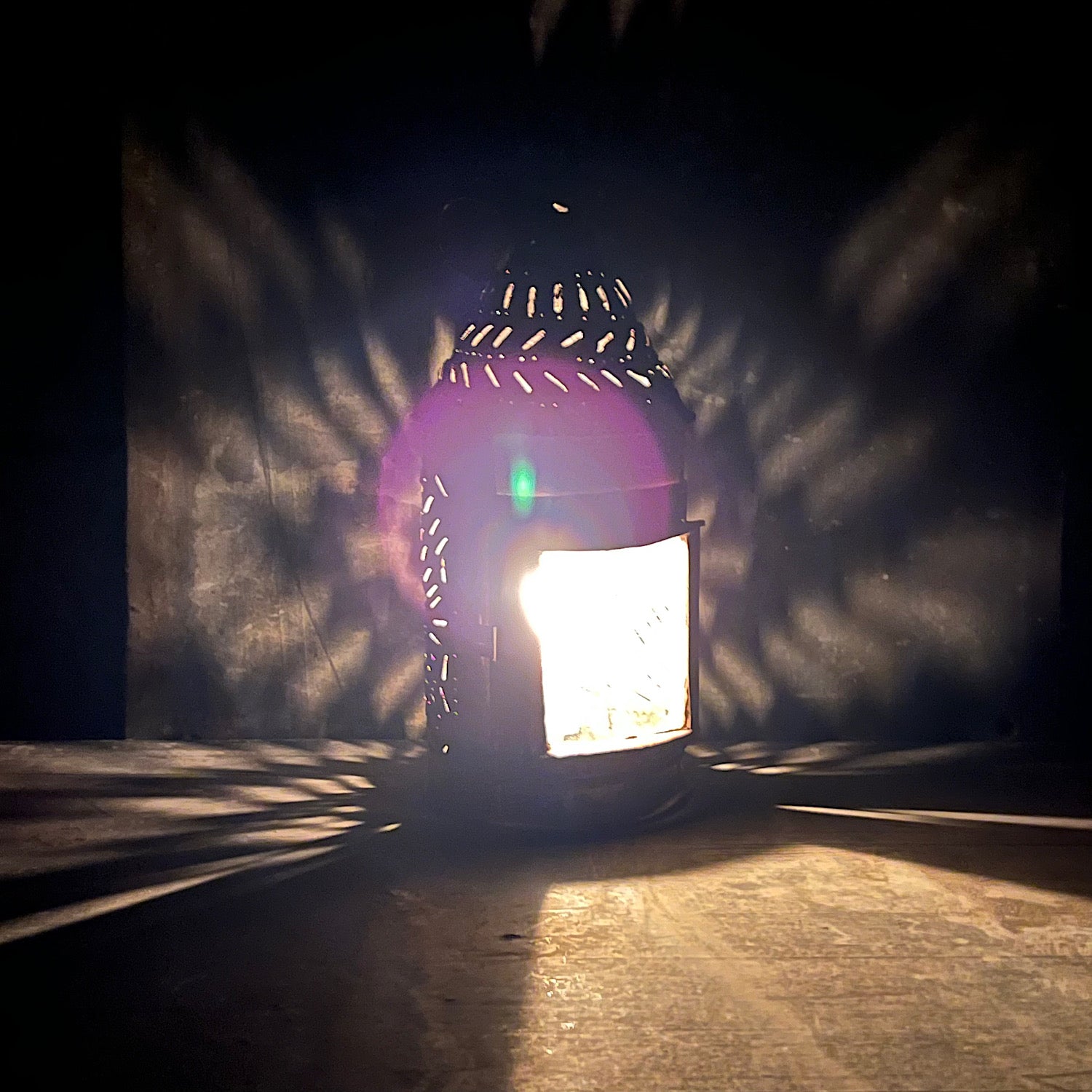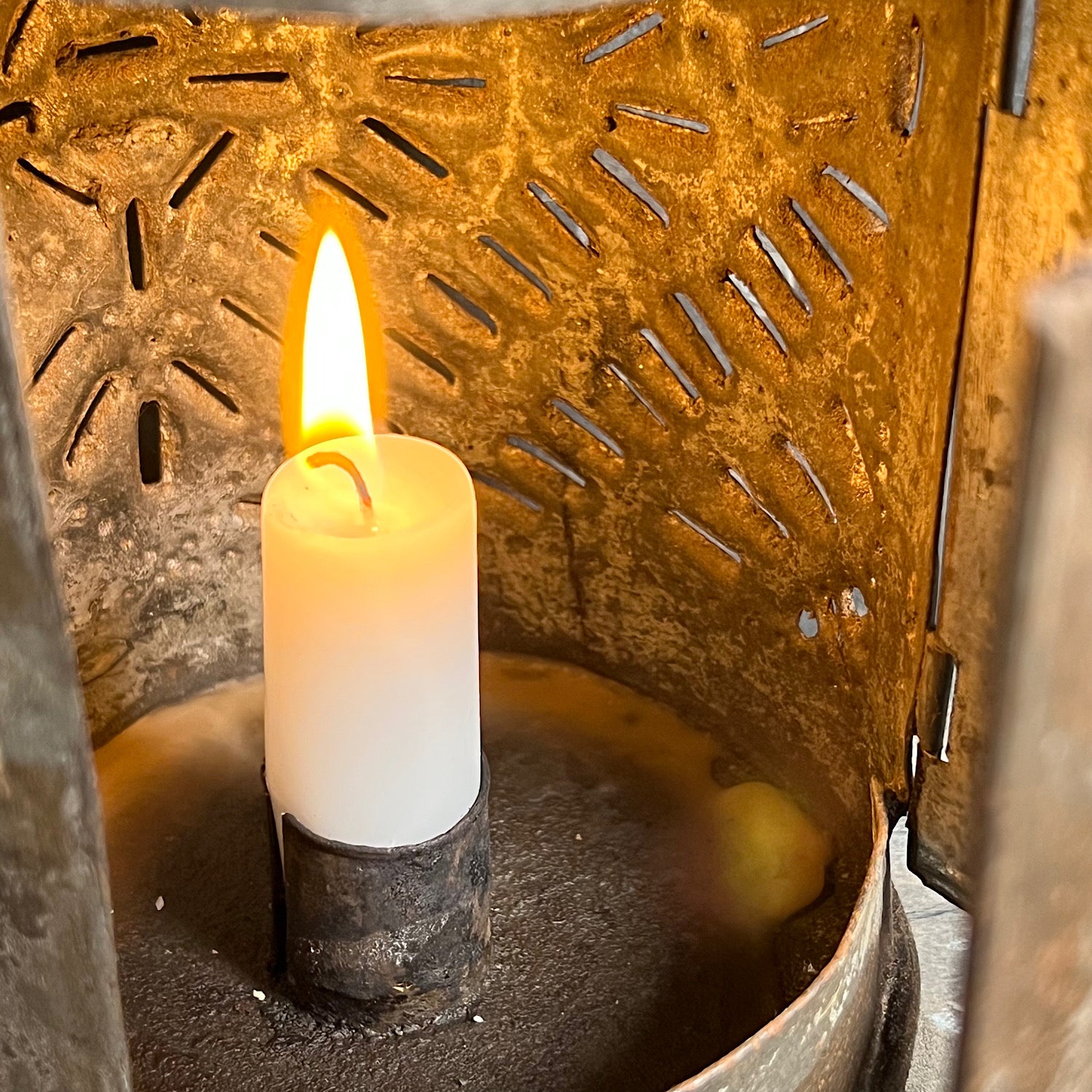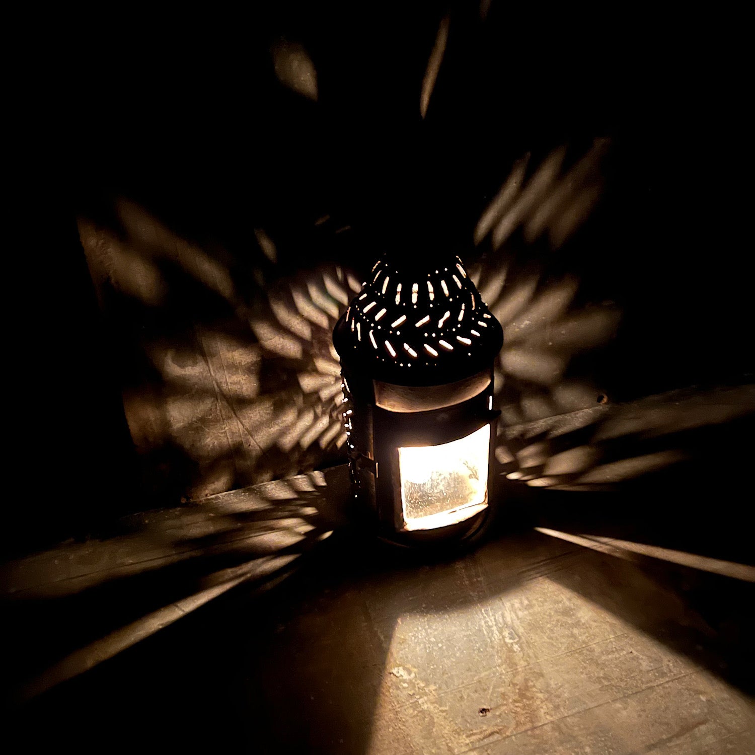 When lit by candlelight, the light scatters from the small incisions in dancing patterns across surrounding surfaces.
