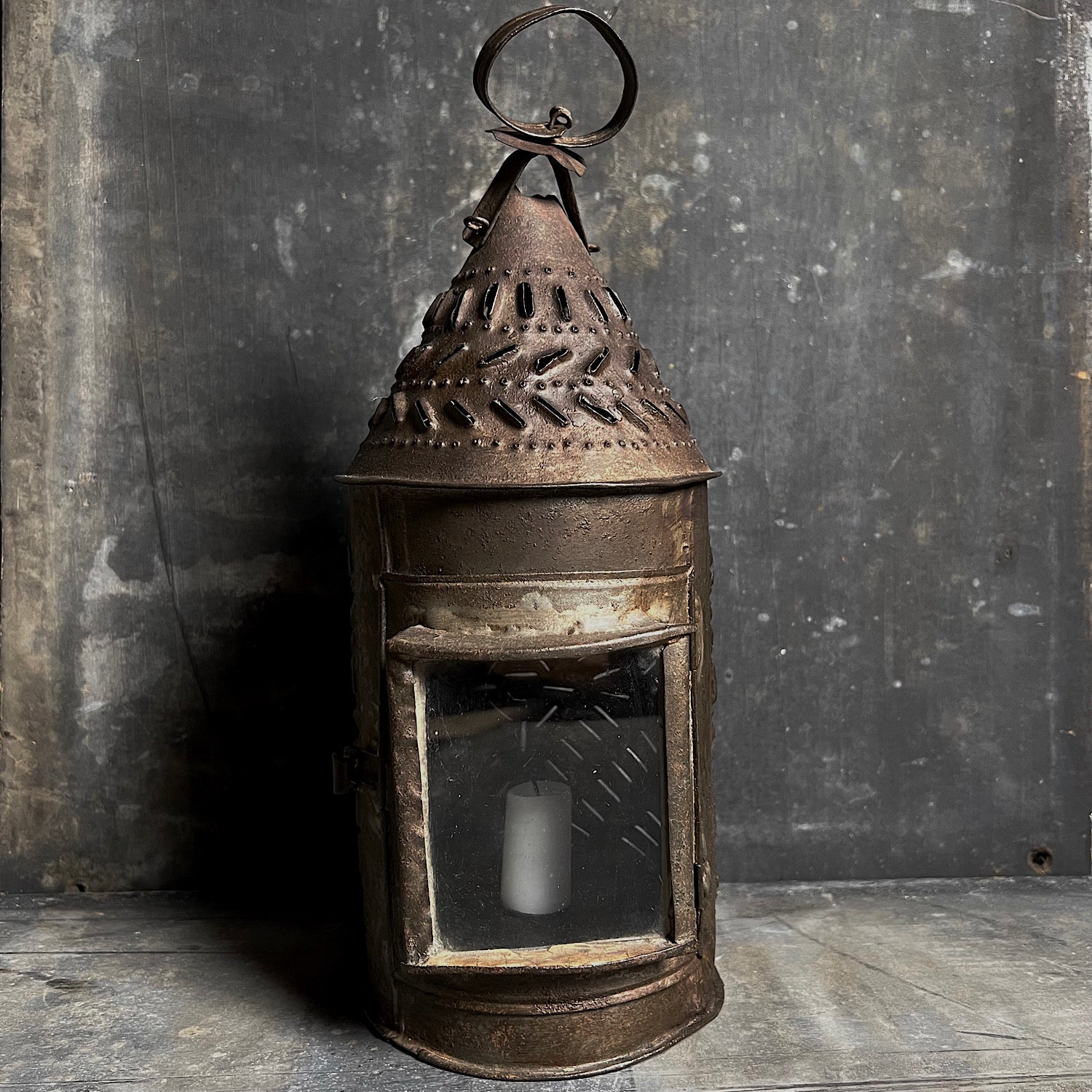 The lantern incorporates a protruding original glass pane - which light floods from, the top of the lantern is hung from a looped strap handle.