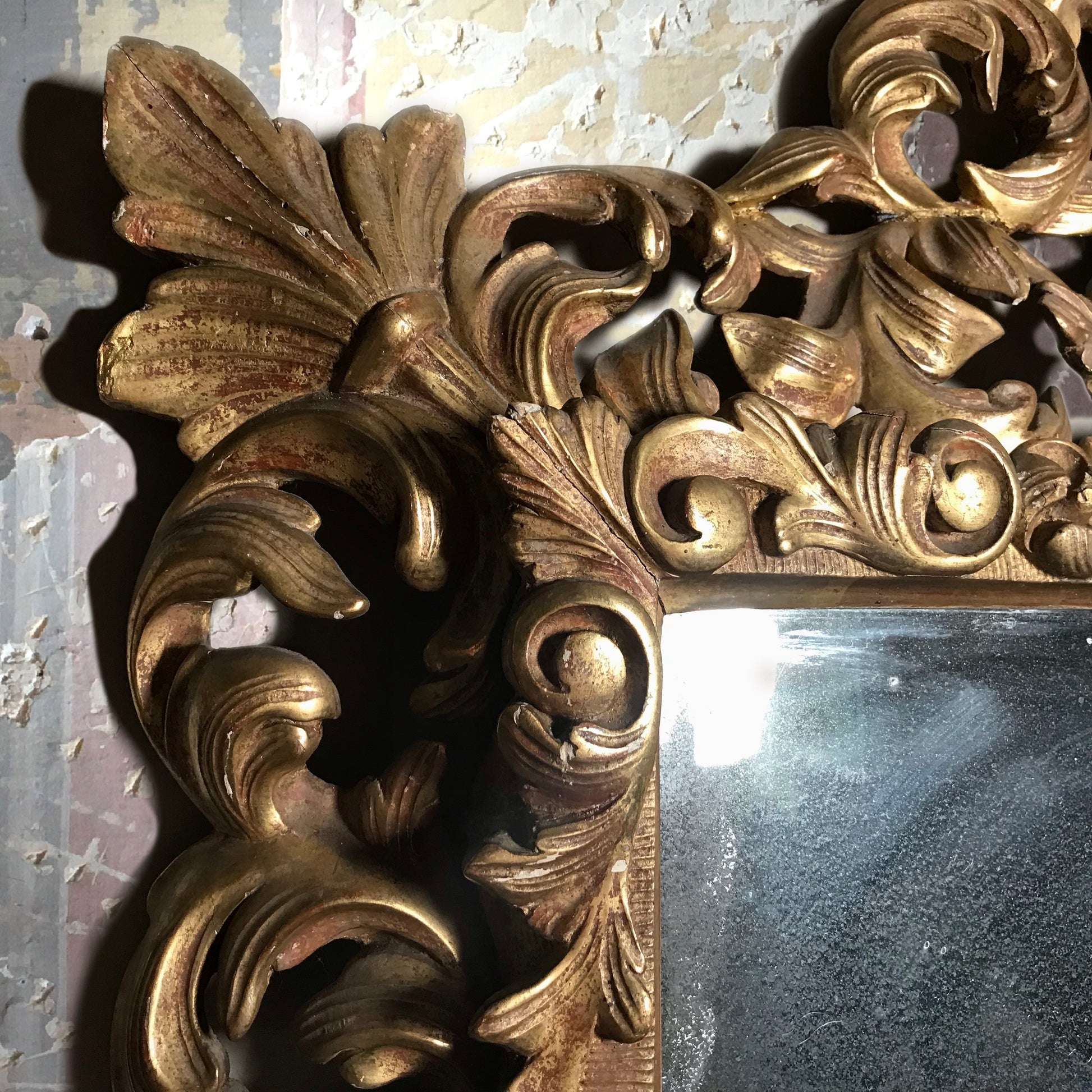 Retaining its’ original delicately foxed glass with beautifully distressed gilding, revealing the underlying red bole gesso base beneath its soft golden surface.