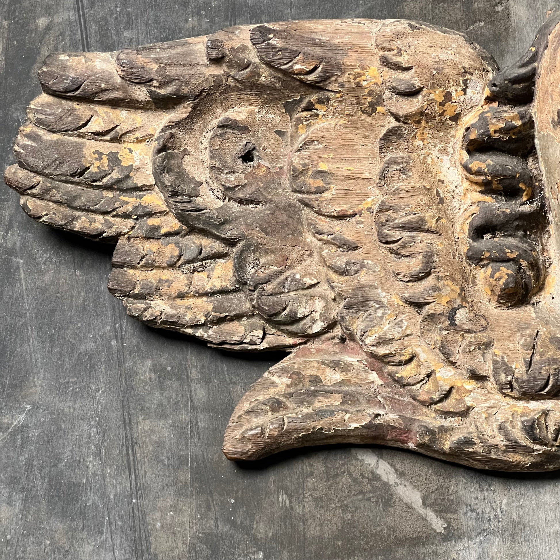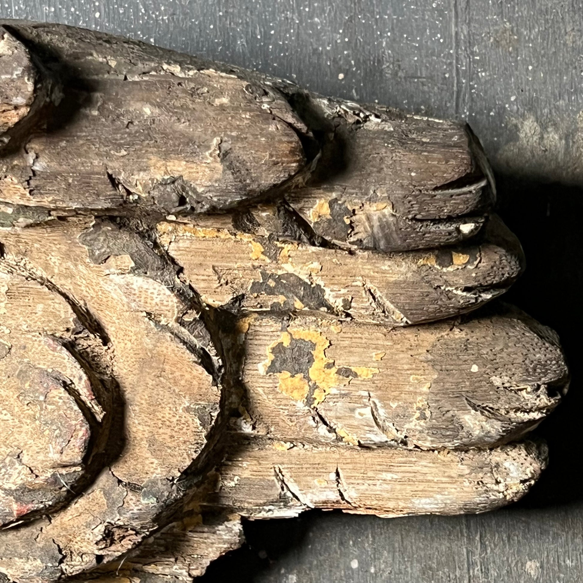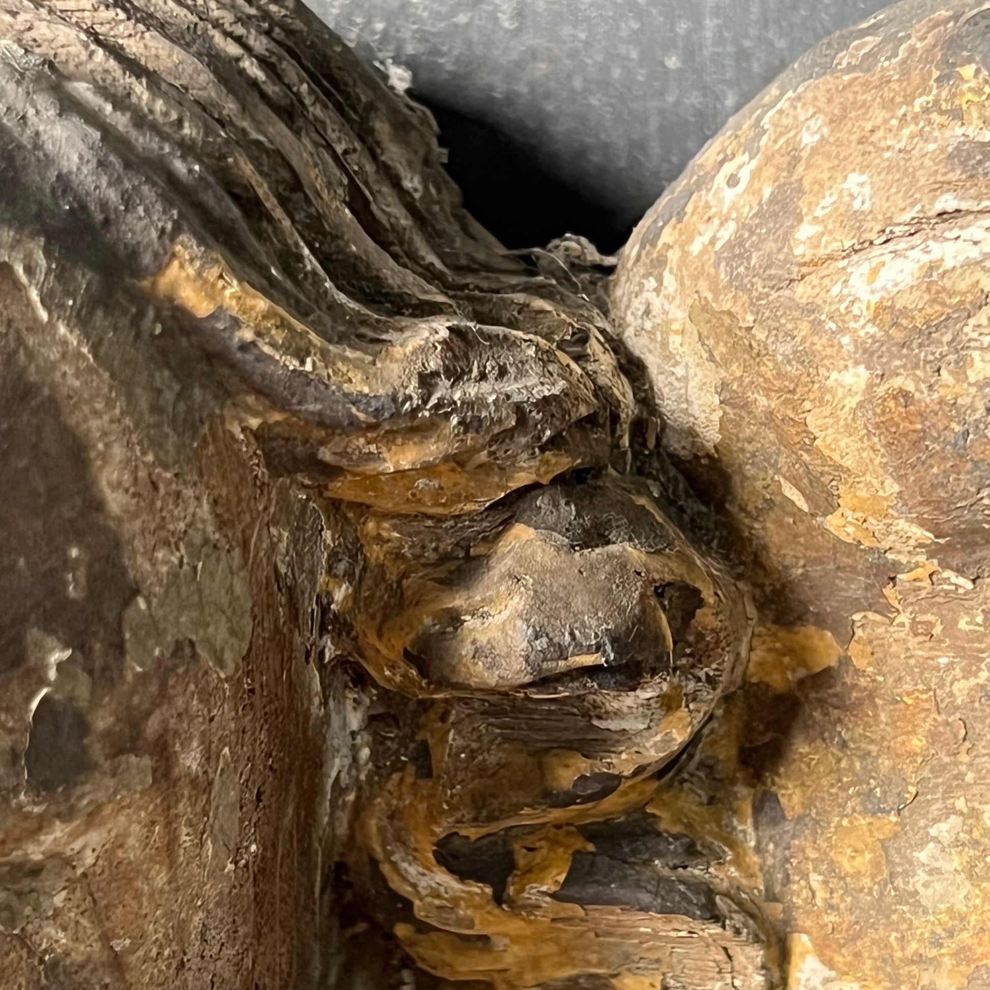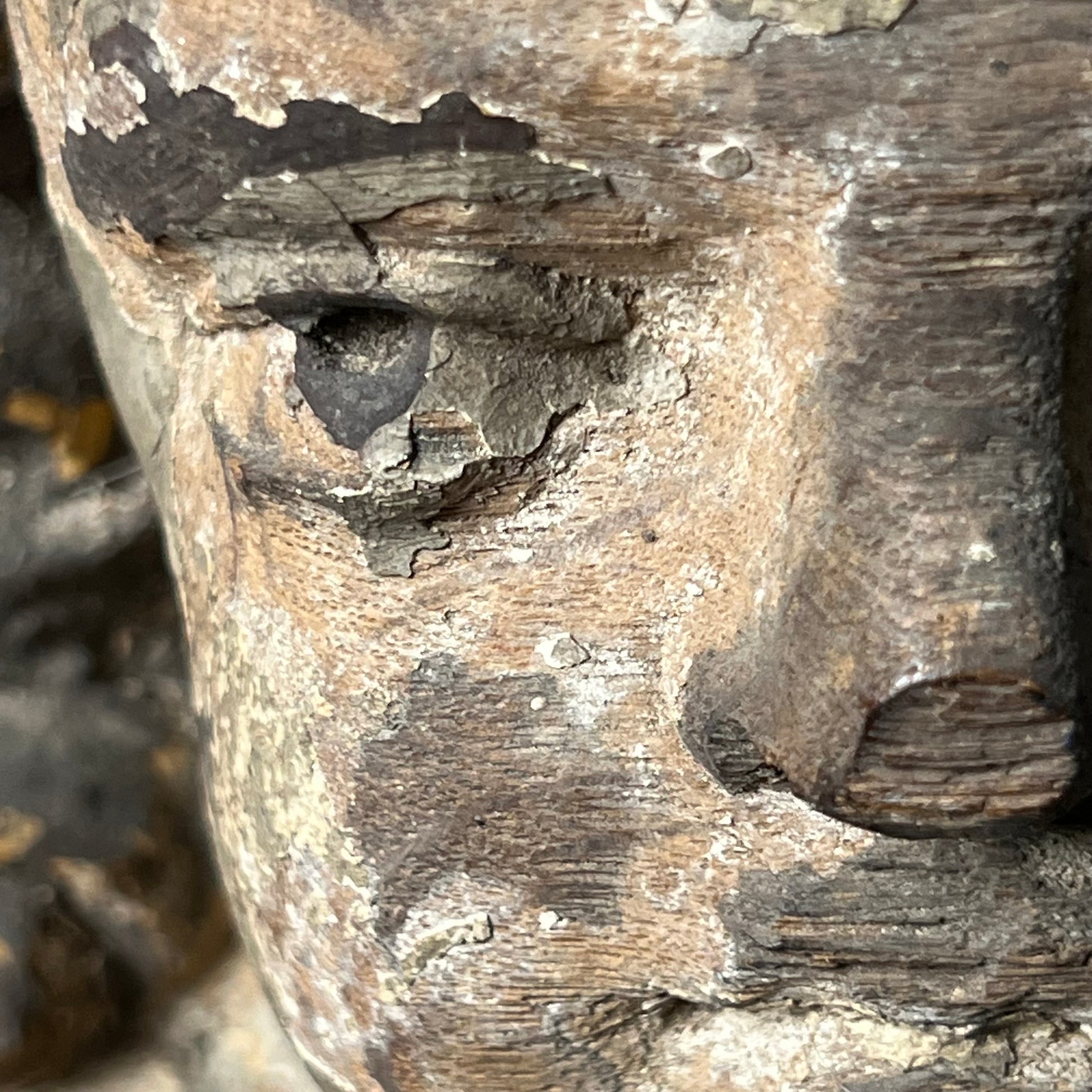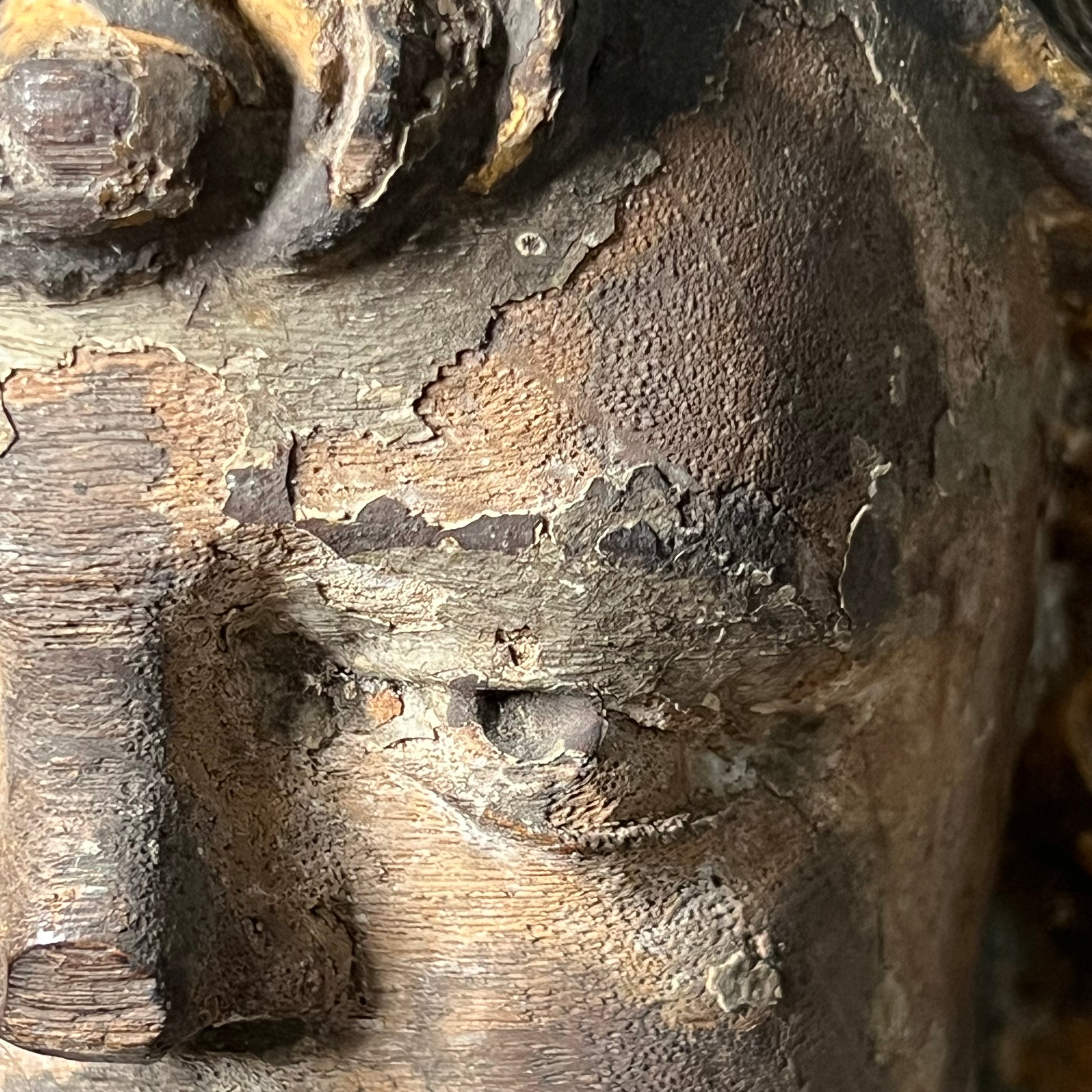 Having much of its original polychrome paint remaining in pleasingly crusty layers.