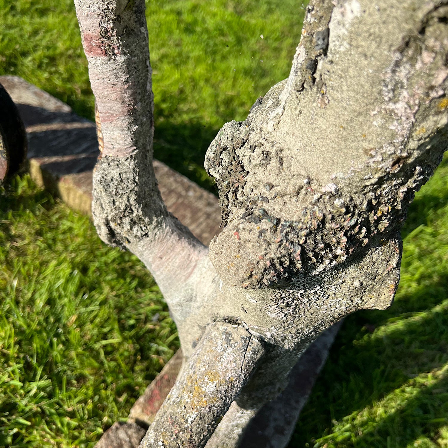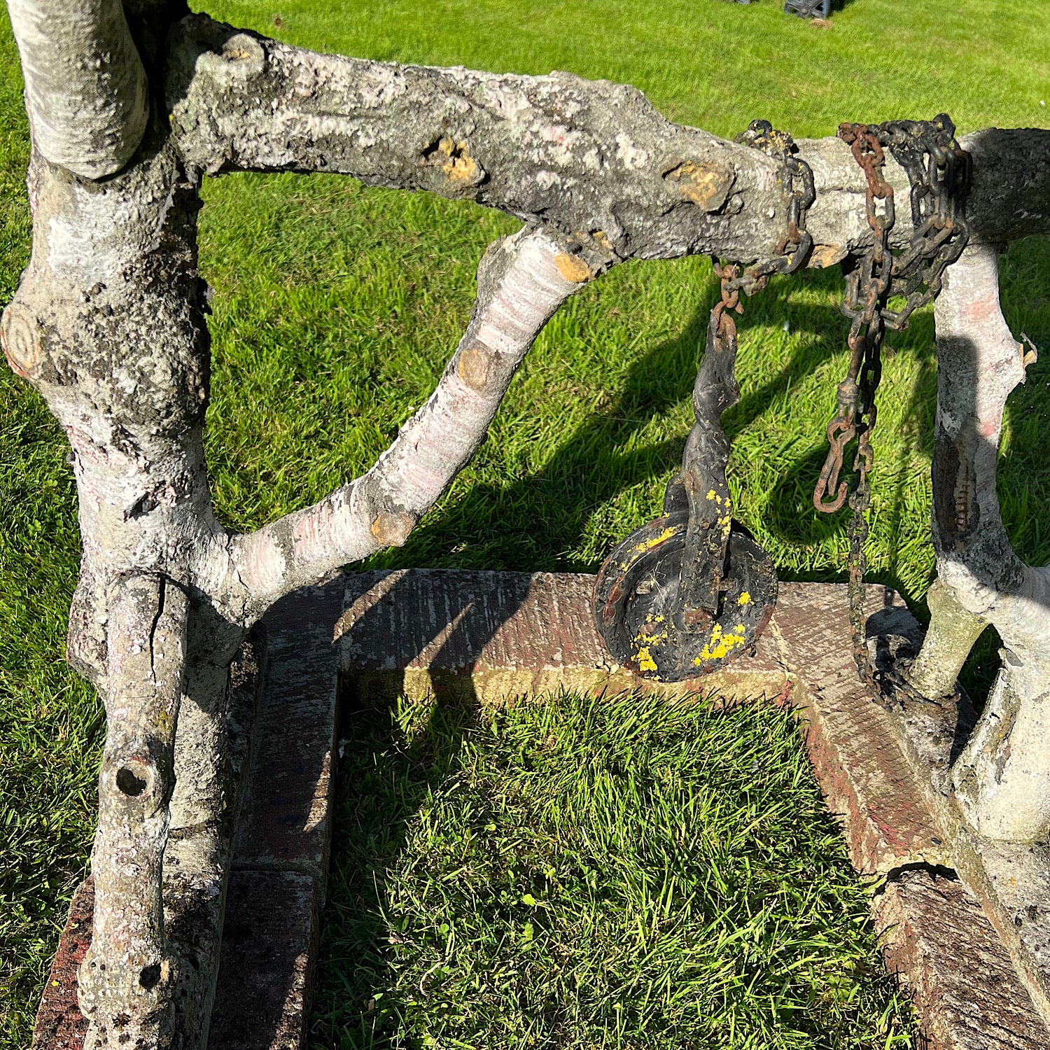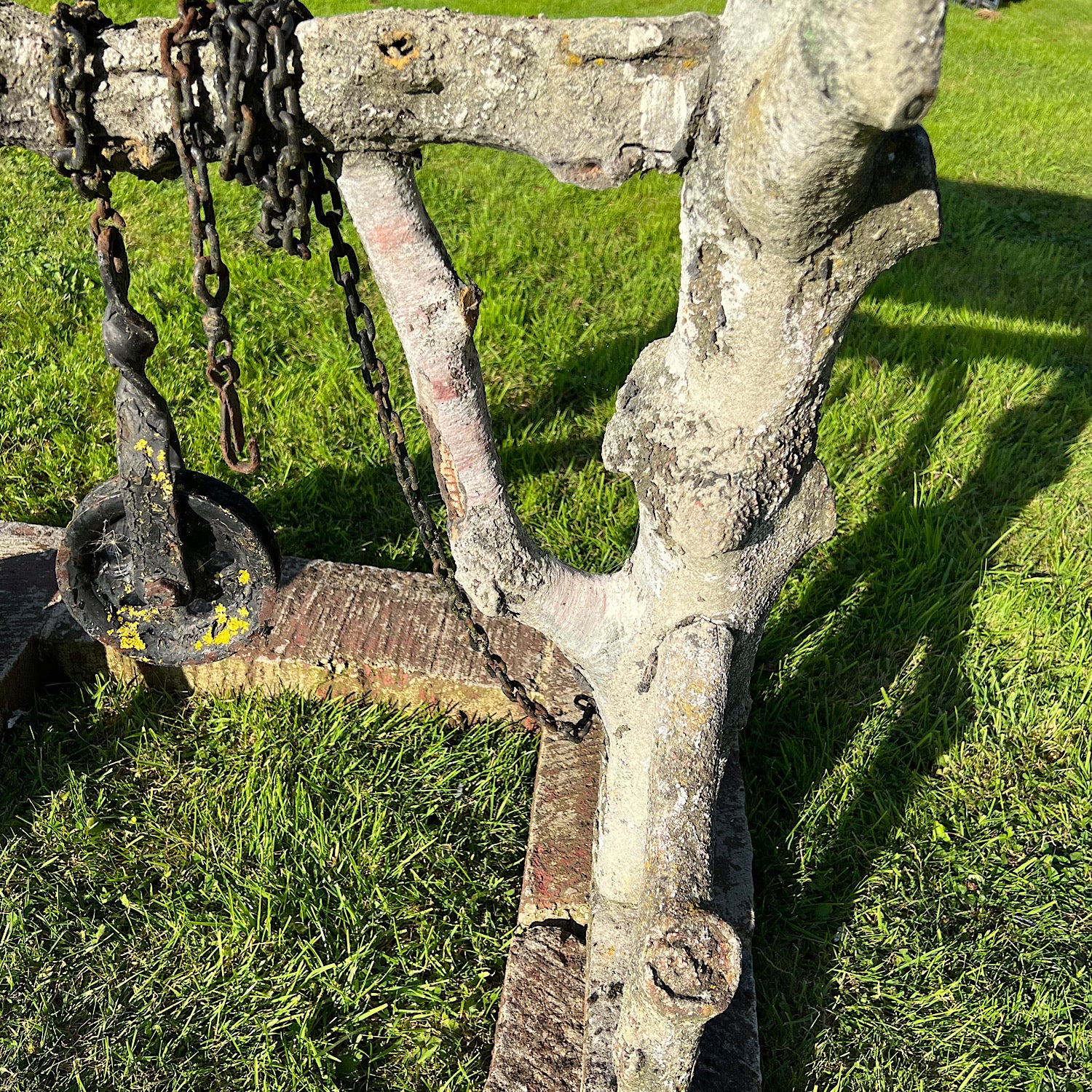 Faux bois (from the French for false wood) refers to the artistic imitation of wood or wood grains. This fabulous piece is sculpted from iron rodded reinforced concrete and hand-detailed in a naturalistic manner to resemble live wood with bark-textured surfaces.