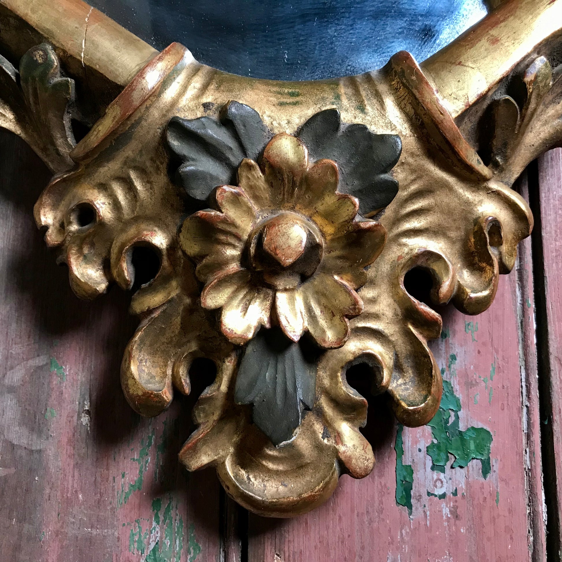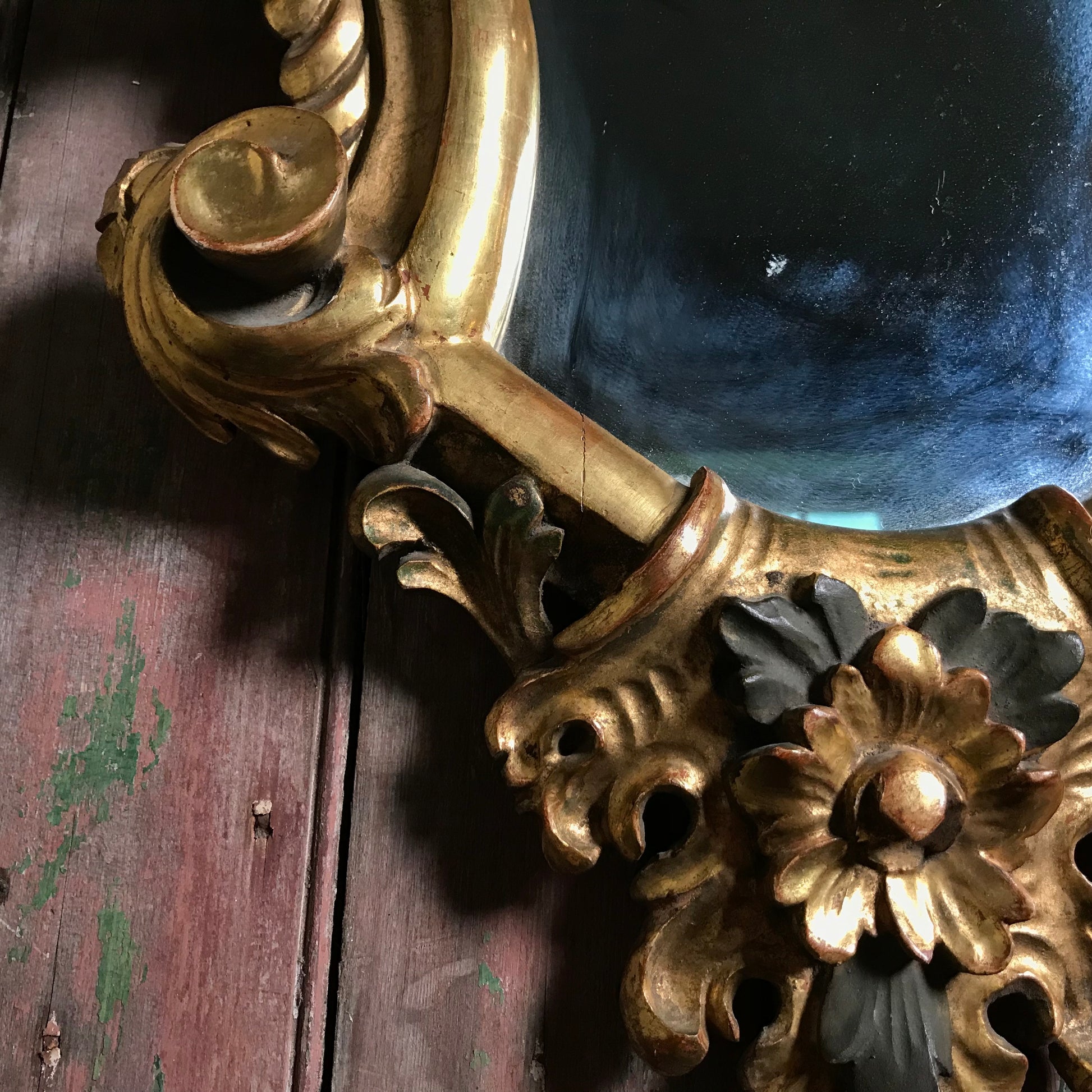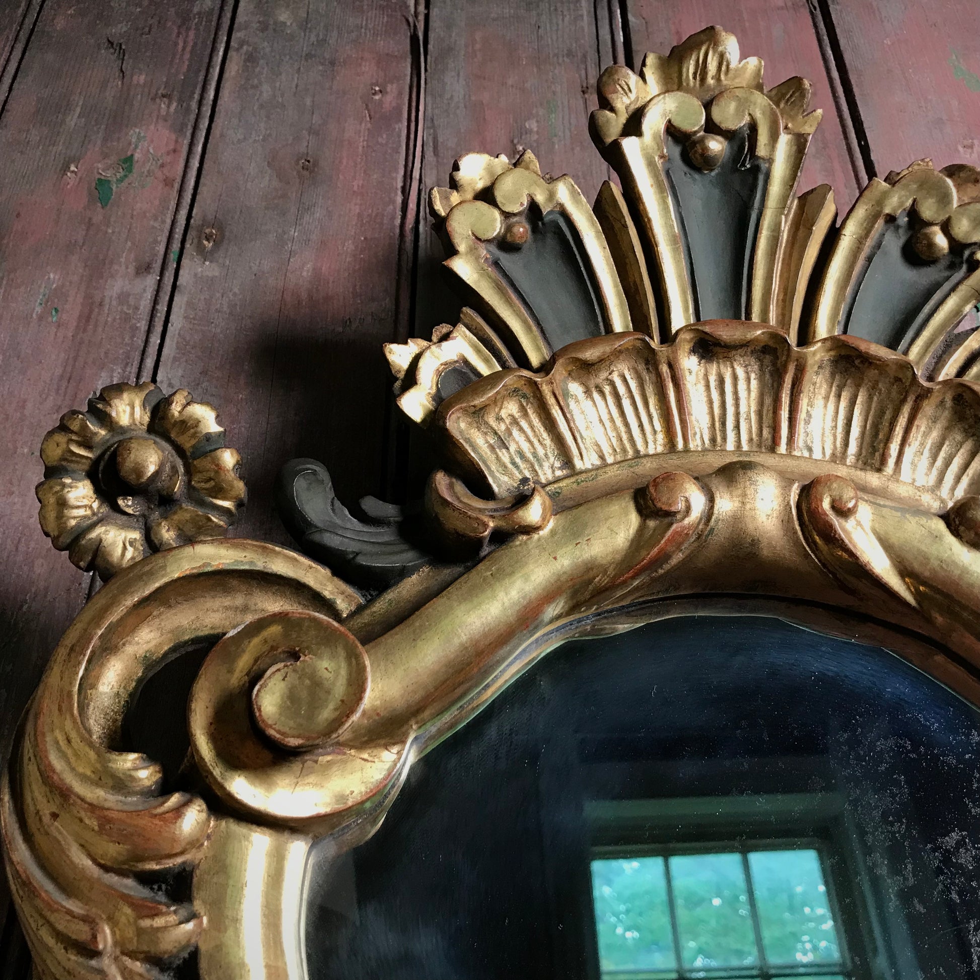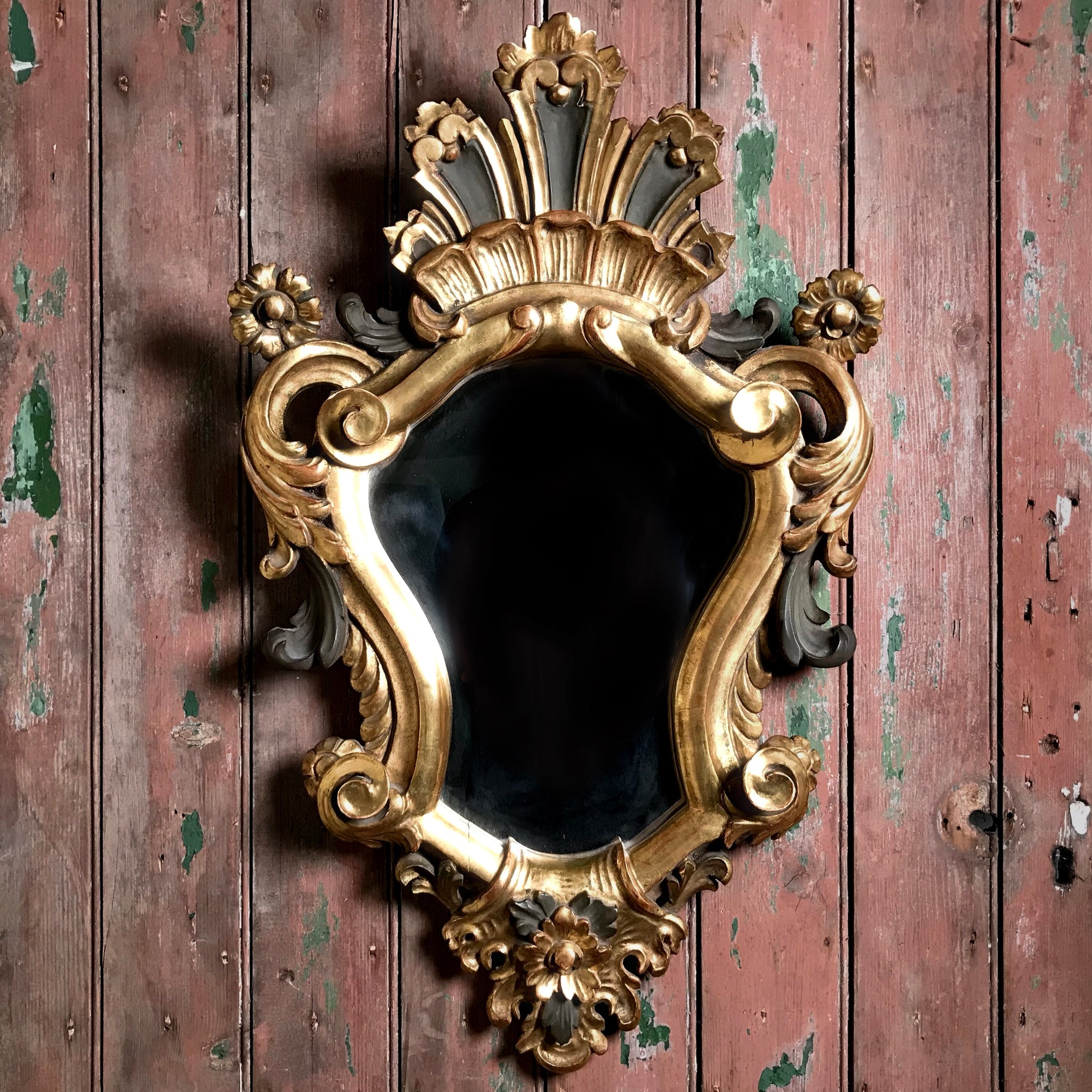A small but exuberant French giltwood wall mirror of cartouche form. Late 19th Century. The Rococo style mirror is deeply carved, water-gilded with a base of red oxide bole over a gesso ground, with polychrome accents. The heraldic shaped mirror is topped with an extravagant naturalistic shell crested top, it’s surround is composed of floral motifs and scrolled flowing acanthus leaves.