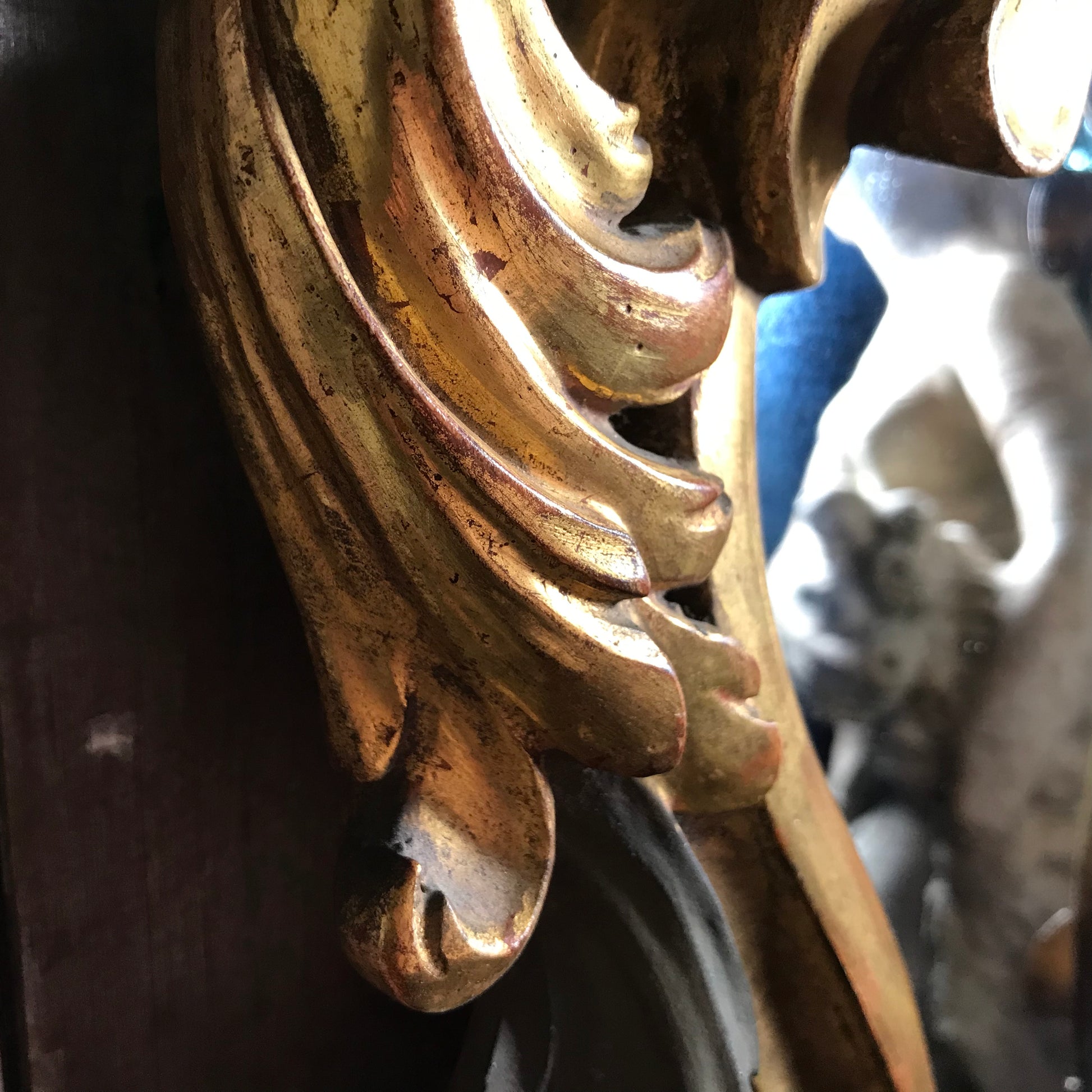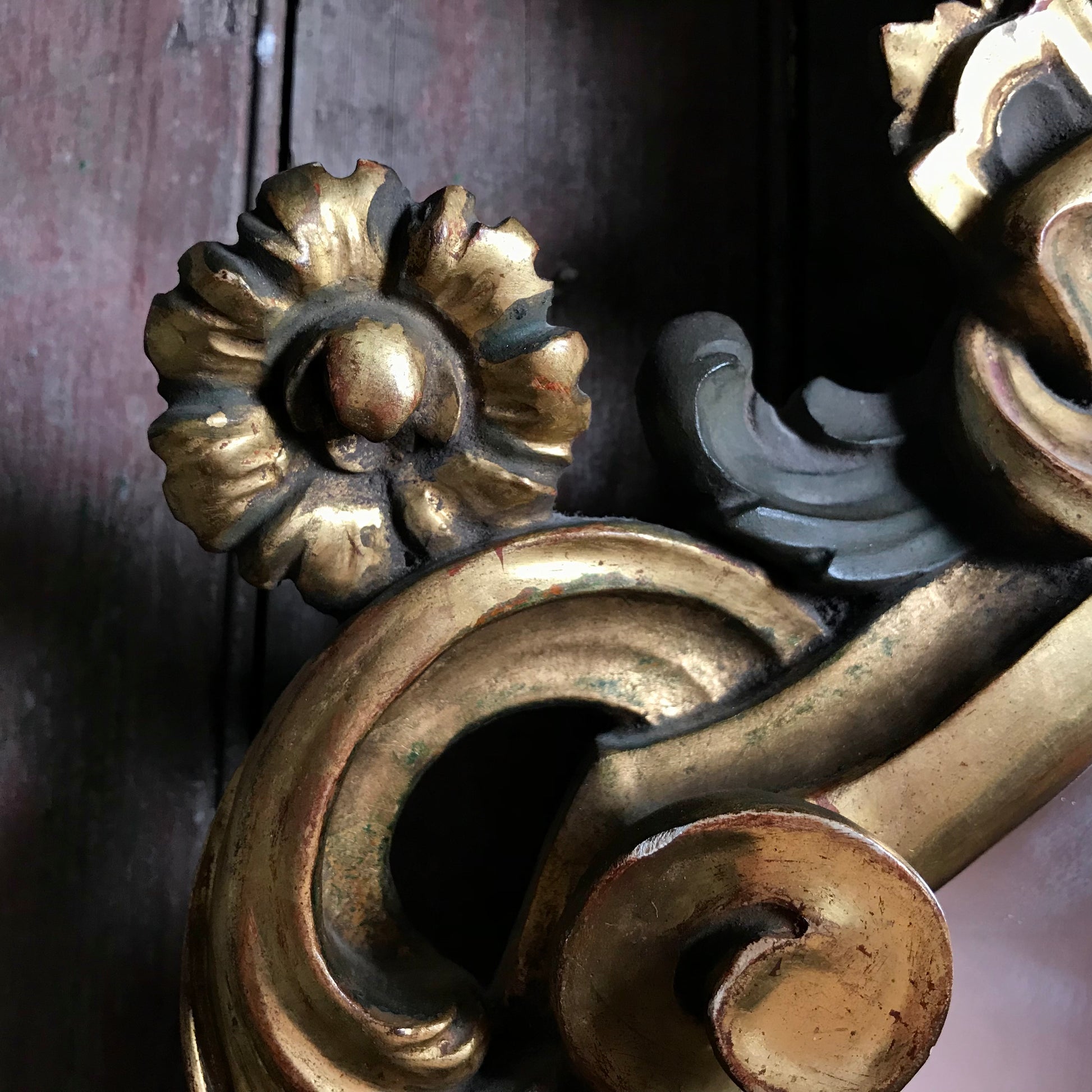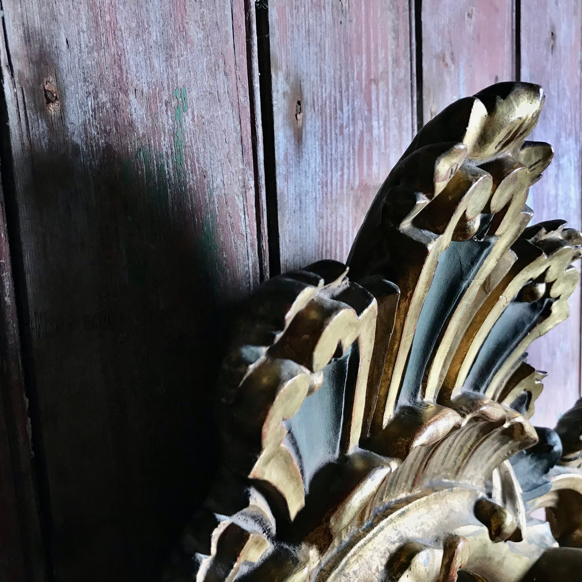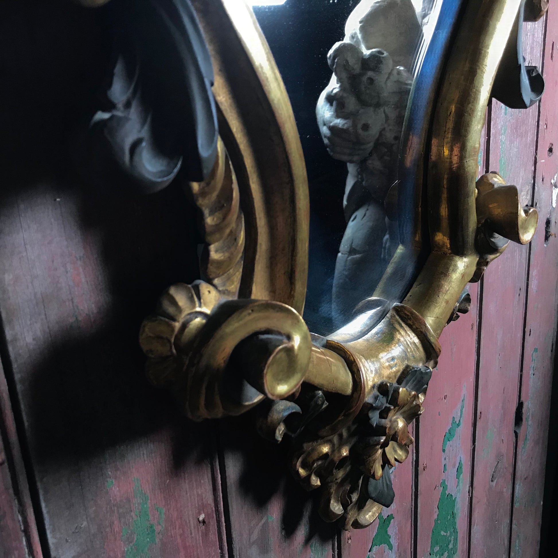 A small but exuberant French giltwood wall mirror of cartouche form. Late 19th Century. The Rococo style mirror is deeply carved, water-gilded with a base of red oxide bole over a gesso ground, with polychrome accents. The heraldic shaped mirror is topped with an extravagant naturalistic shell crested top, it’s surround is composed of floral motifs and scrolled flowing acanthus leaves.