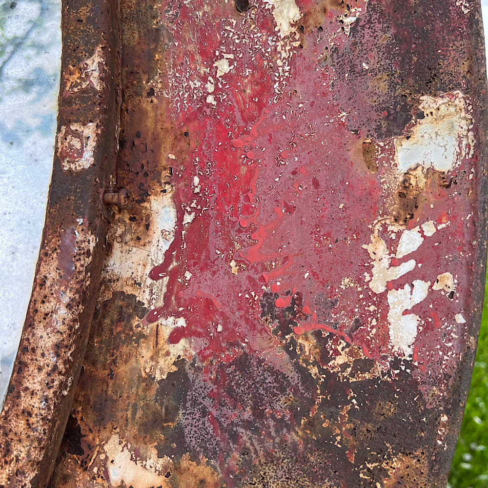 With stunning variable patina and elemental distressing to its’ convex glass surface and time worn patination to the white and red metal frame.