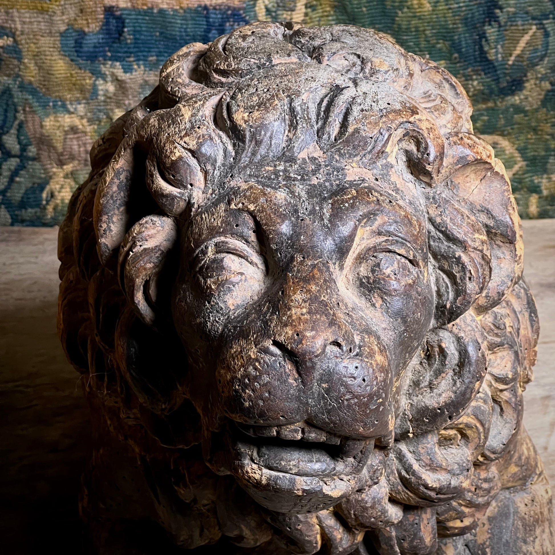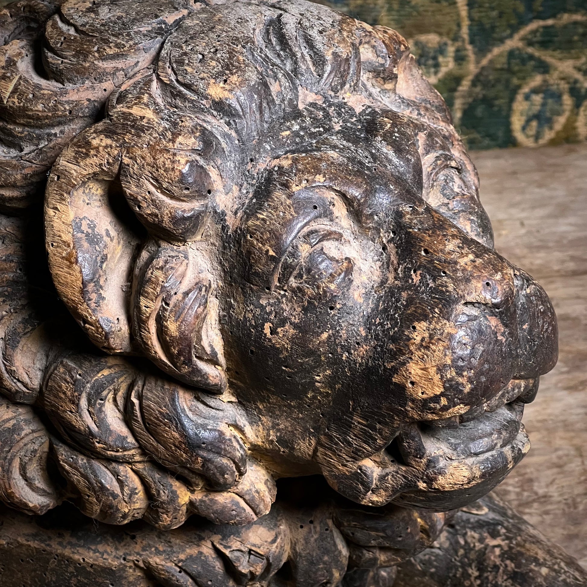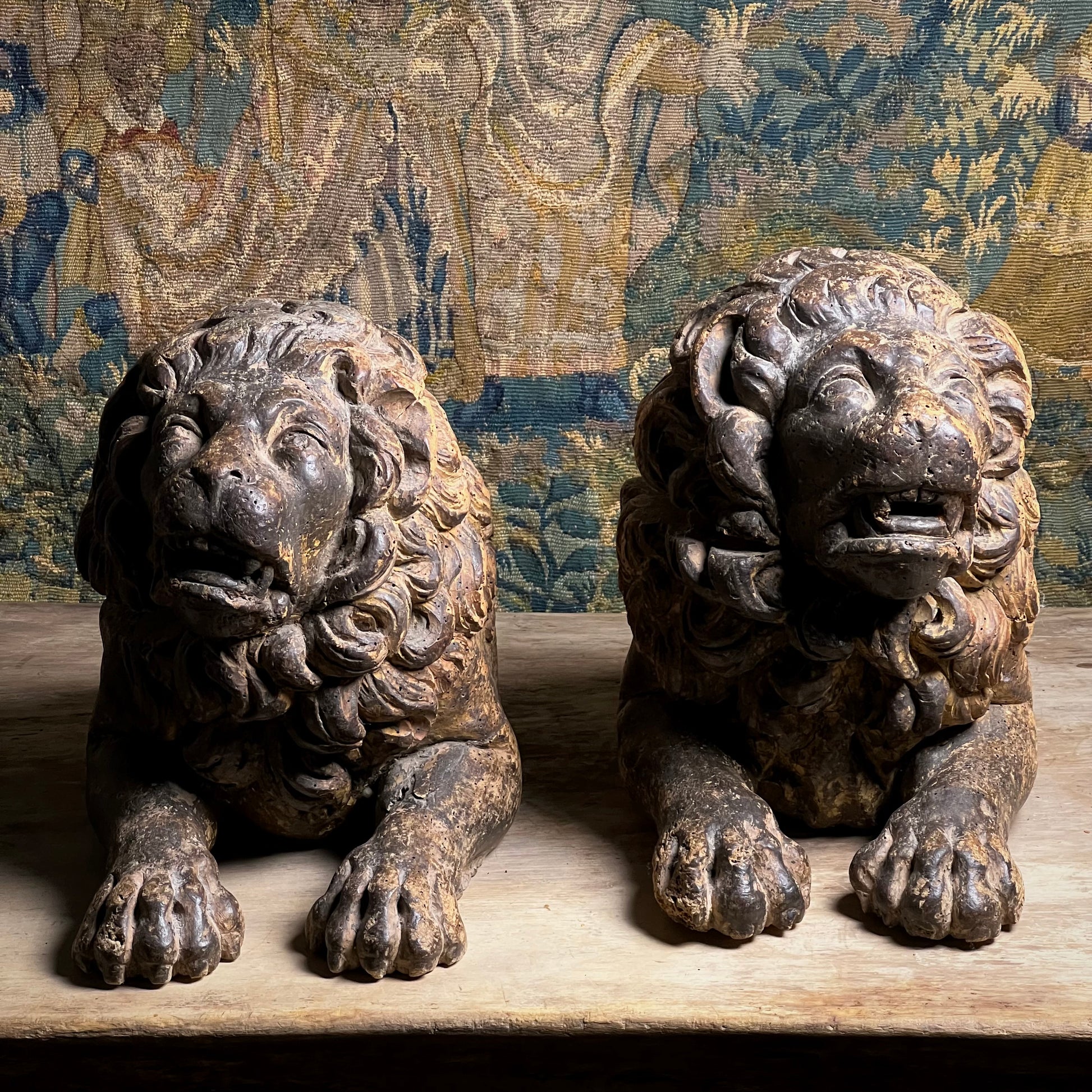 Boldly modelled as recumbent guardian lions, each figure is carved with a richly undercut, scrolling mane, heavy-lidded eyes and an expressive muzzle, creating dramatic depth and shadow in true Baroque fashion.