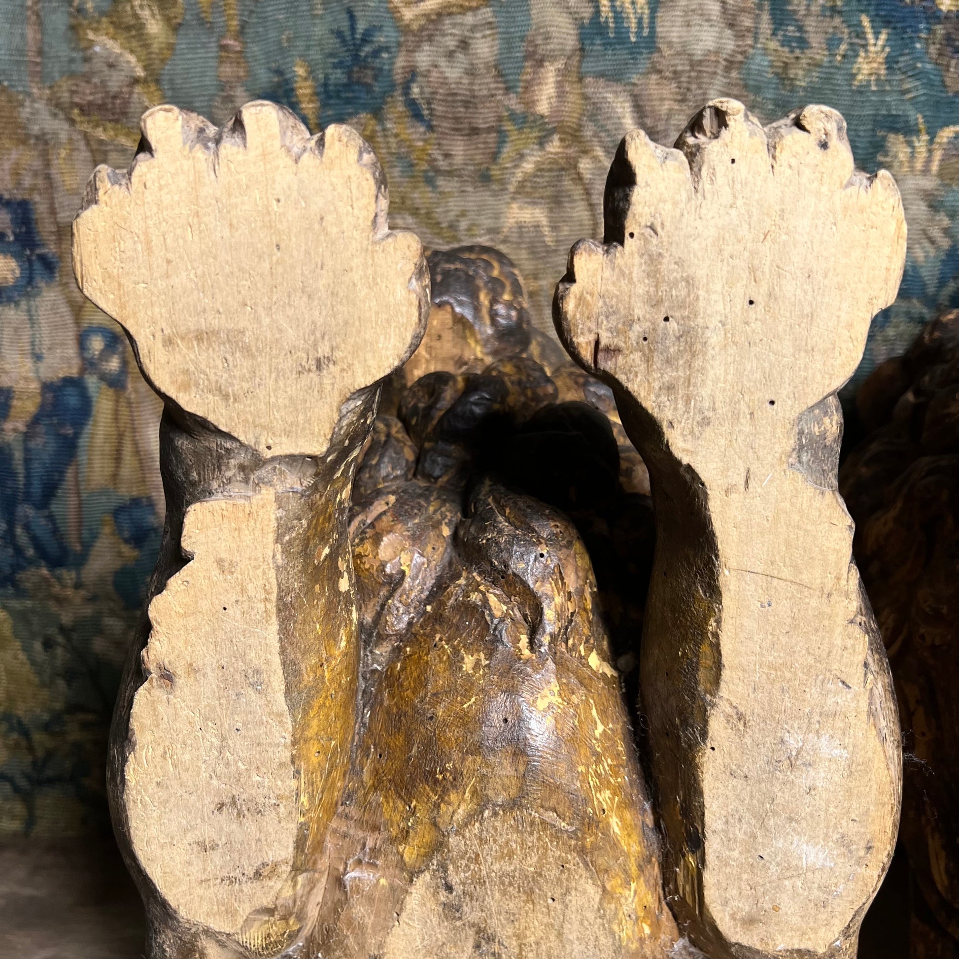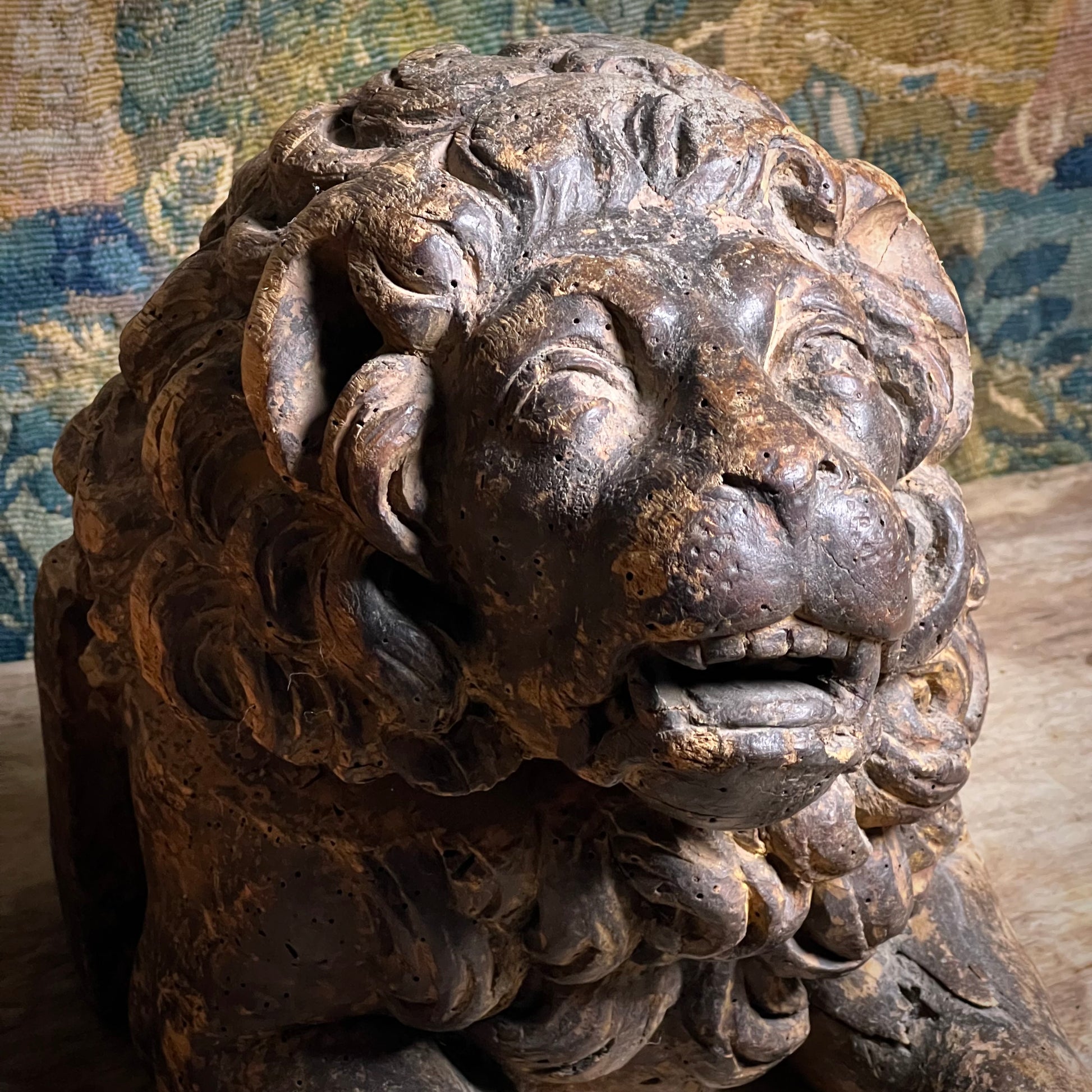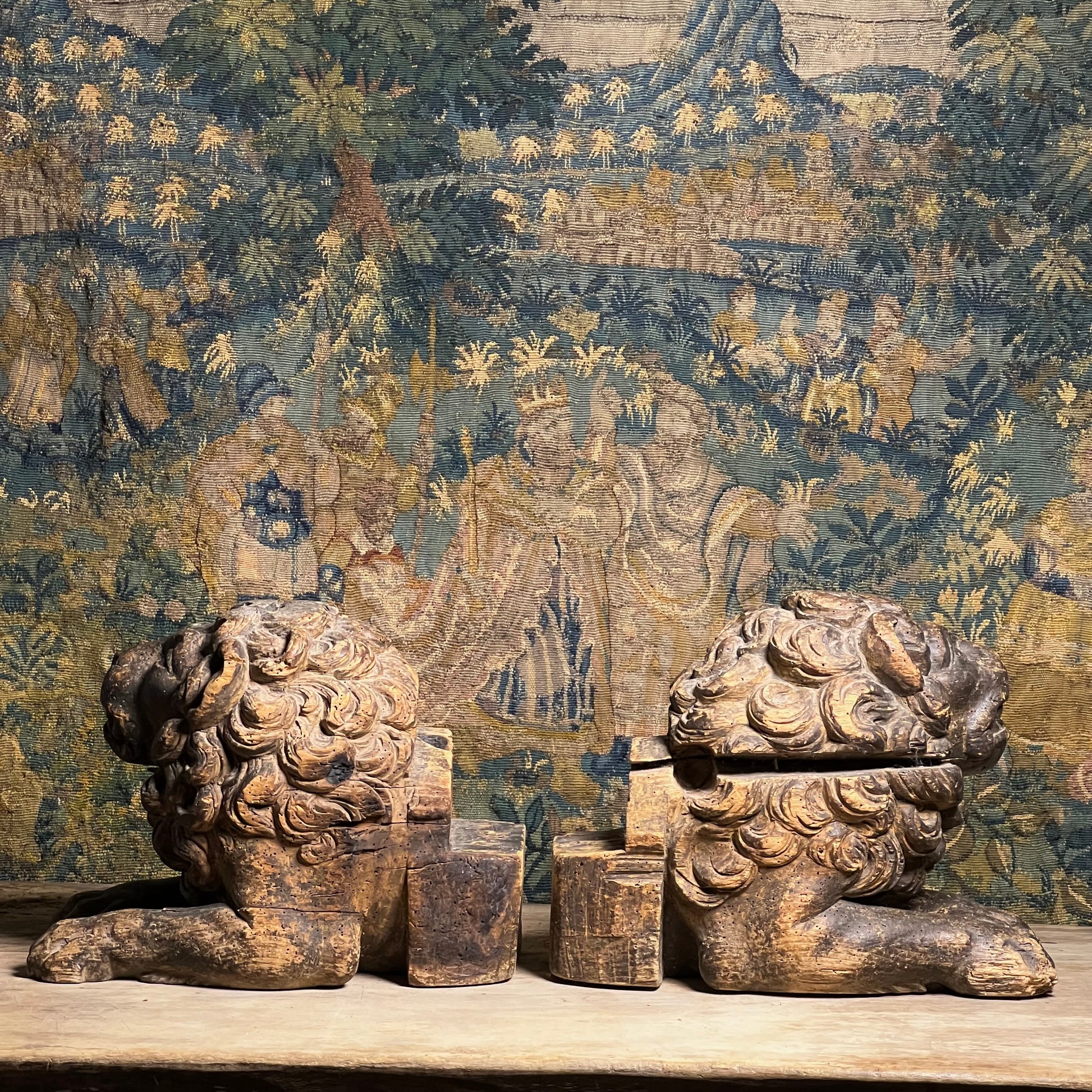 Boldly modelled as recumbent guardian lions, each figure is carved with a richly undercut, scrolling mane, heavy-lidded eyes and an expressive muzzle, creating dramatic depth and shadow in true Baroque fashion.