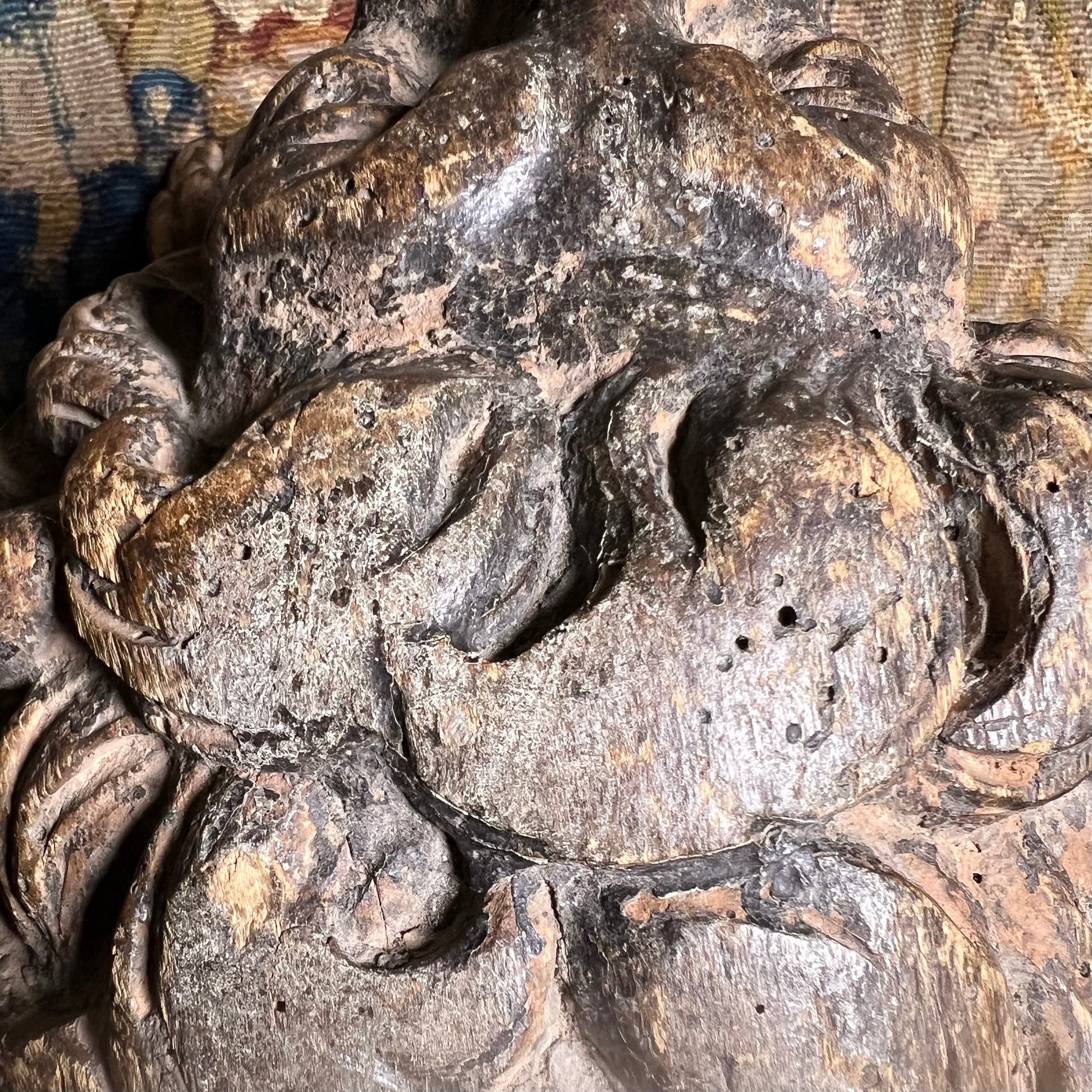 The walnut has matured to a deep, mellow tone with a wonderfully time-softened surface with remnants of polychrome.