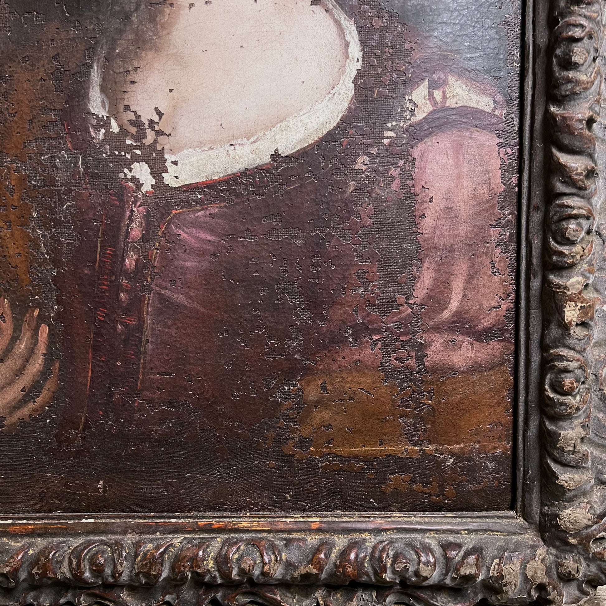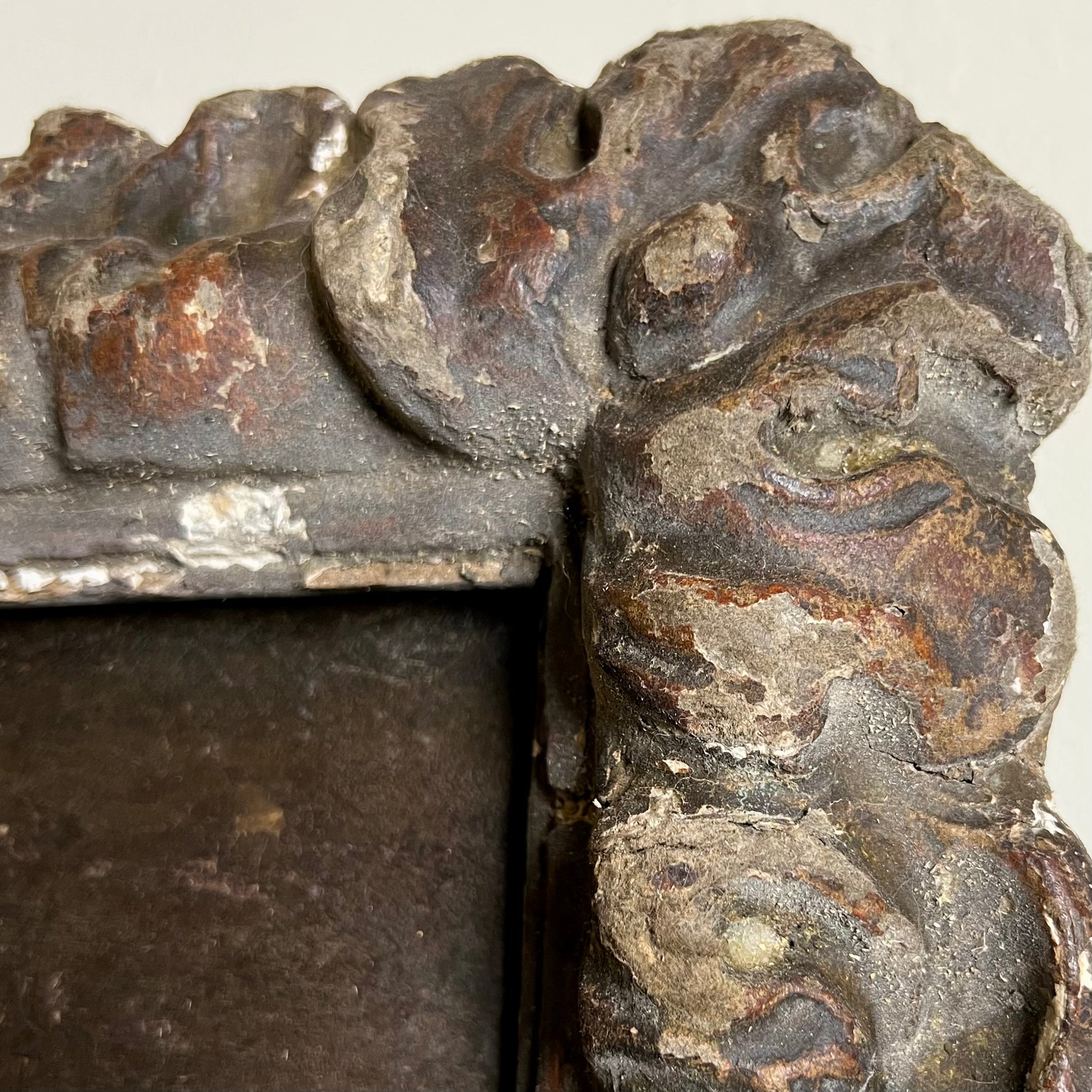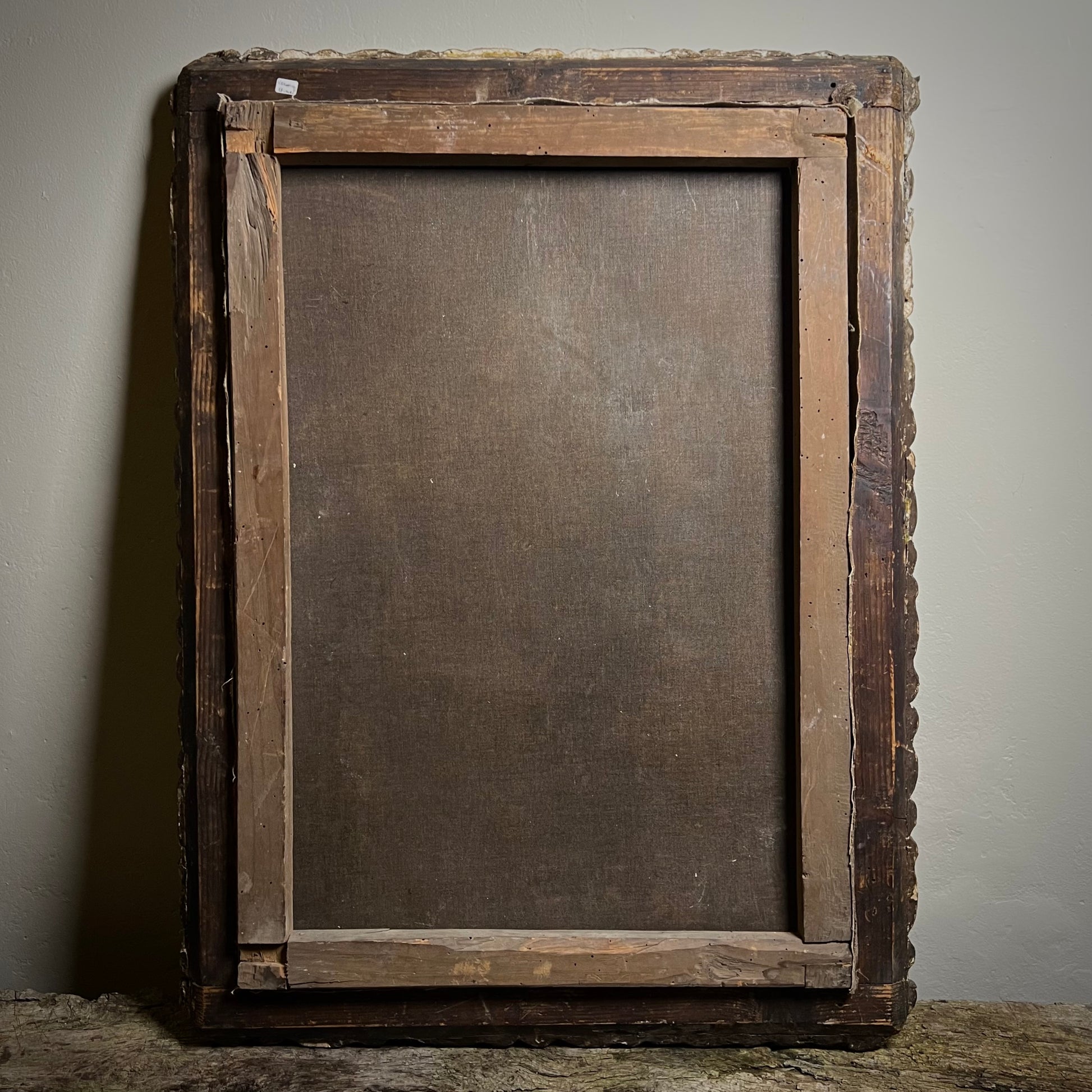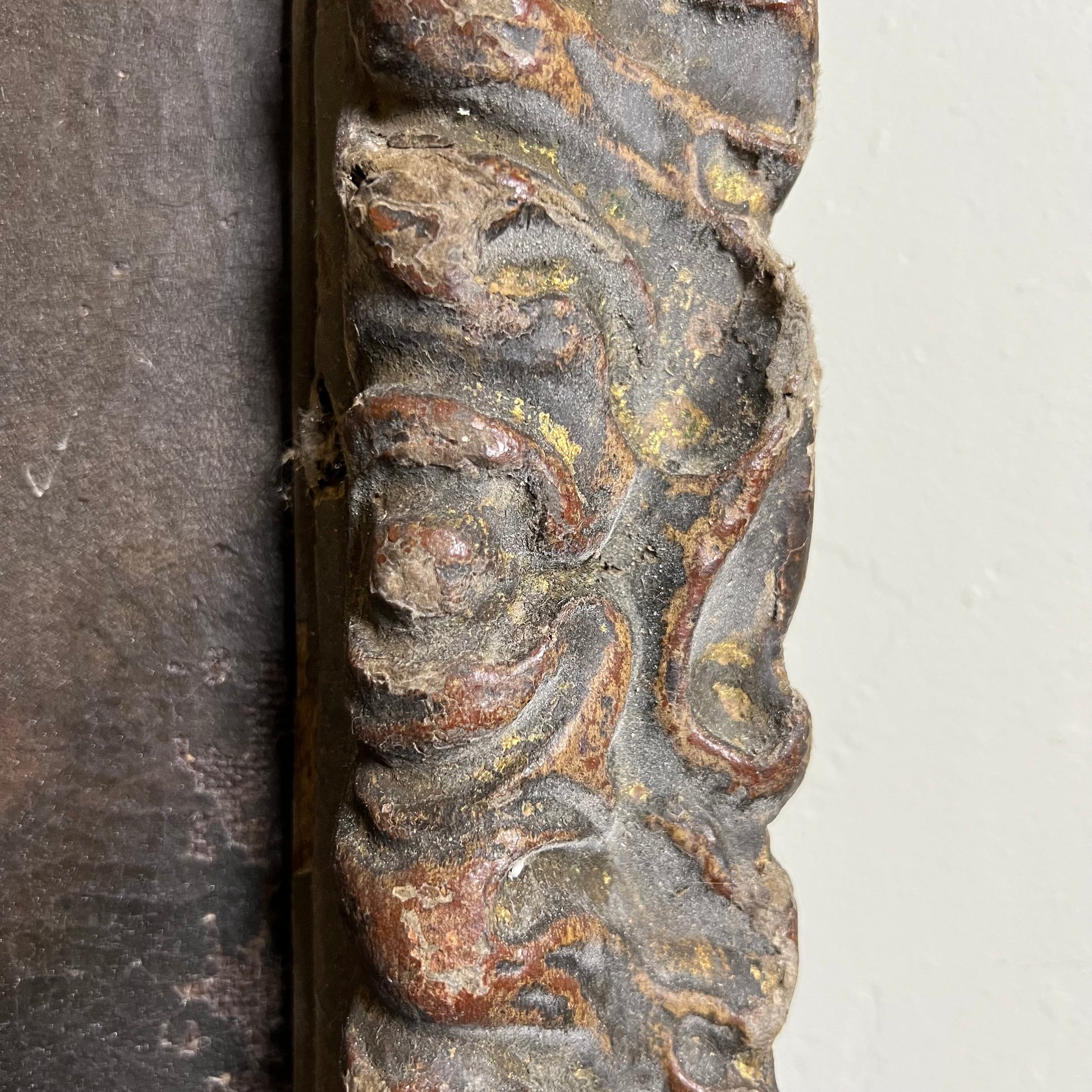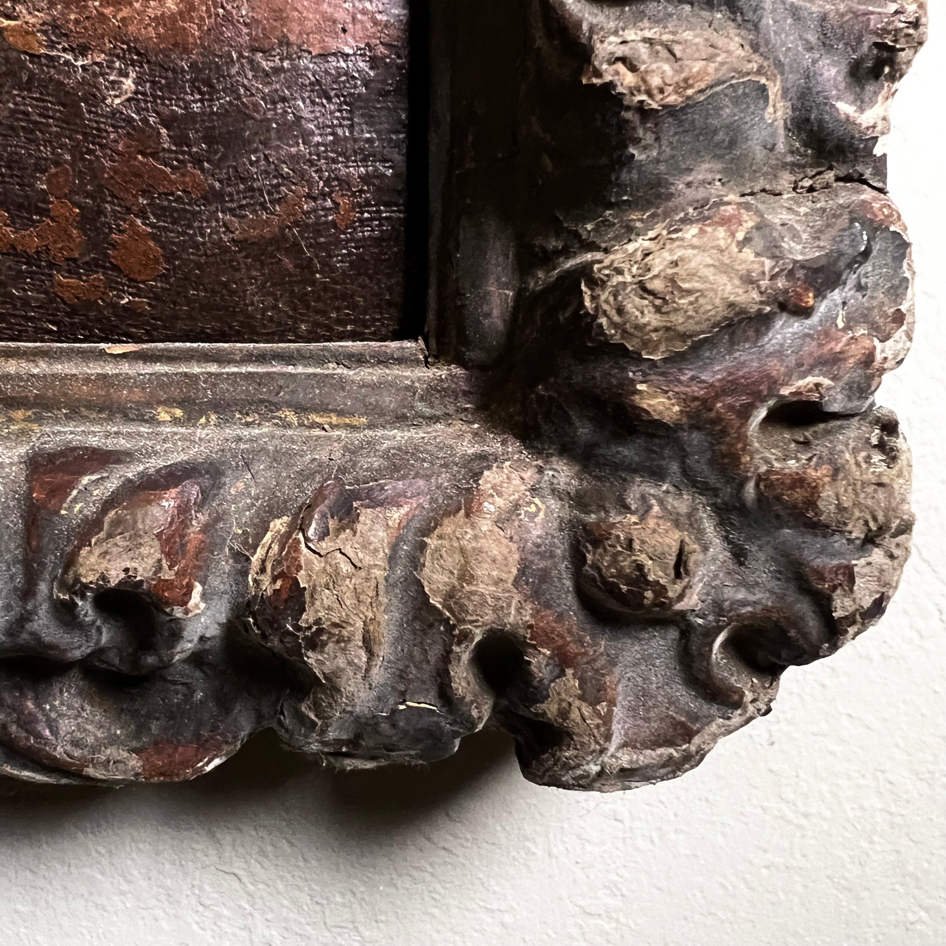 Interestingly, the painting is housed in its original papier-mâché frame Bolognese frame, a testament to the craftsmanship of the era. The frame’s intricate layered scrollwork design, characteristic of the Bolognese style, adds a layer of ornate sophistication, while its aged patina enhances the historical charm of the piece.