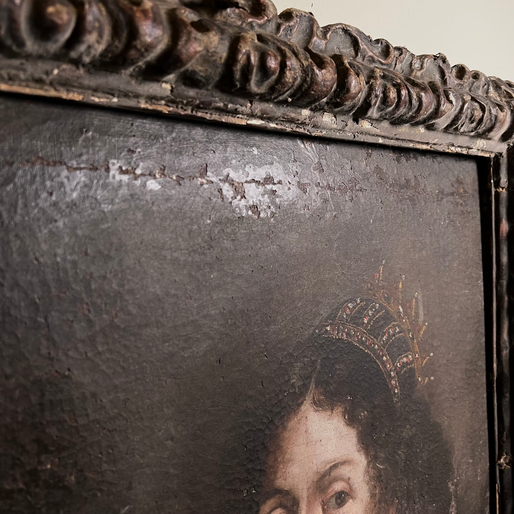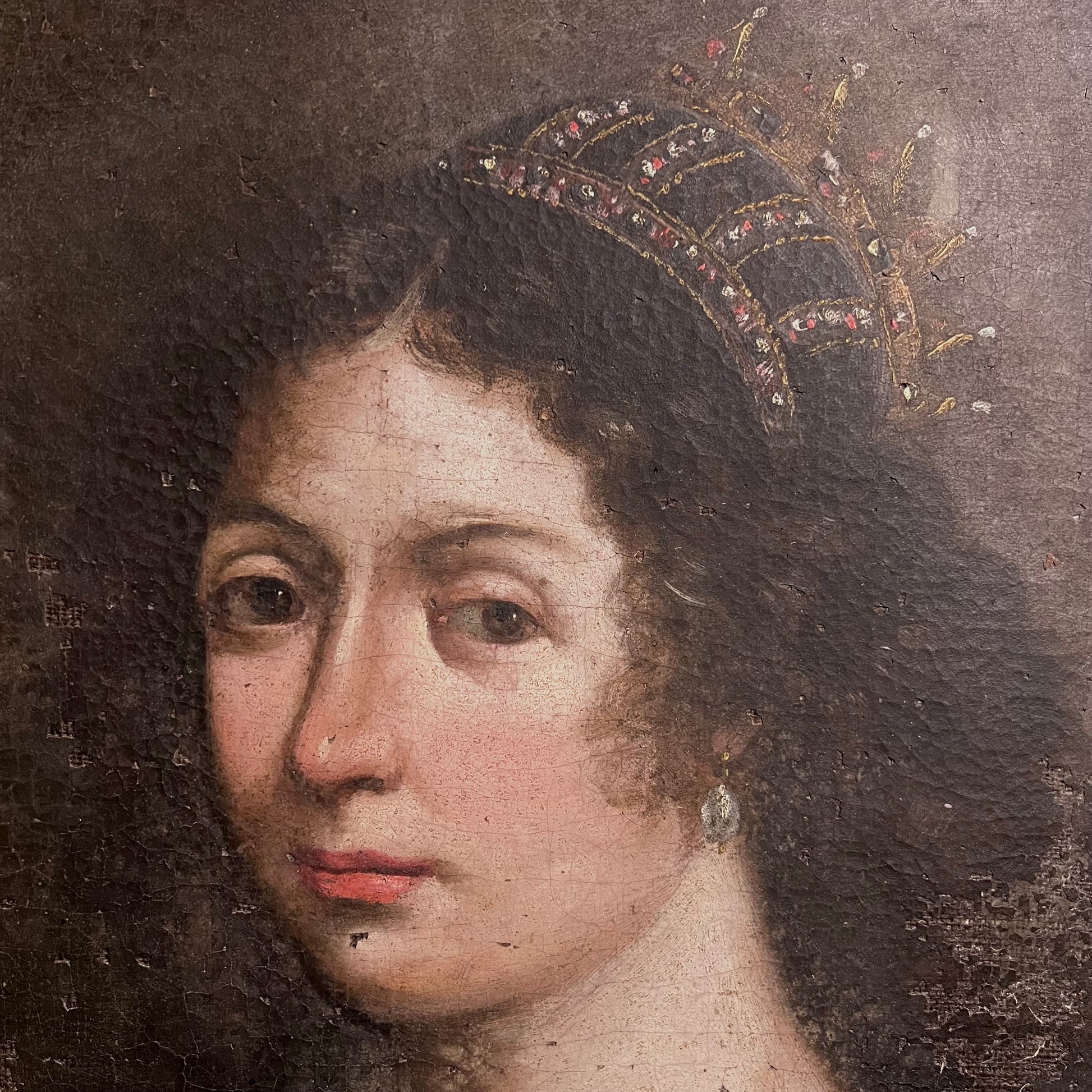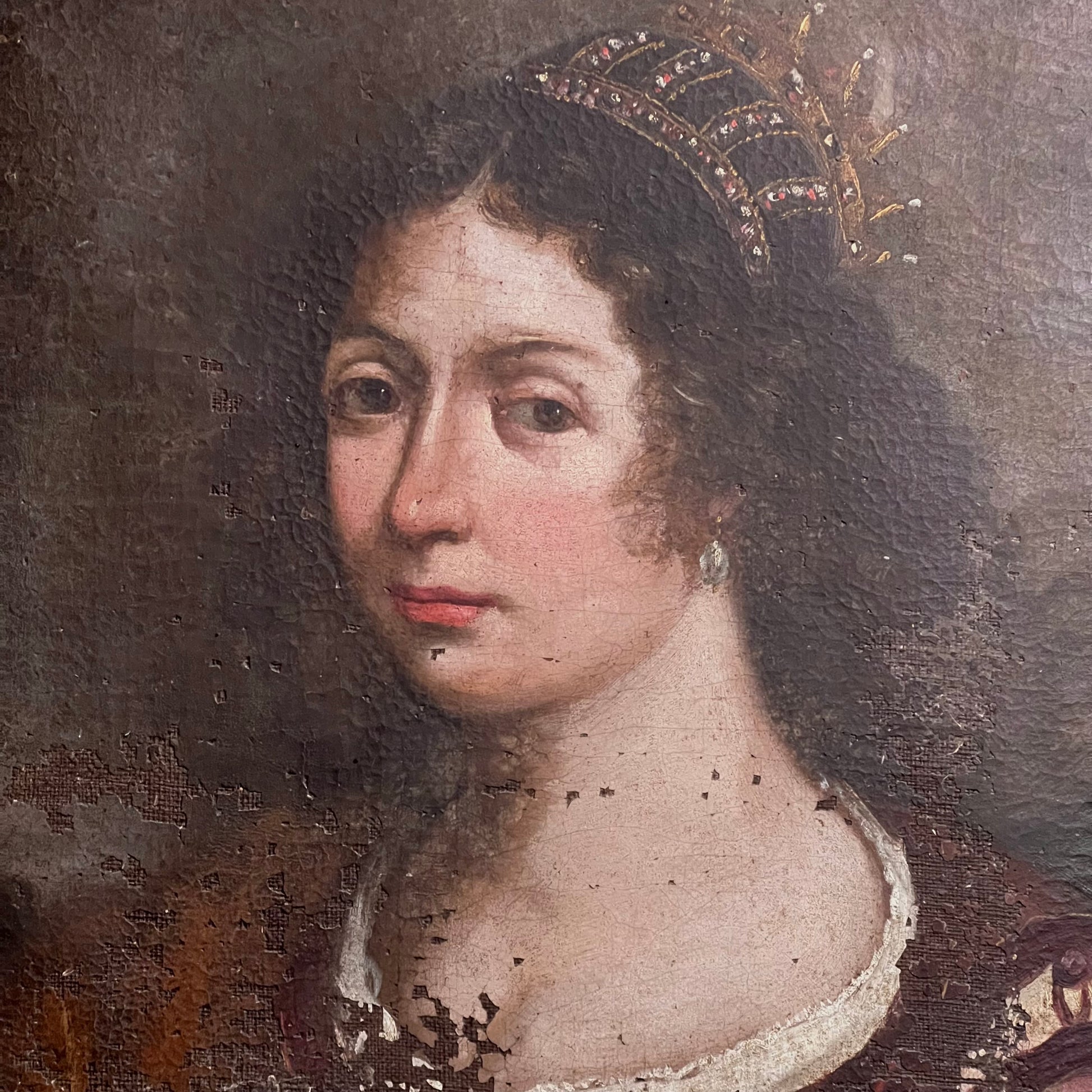 The painting is worn to a darkly mysterious patination, yet the depiction of her face shows exceptional skill and attention to detail. Her delicate features are beautifully captured, from the soft blush of her cheeks to the intricate highlights in her hair, and the shimmering rendition of her crown and jewellery.