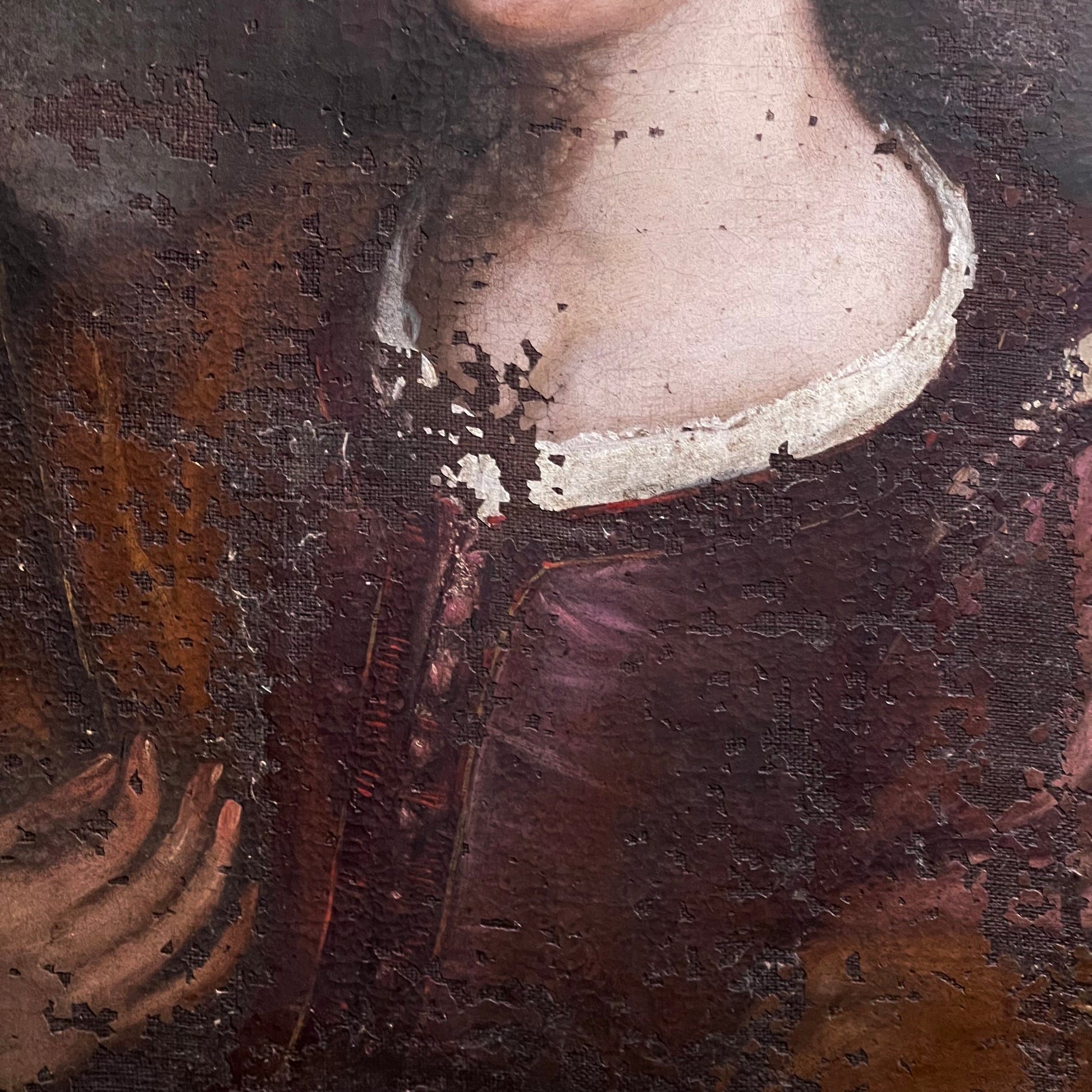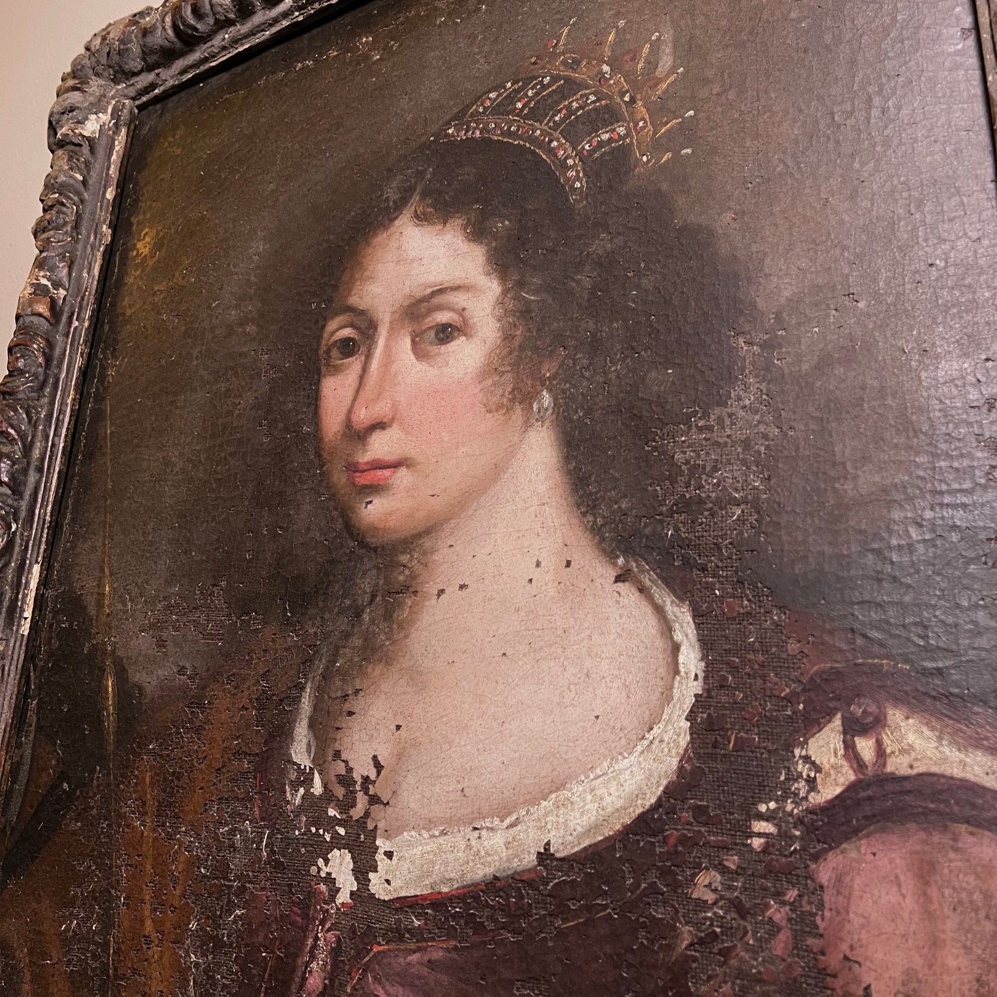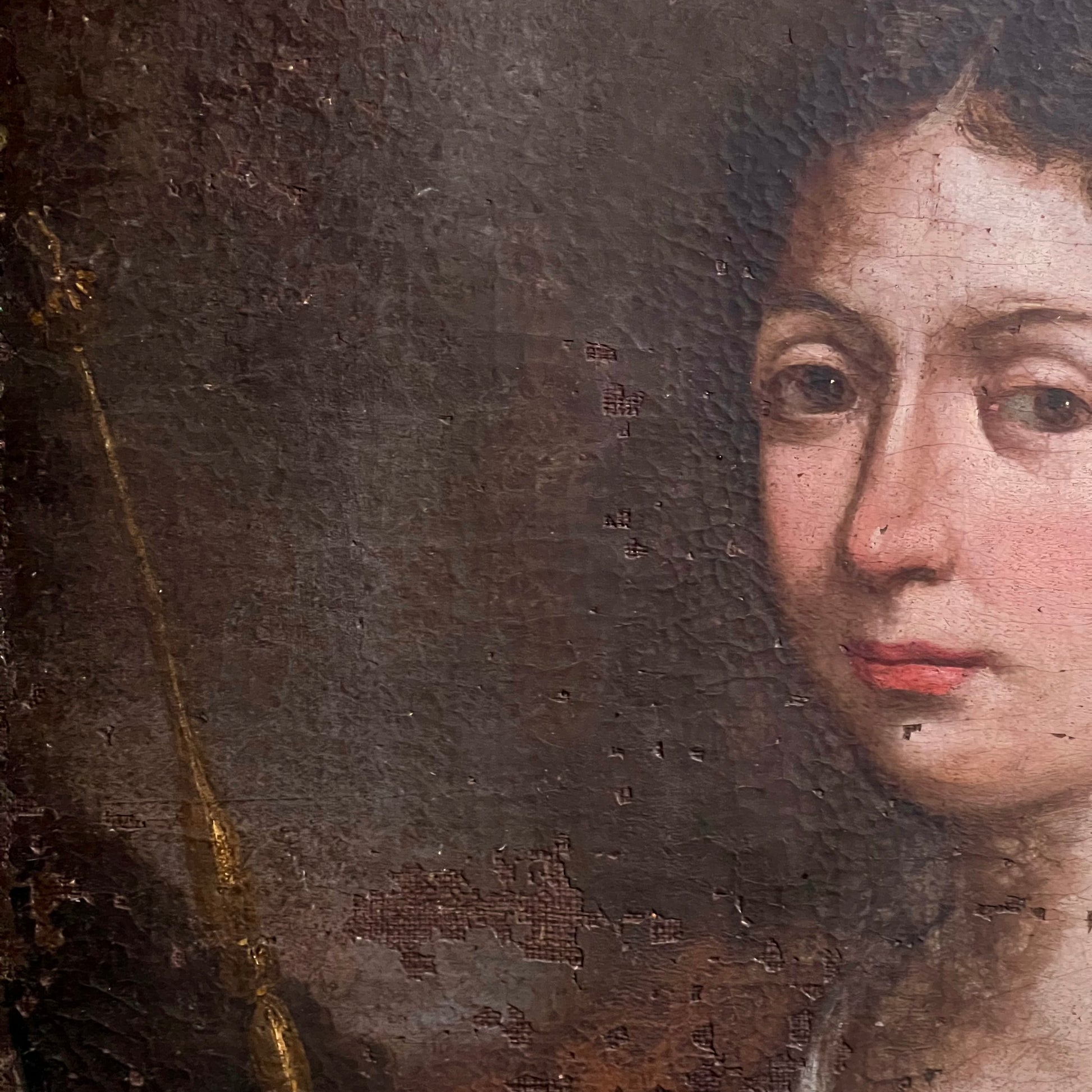 The painting is worn to a darkly mysterious patination, yet the depiction of her face shows exceptional skill and attention to detail. Her delicate features are beautifully captured, from the soft blush of her cheeks to the intricate highlights in her hair, and the shimmering rendition of her crown and jewellery.