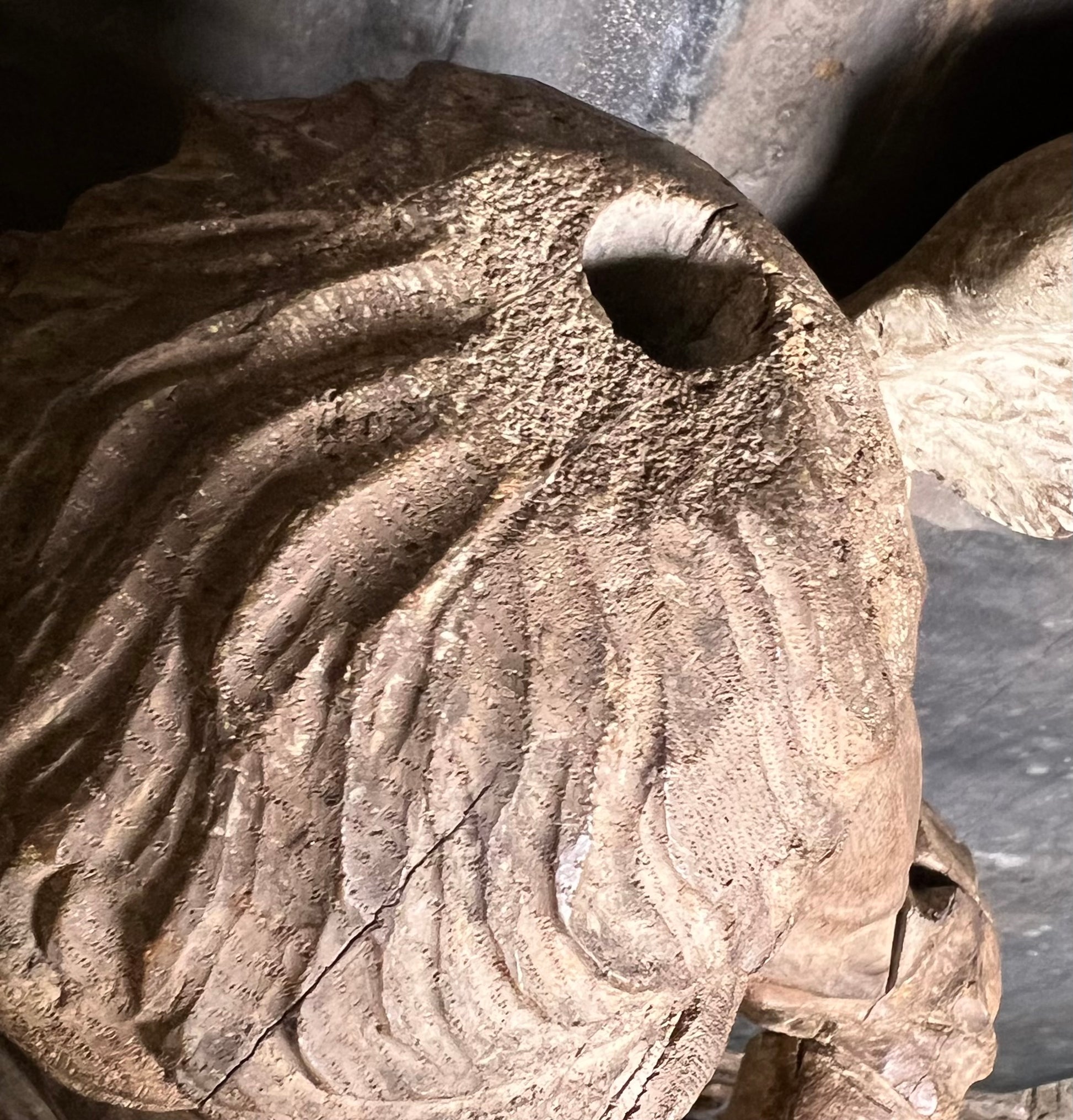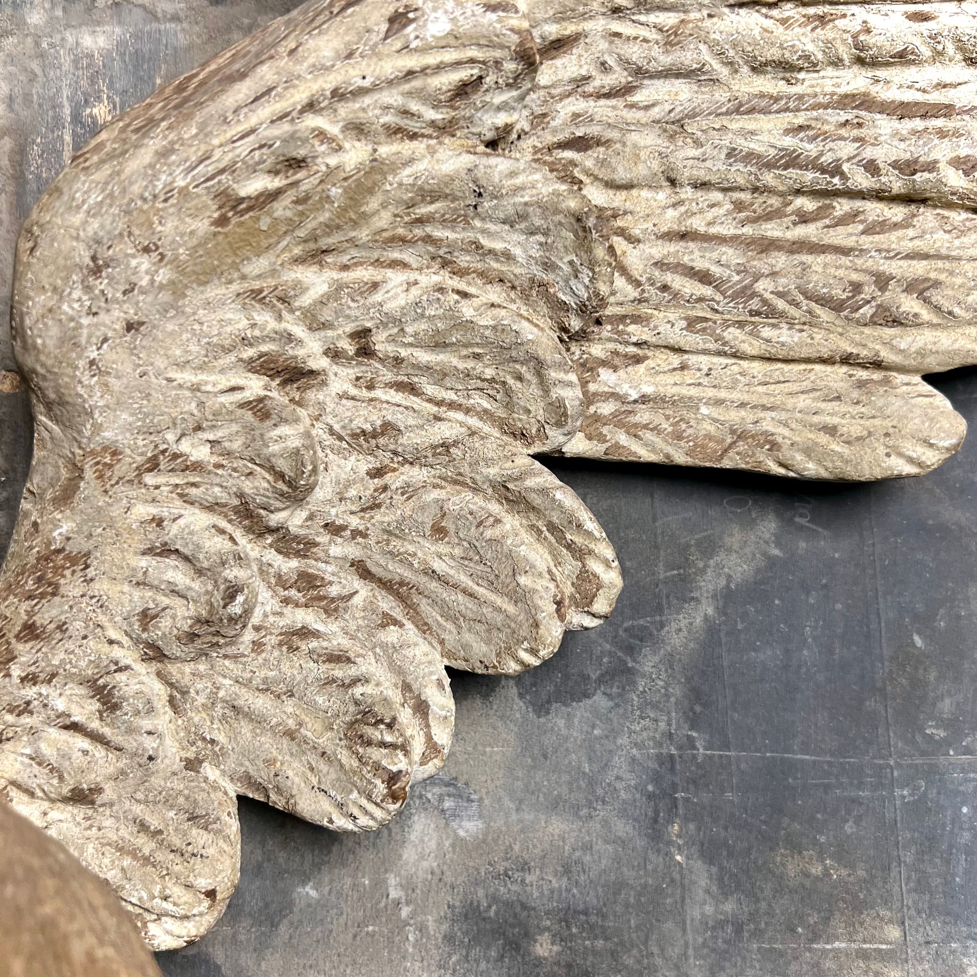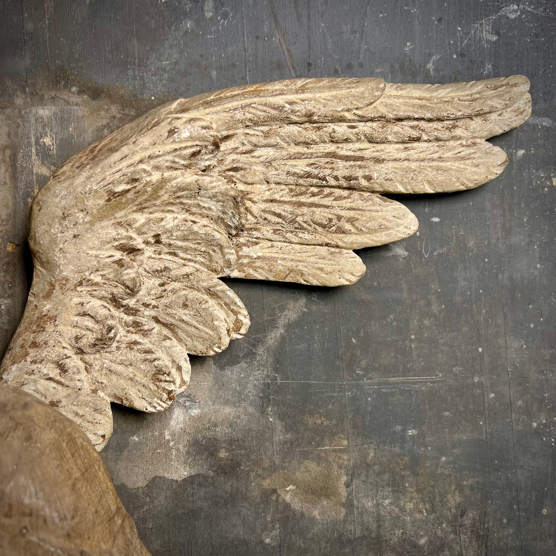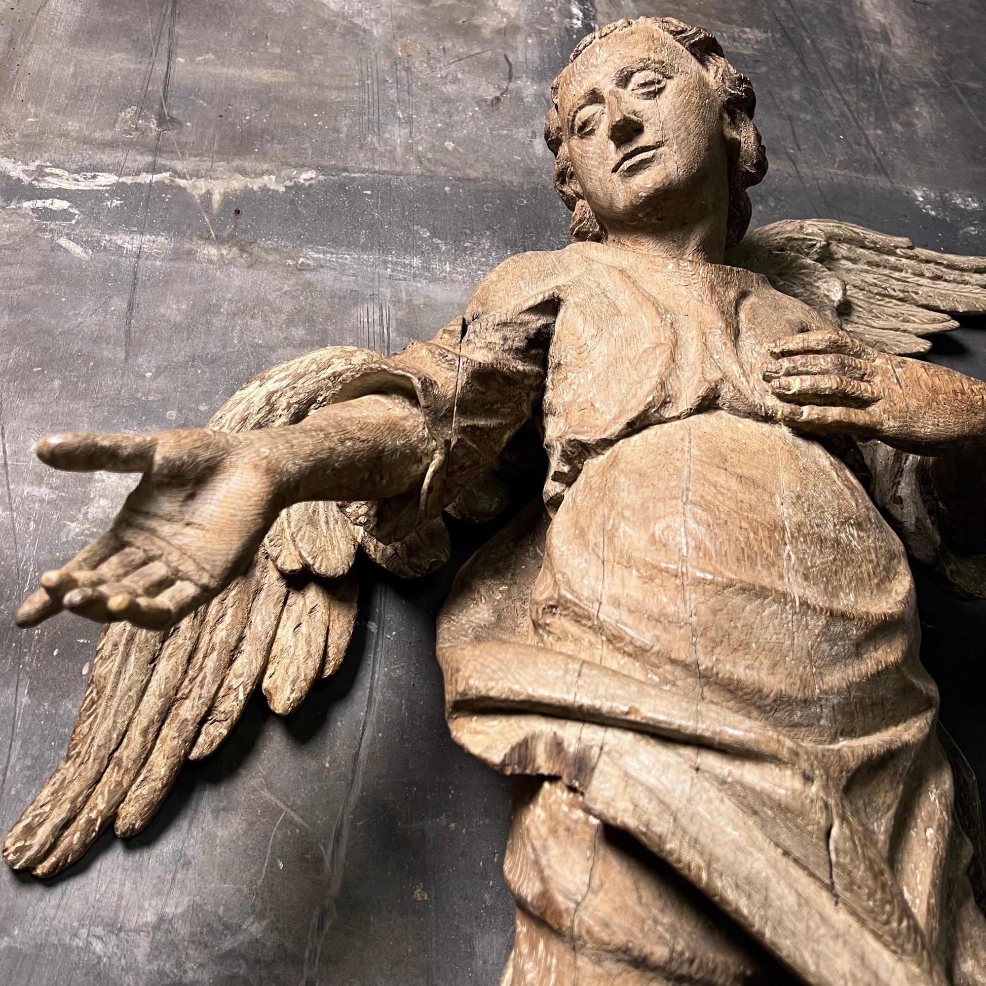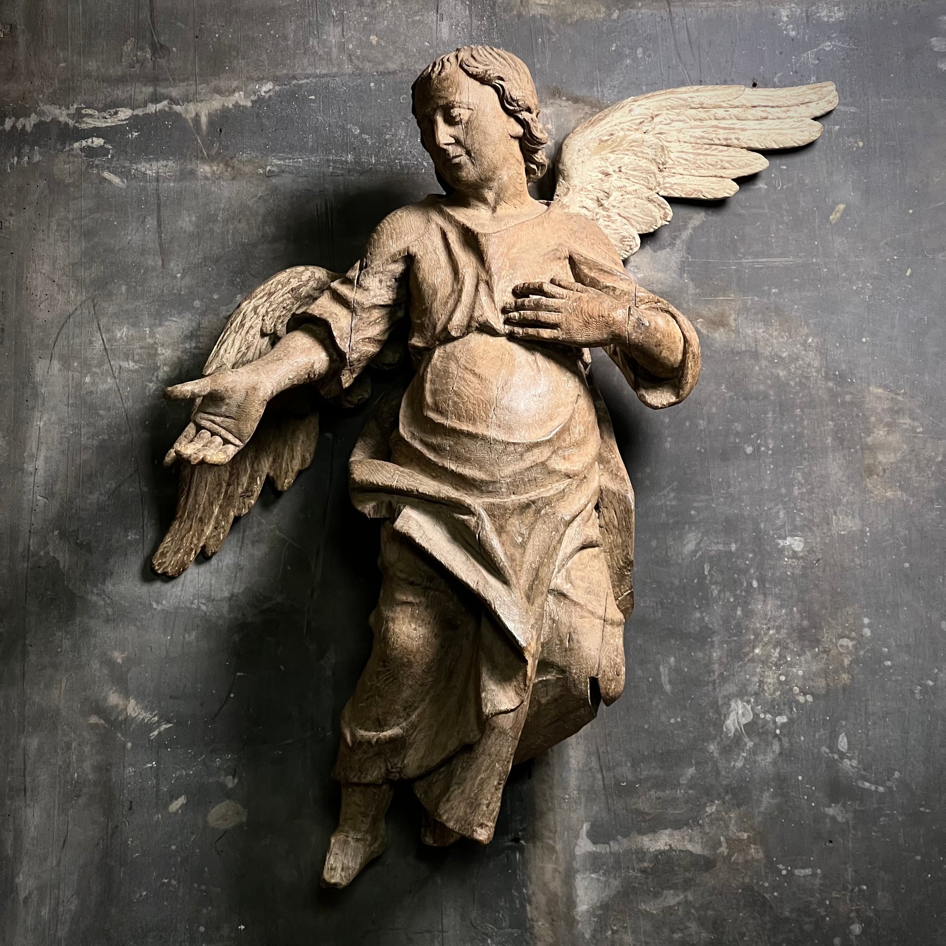 The angel survives in a complete state, retaining its original hands, feet, and wings — an increasingly rare feature for sculpture of this type. The hair is formed in thick, rhythmic locks, lending weight and balance when viewed in elevation, while the flowing drapery and extended wings create a magical sense of movement and lightness.