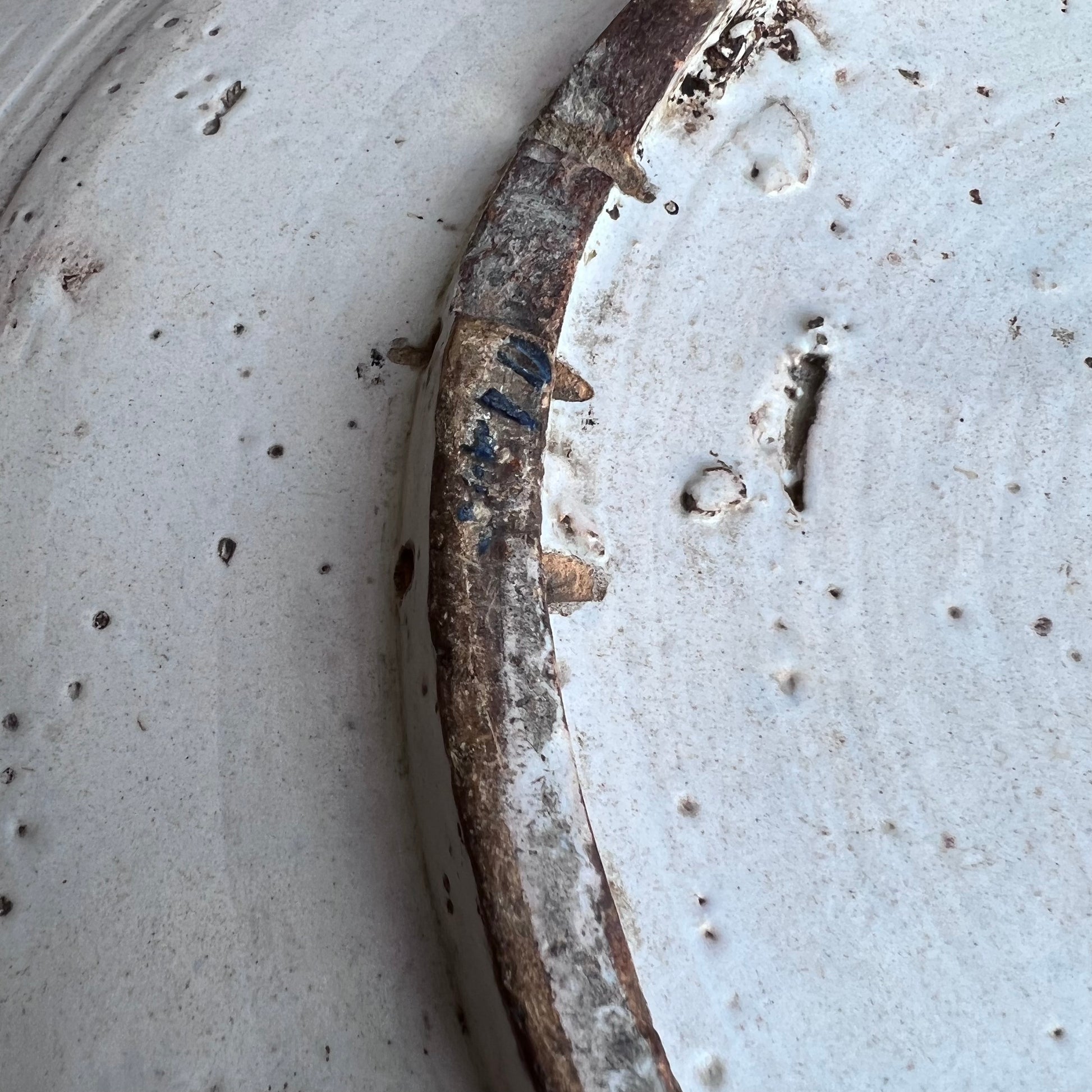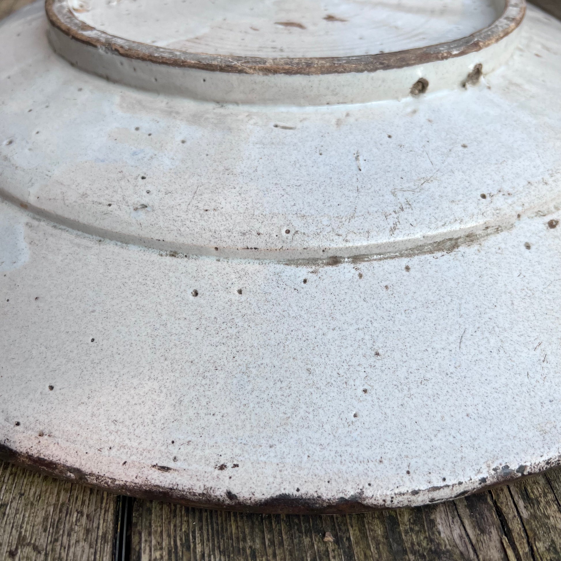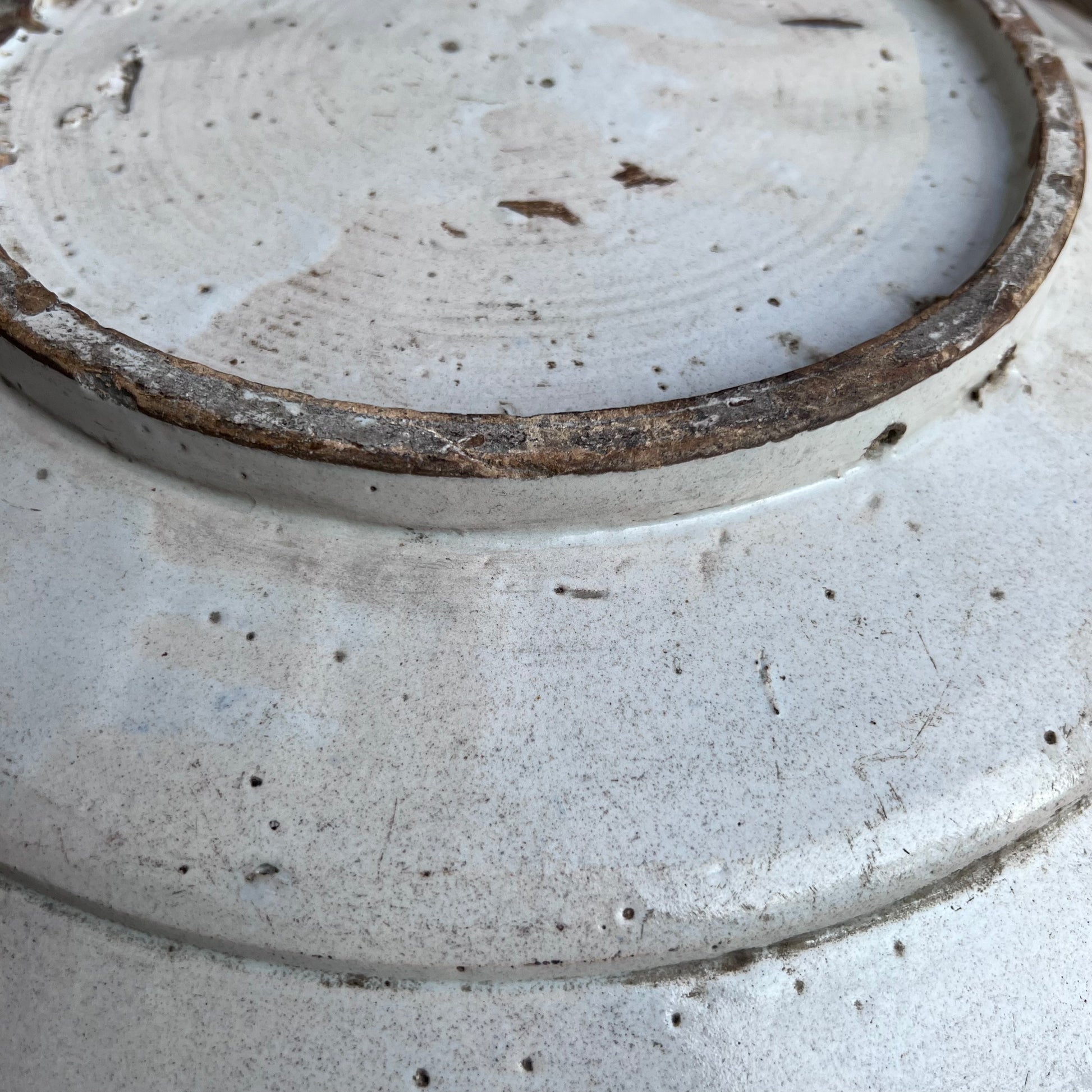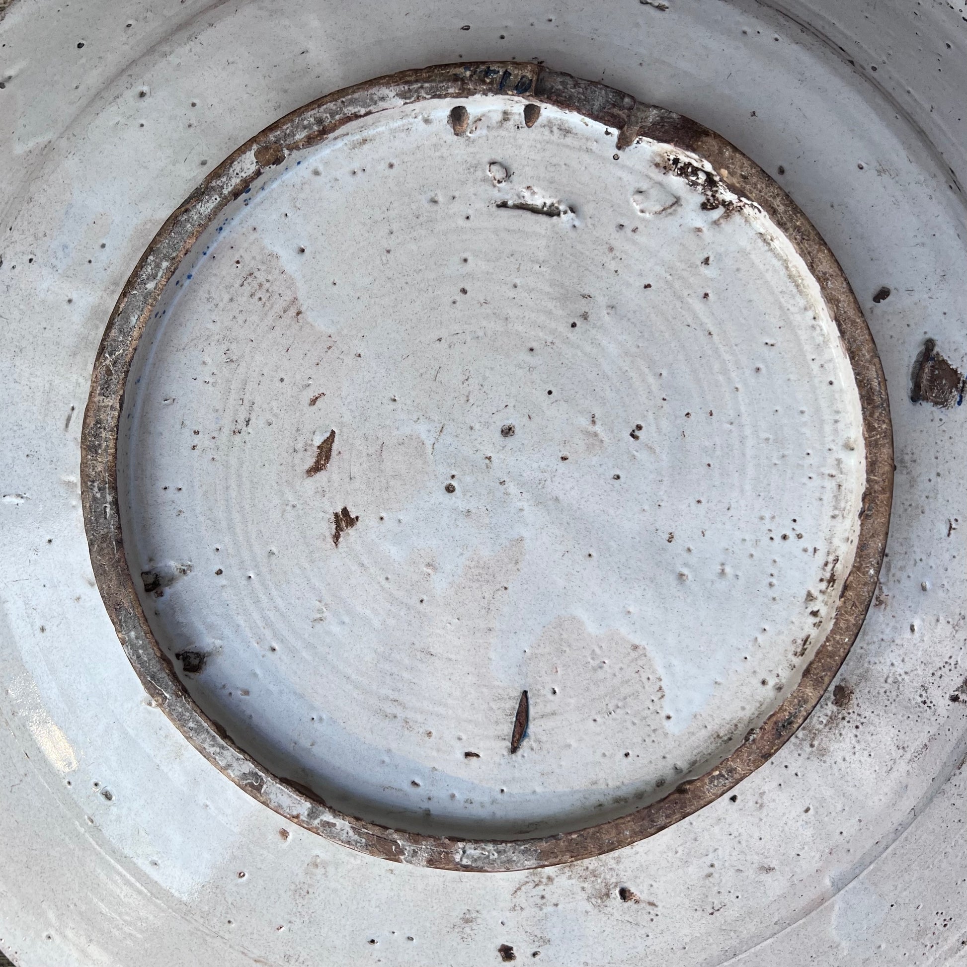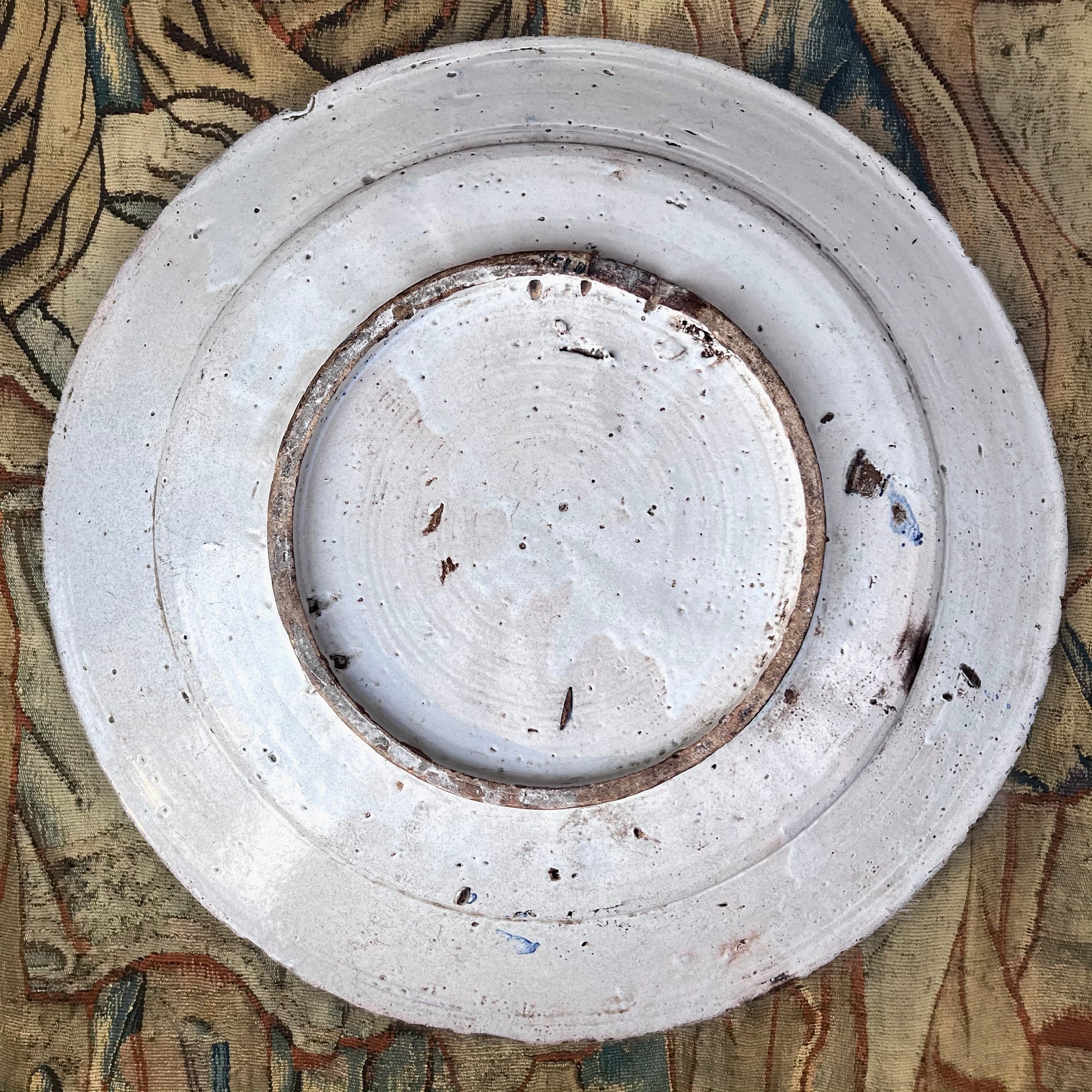 Much is painted in medium blue and outlined in deeper cobalt blue. The deep charger is white tin-glazed earthenware.