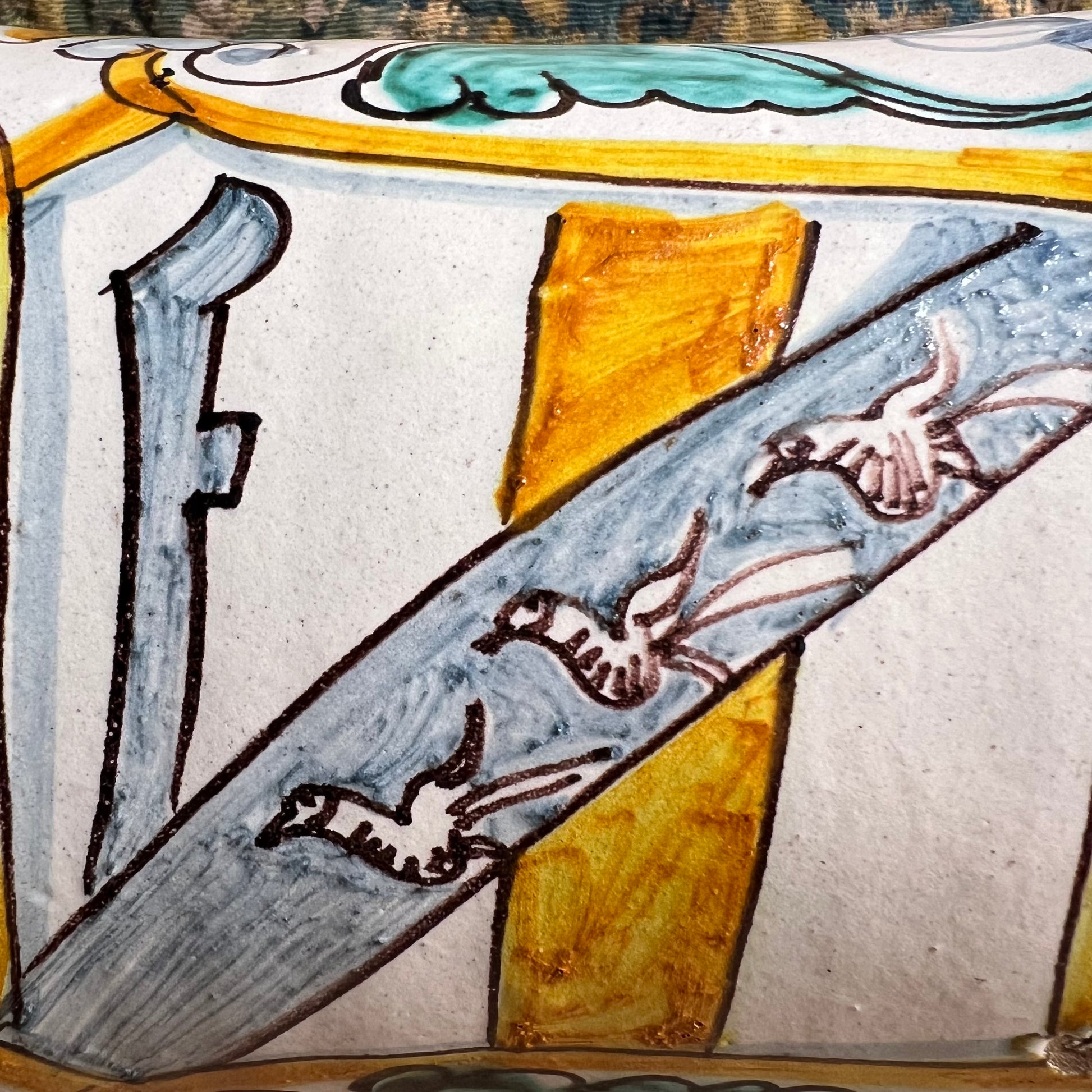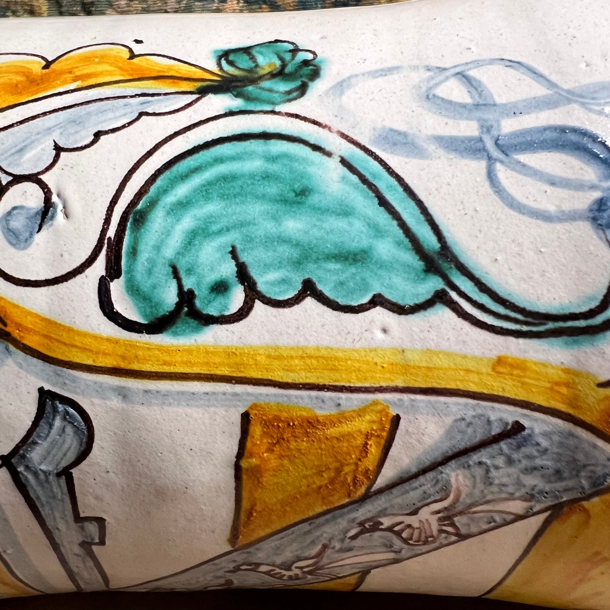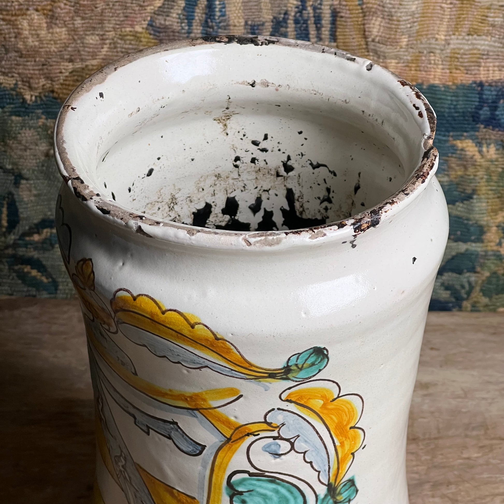 This impressive and well-proportioned Albarello from Montelupo c.1690-1720 is boldly decorated with a hand-painted heraldic shield, centred by a diagonal band featuring bird motifs and surmounted by a crown-like flourish. The shield is framed by flowing foliate scrolls, freely painted in warm ochre yellow, soft blue-grey and touches of copper green, all defined with manganese outlining on a creamy white tin-glazed ground.