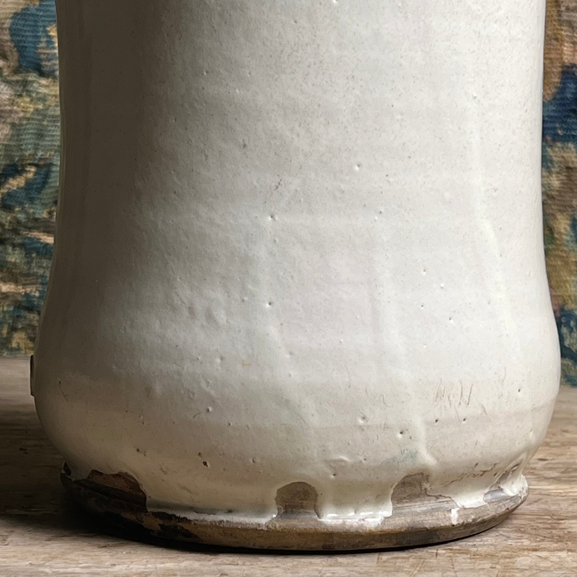 The tall cylindrical body and gentle waisting characteristic of early Montelupo pharmacy jars, intended for practical use within an apothecary setting. The glaze displays the subtle pooling, pin-pricking and irregularities associated with hand-thrown Tuscan maiolica of this period.