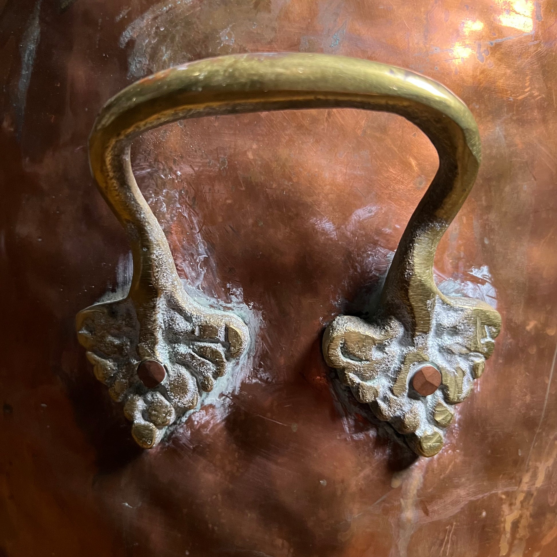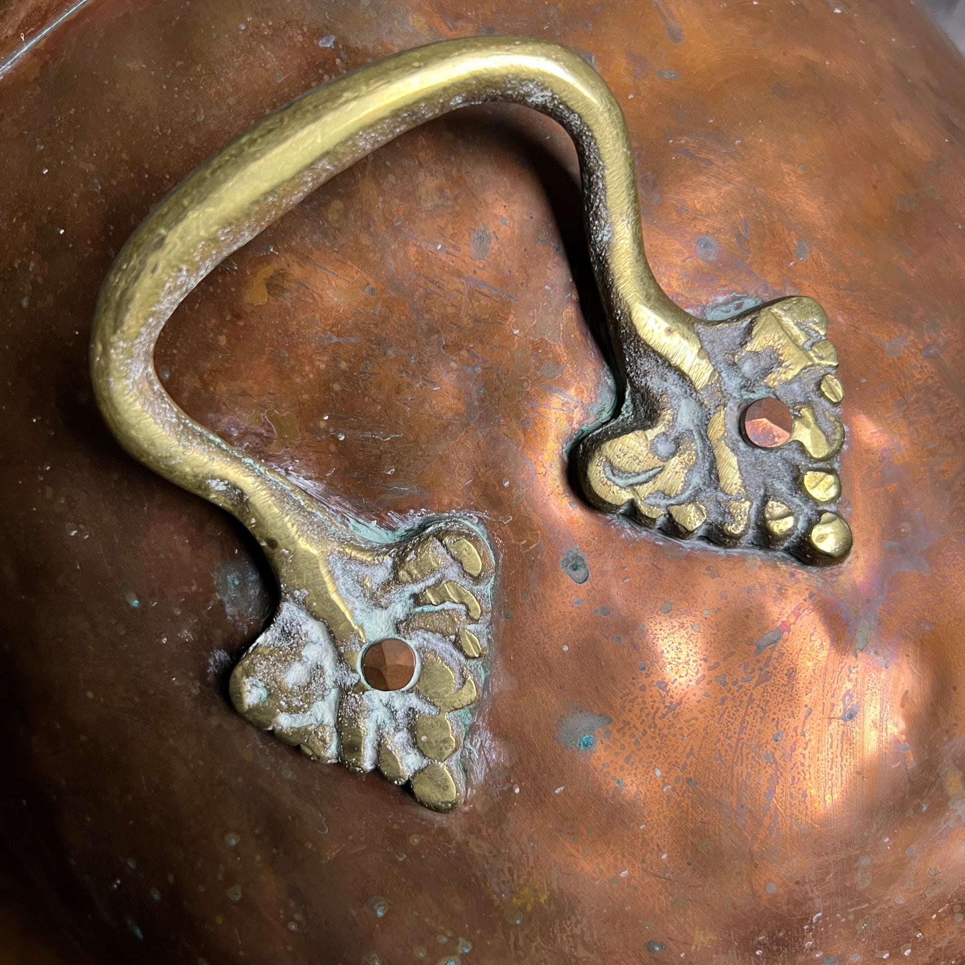 The surface has developed a deep, rich patina with natural variation and marking from long fireside use, the interior darkened accordingly.