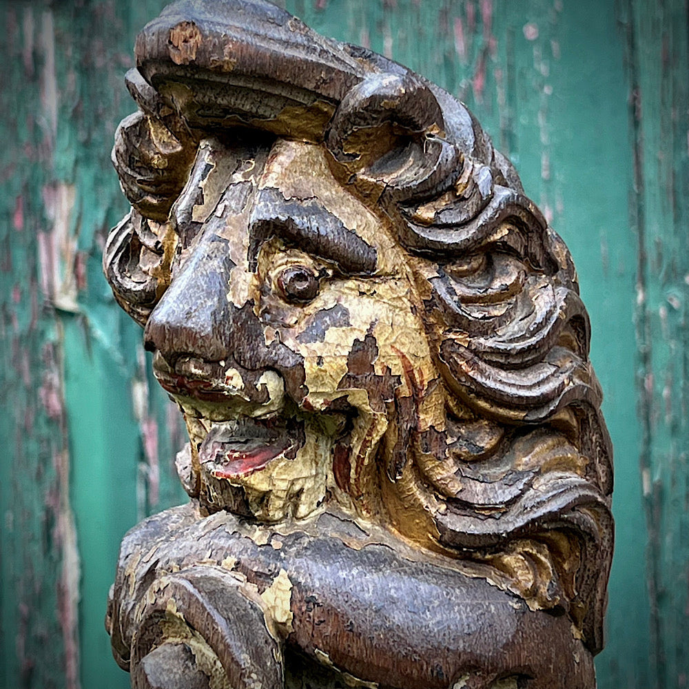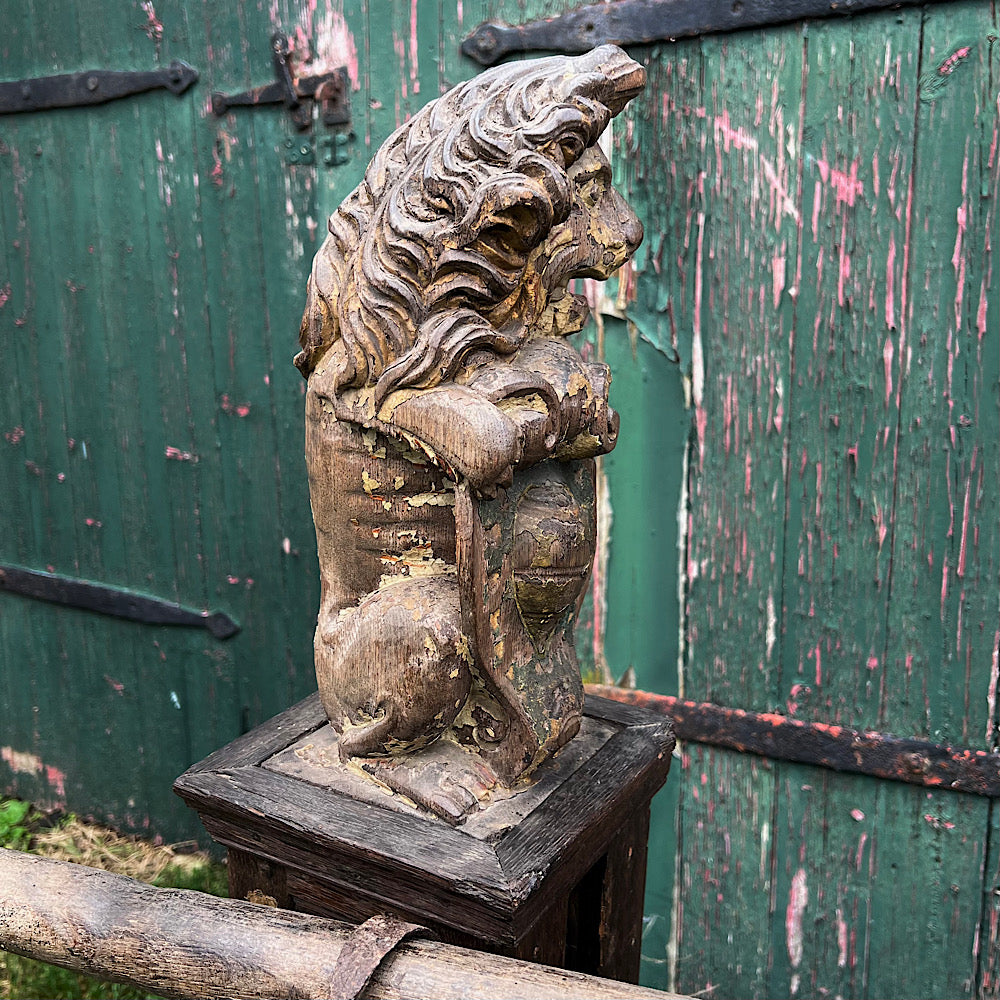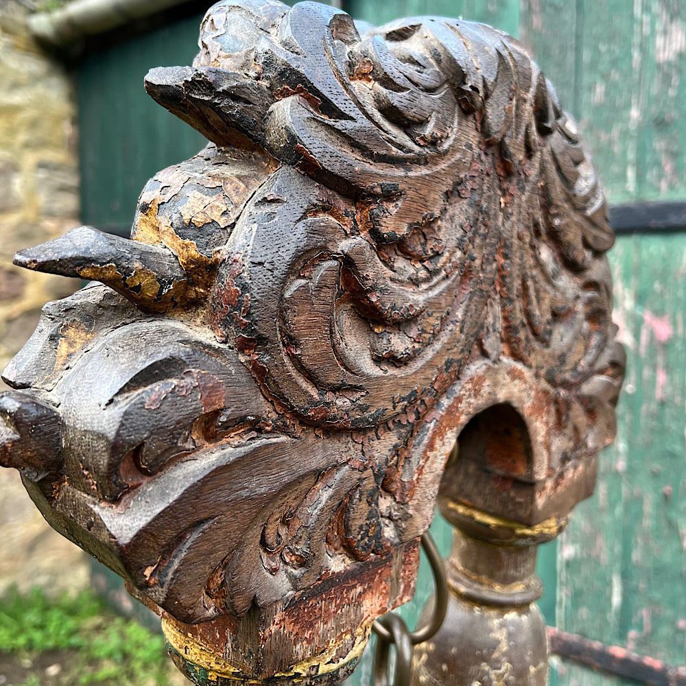 This wonderful Cheese Press originates from Frisia, the Northern Netherlands. The base is a single plank mounted on sledge feet. Each end of the press is flanked by turned wood uprights, highly decorated and polychromed with folk art references from the area. At the back of the press we can find a wonderfully carved Lion sejant clasping a coat of arms, much of his polychrome still remains. To the front of the press is an abundantly carved ornate naturalistic pediment, featuring birds, flowers and cherubs in gilt and polychromed gesso.