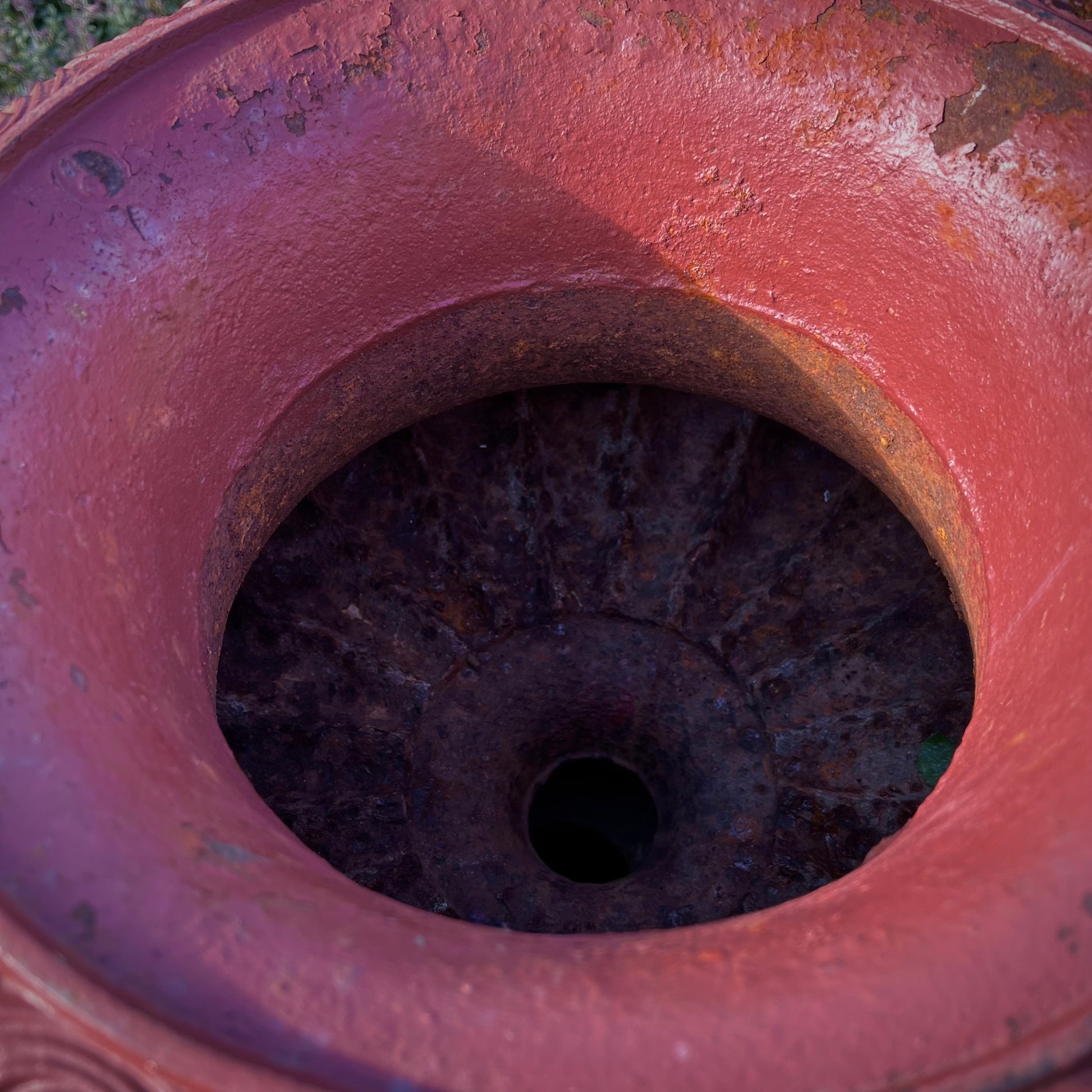 Cast in solid iron and retaining an older painted surface in deep red, the urns follow 19th-century classical revival designs, reflecting the continued taste for architectural ornament in English gardens well into the 20th century. Their surface finish has weathered attractively, giving a warm patina and a quiet, sculptural character suited to both traditional and contemporary settings.