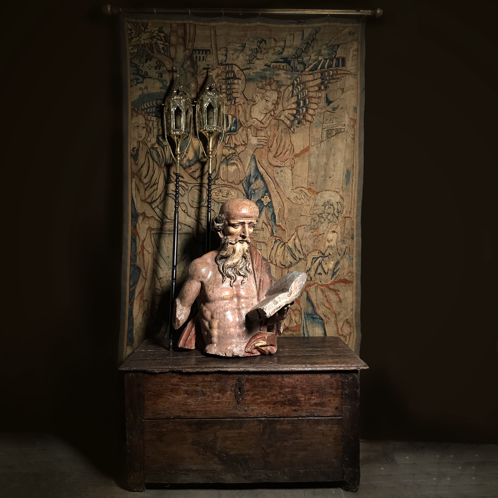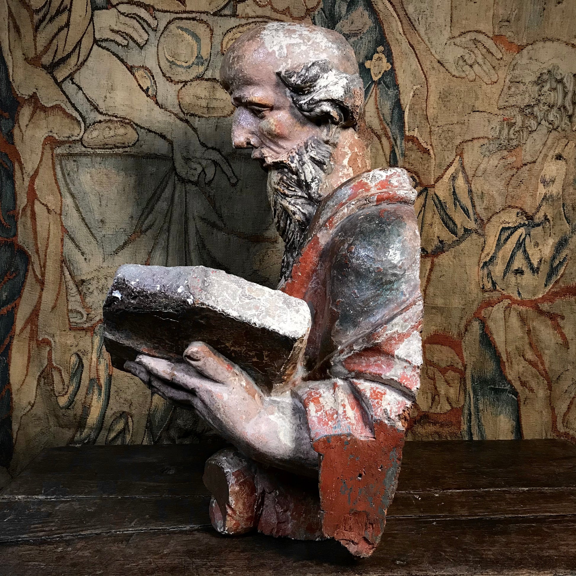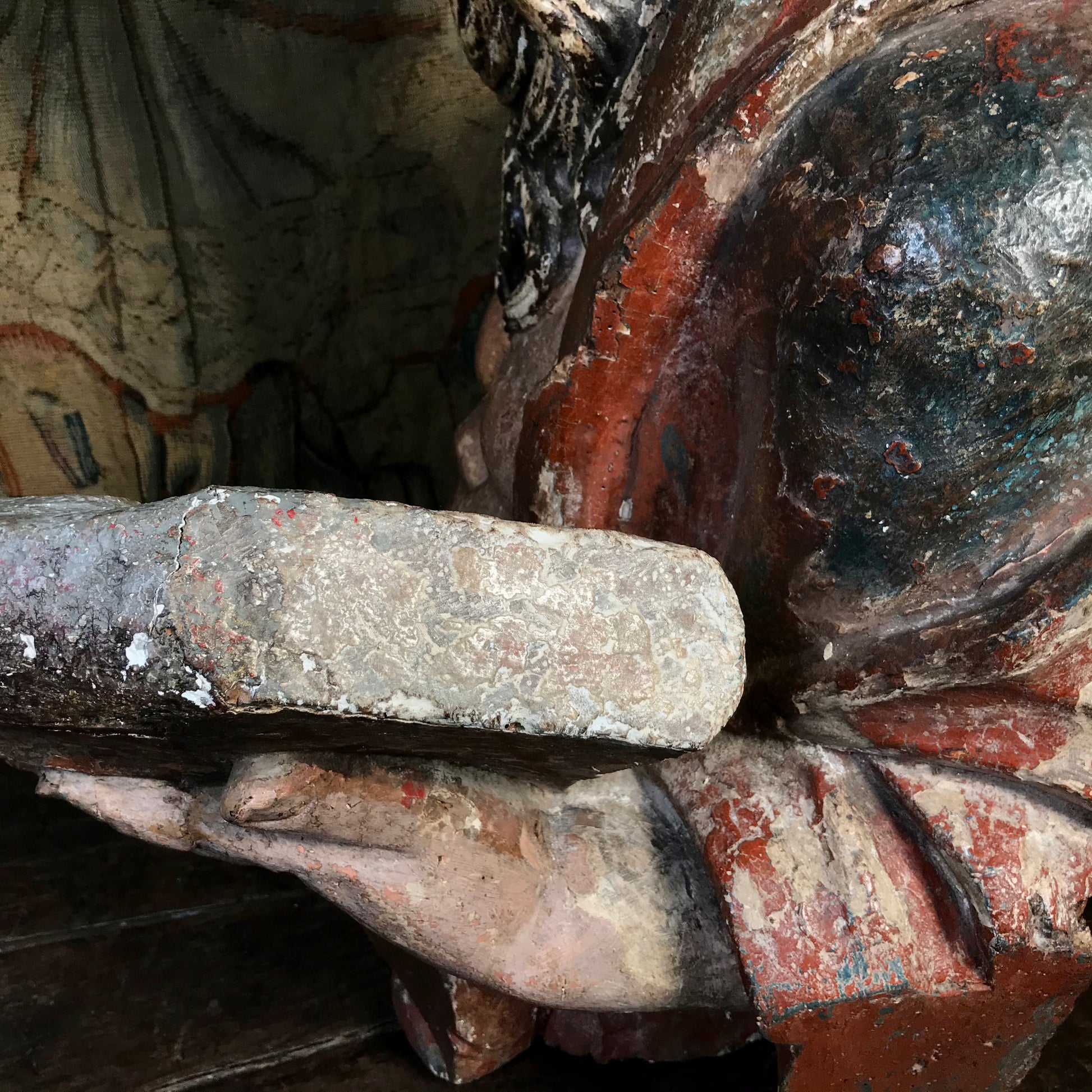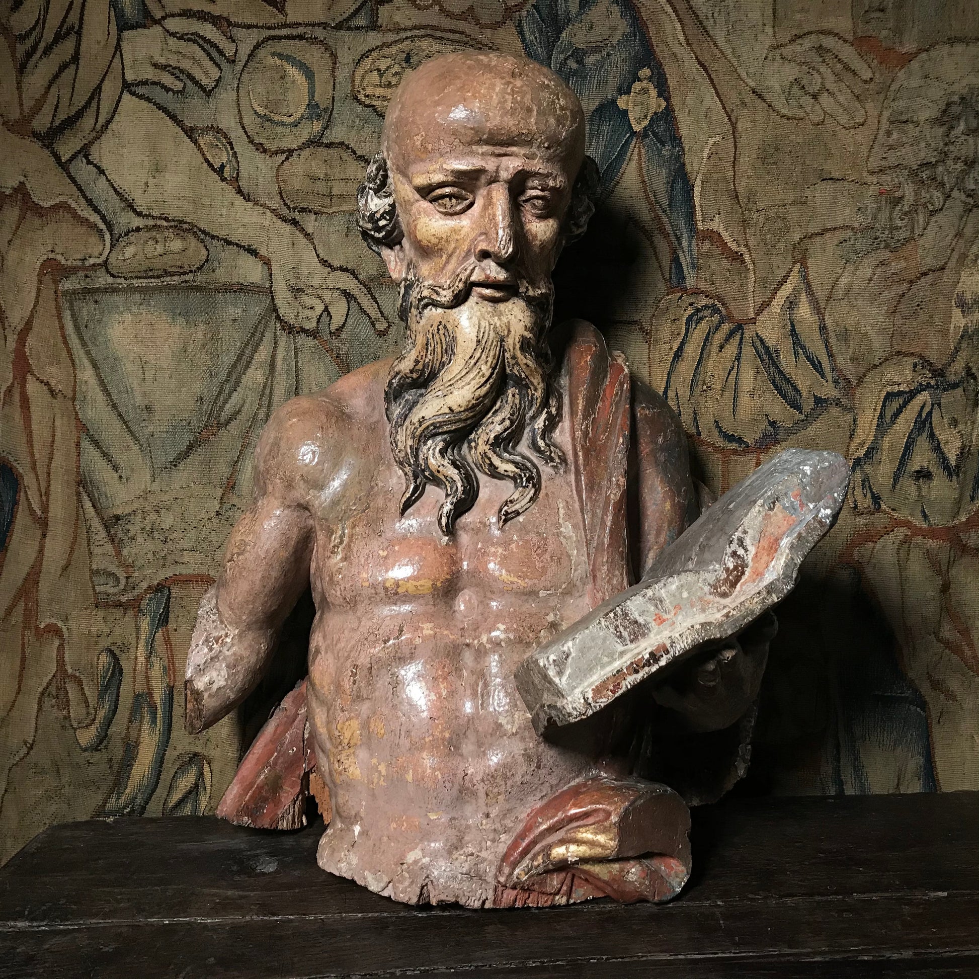 Carved and wonderfully polychromed, he is a dramatic and wondrous figure.