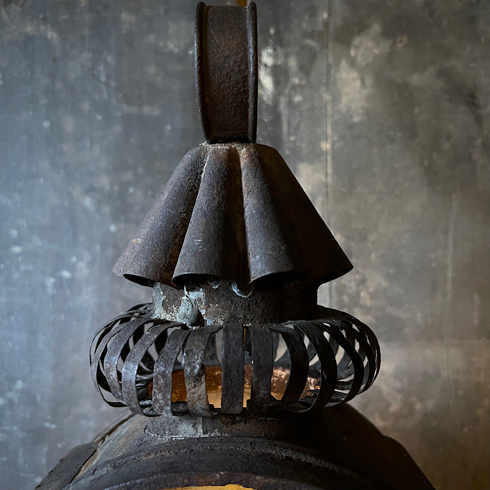 Both sides of the drum shaped lantern are glazed, the sides have small pierced vents. The lantern is surmounted by an unusual chimney of sculpted bulge form and a conical fluted hat and handle.