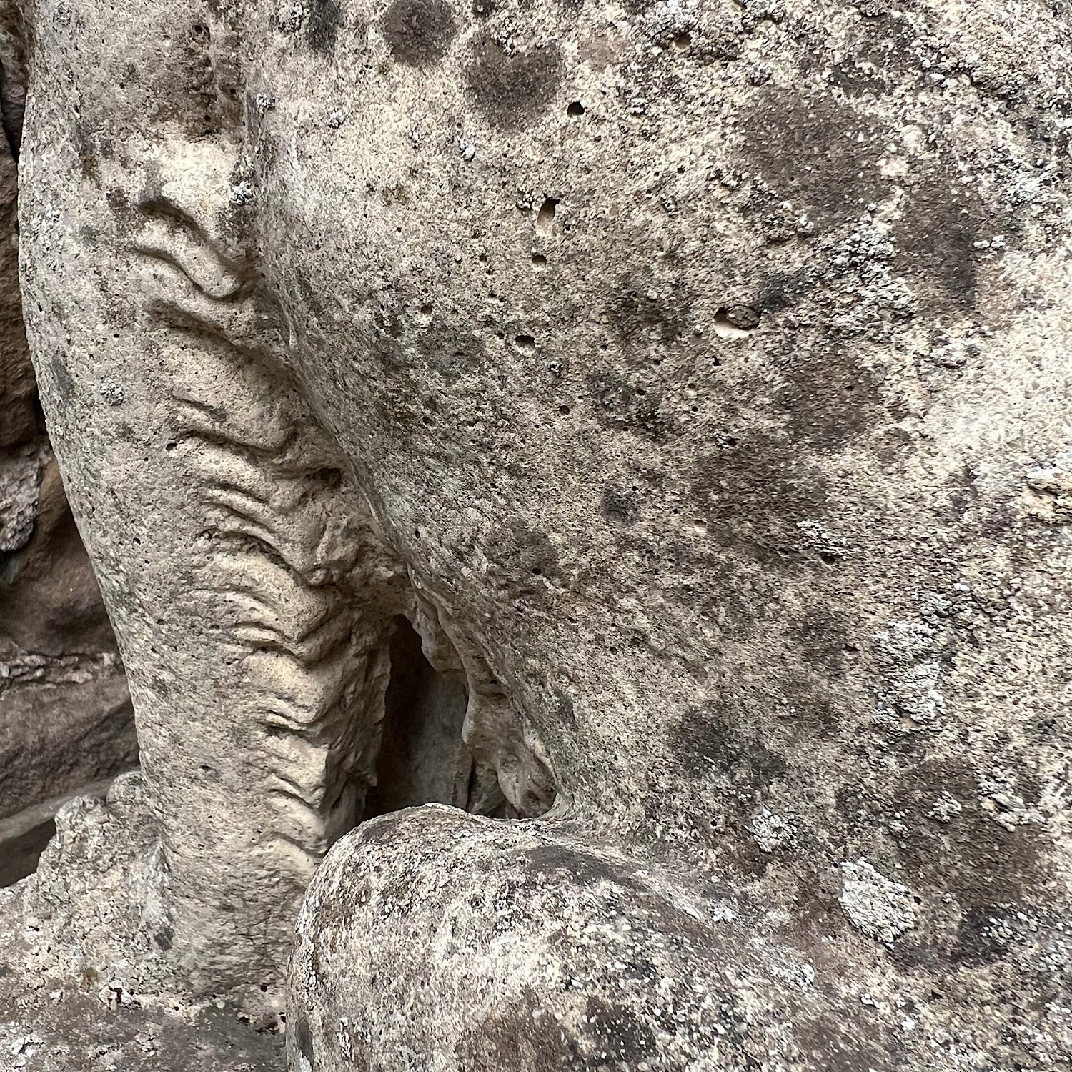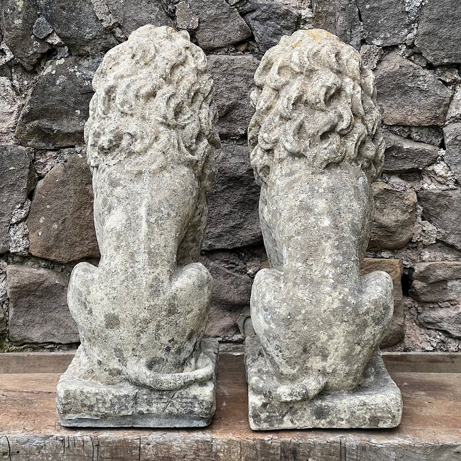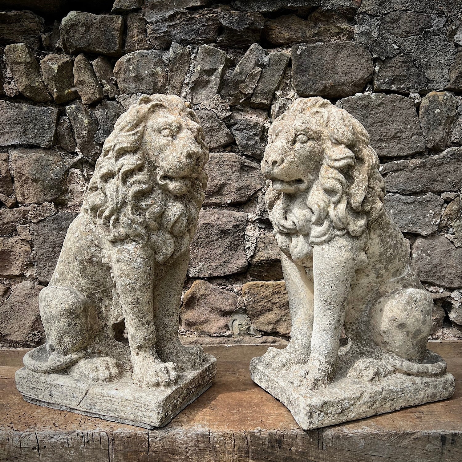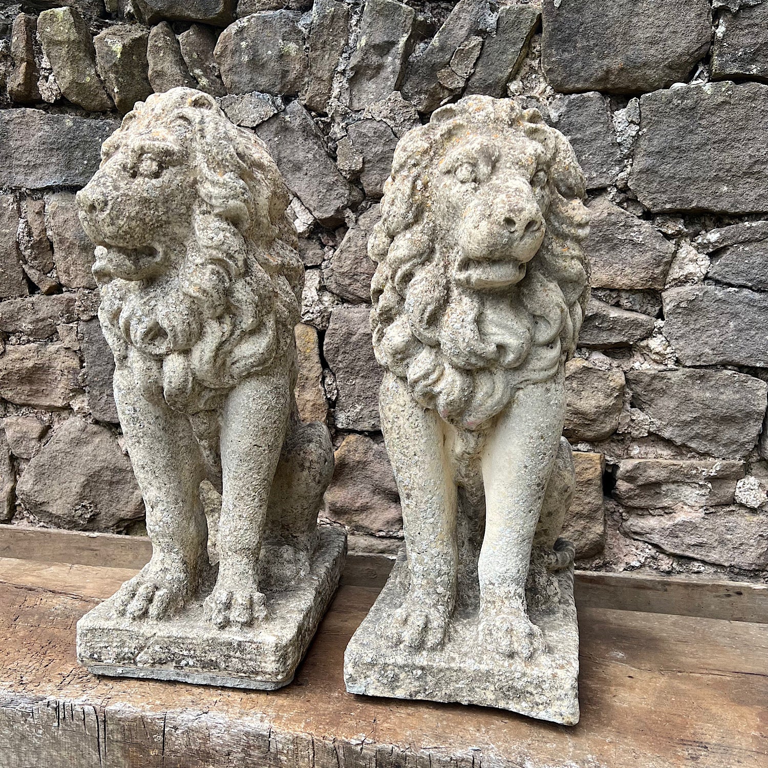 A pair of charming stone composite Lions created mid 20th Century.